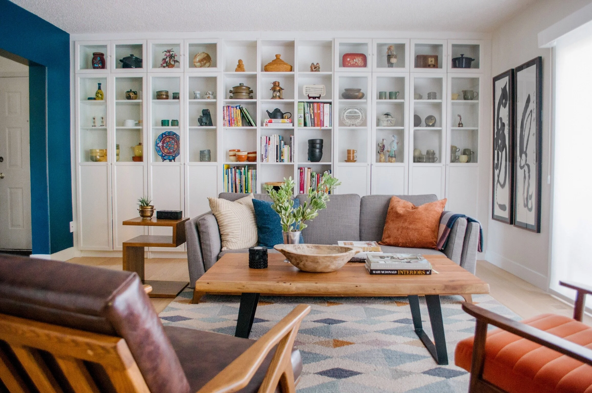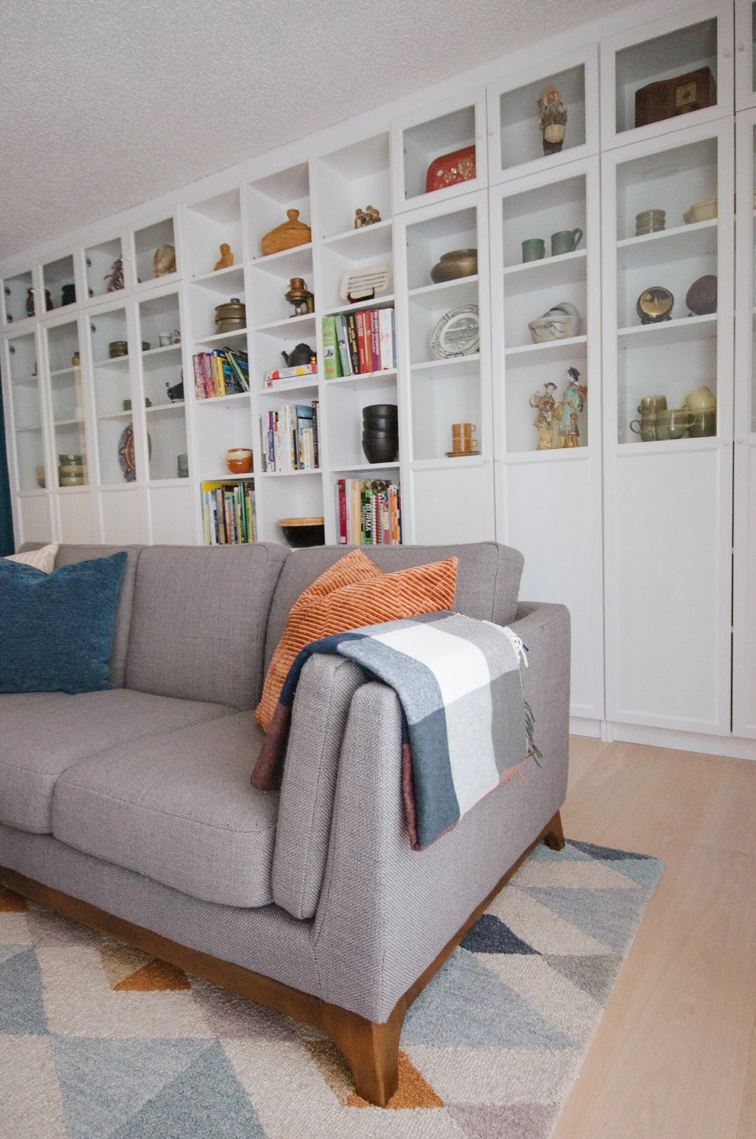 The goal for this space was to create a family room with a dual function - space for homework and space for relaxing and entertaining. It had to feel inviting, incorporate colour, and work with the era of the home (1950s). Storage was so important (as you’ll see from the before photos) and the size of the desk had to be able to accommodate both kids doing homework at the same time. The family room was large enough that we could accommodate both a seating area and desk area.