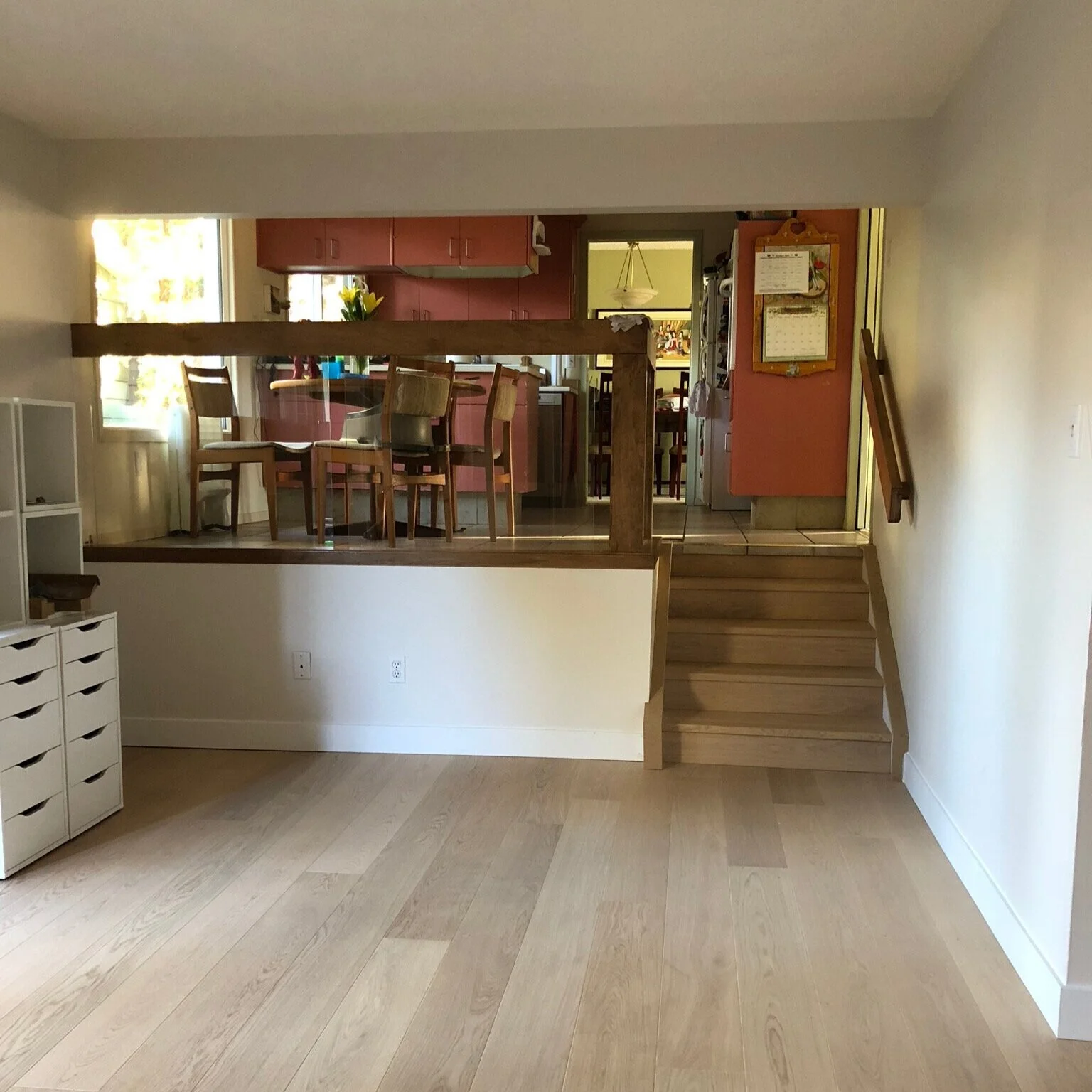 Flooring was next. The old carpet was replaced by beautiful white oak hardwood. The space was instantly transformed when the flooring went in! I mean, this flooring is just gorgeous! And of course, a fresh coat of paint was applied to the walls and new trim installed to further freshen up the look of the space.