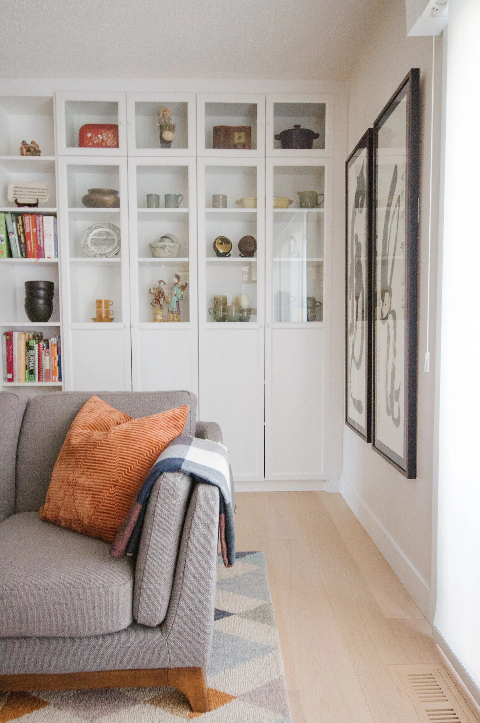 In order to achieve a more custom look we used Billy bookcases and doors but then framed it in and painted the trim to match.