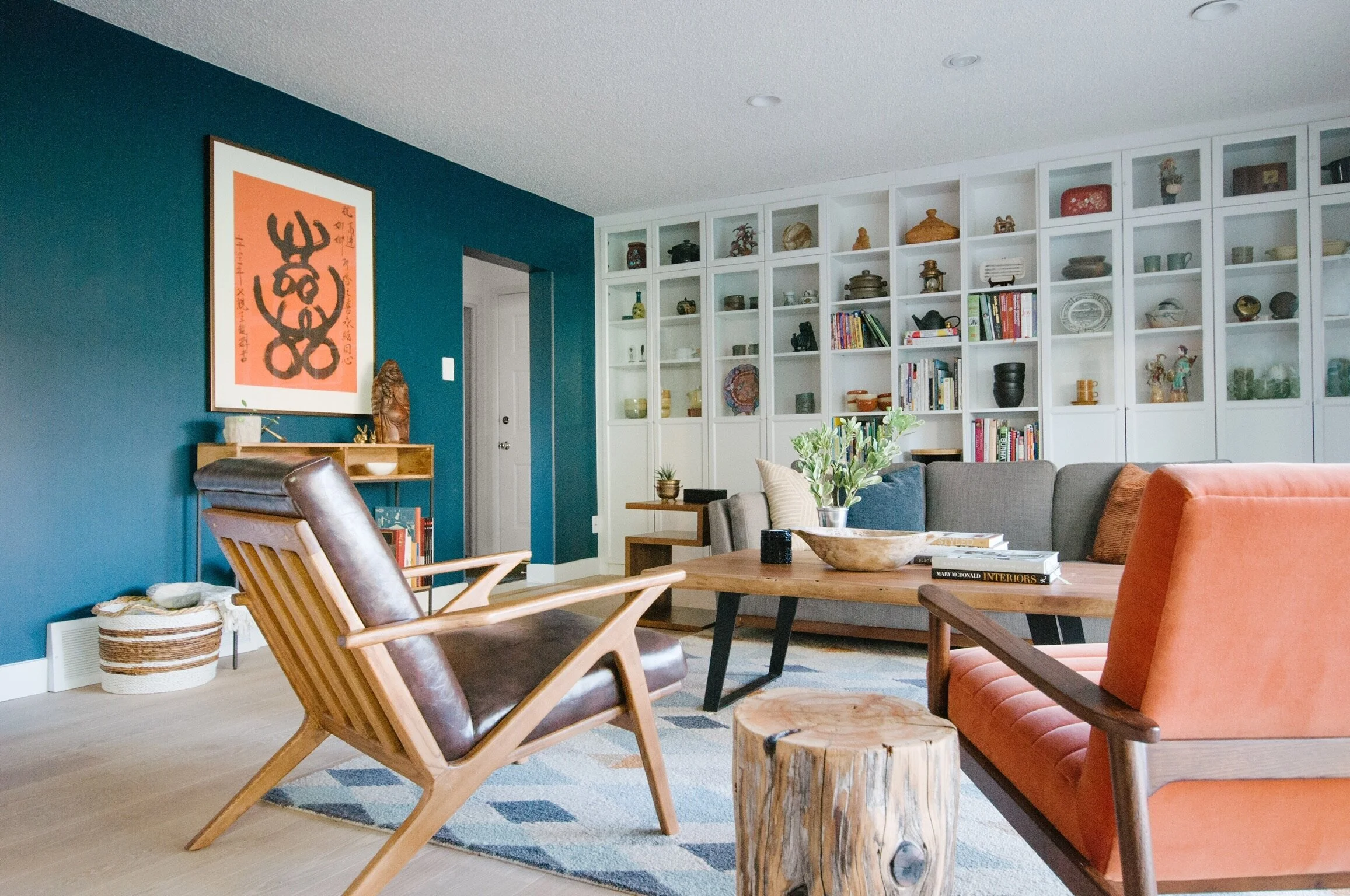 At first, the homeowners weren’t sure if it really went with the space or if it should stay. But it was given a fresh look with a new frame and mat and set the tone for the overall decor scheme. The feature wall in the bold dark teal blue helps to balance the wall of shelving as well as the large patio doors.