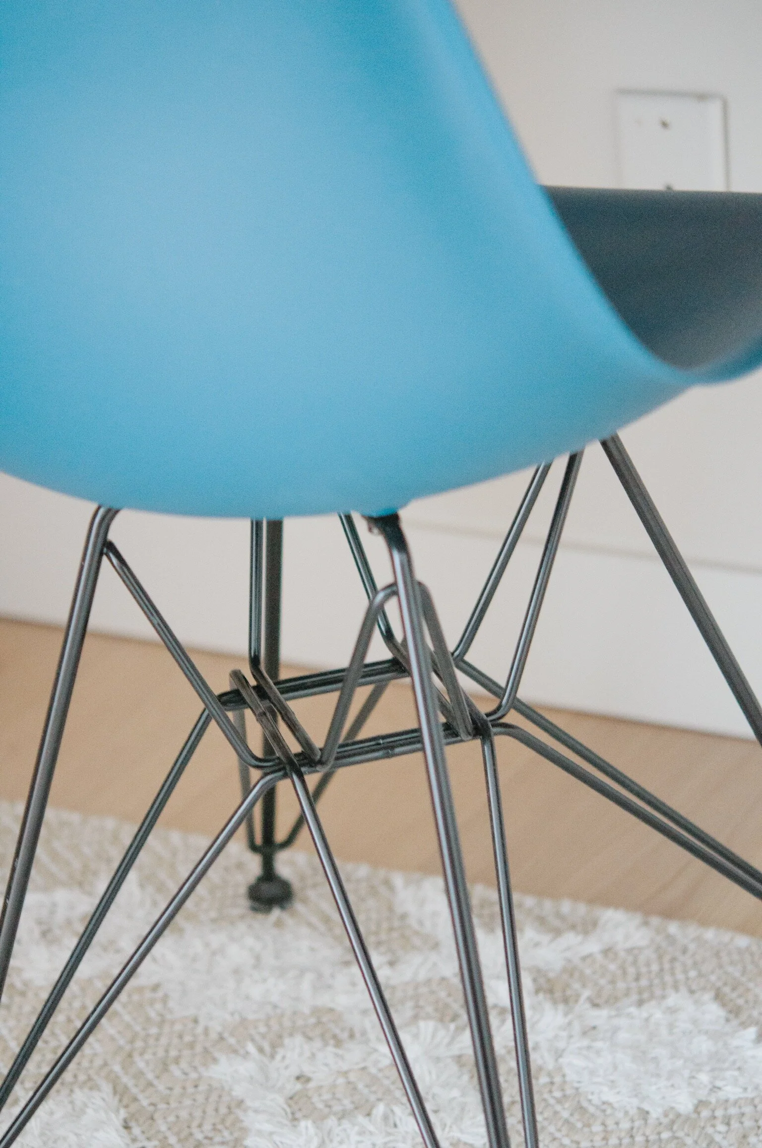 The desk is supported by a hidden piano hinge in addition to the drawer unit and the single hairpin leg. To continue on with the use of the deep teal, two Eames chairs were chosen in Peacock Blue to accent the space.
