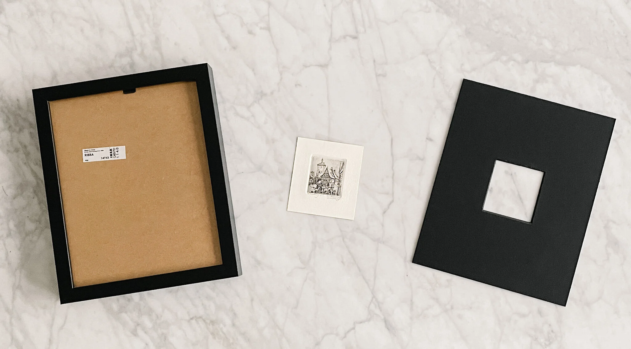 I recommend this hack when you’re wanting to get a custom look for pieces of art or photographs that don’t need professional framing. So maybe you have an odd-shaped print that you want to frame but it doesn’t fit a standard off-the-shelf frame. Or it’s a collection of photographs or postcards that you want a custom look for but can’t afford to go custom.