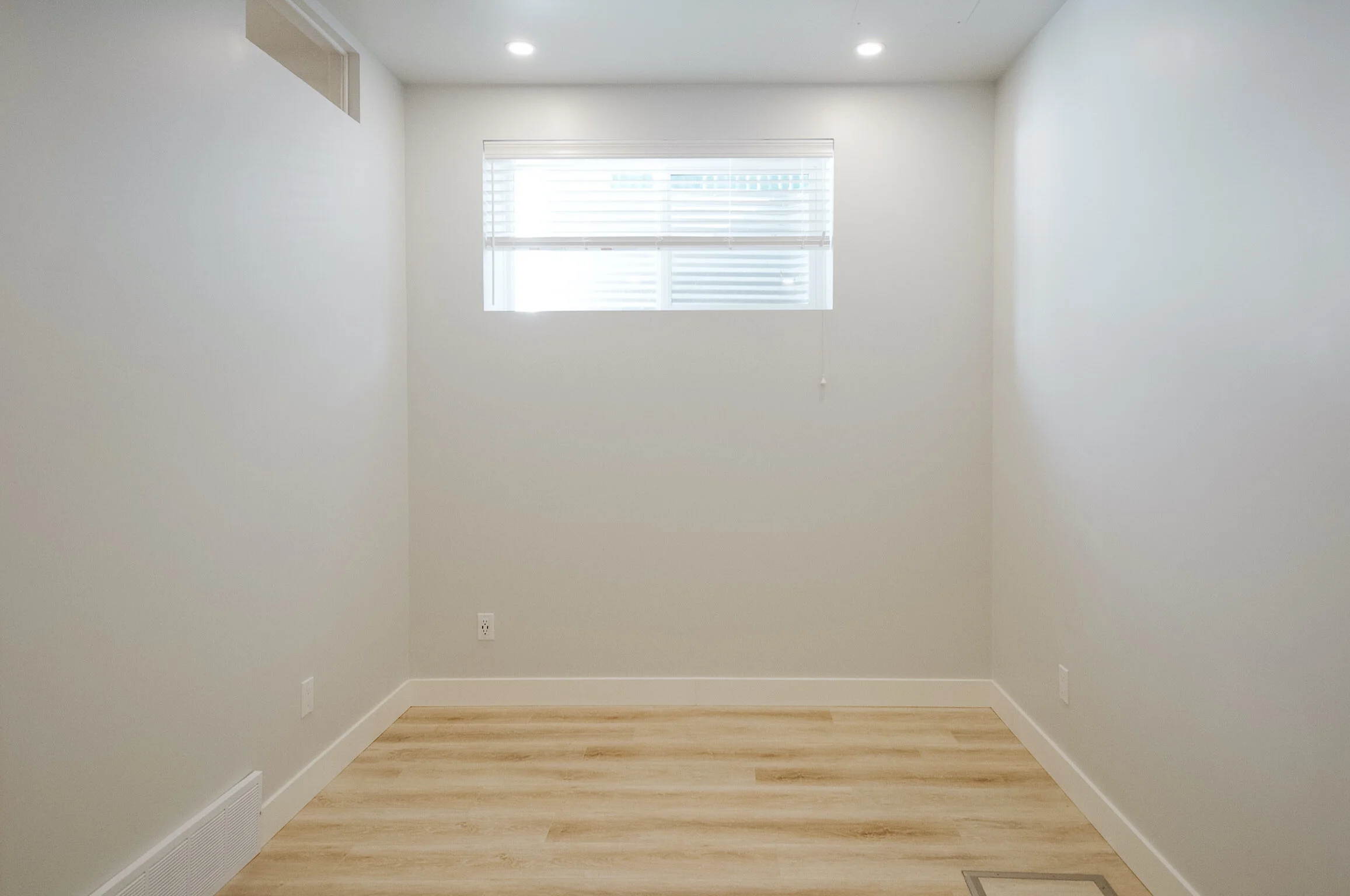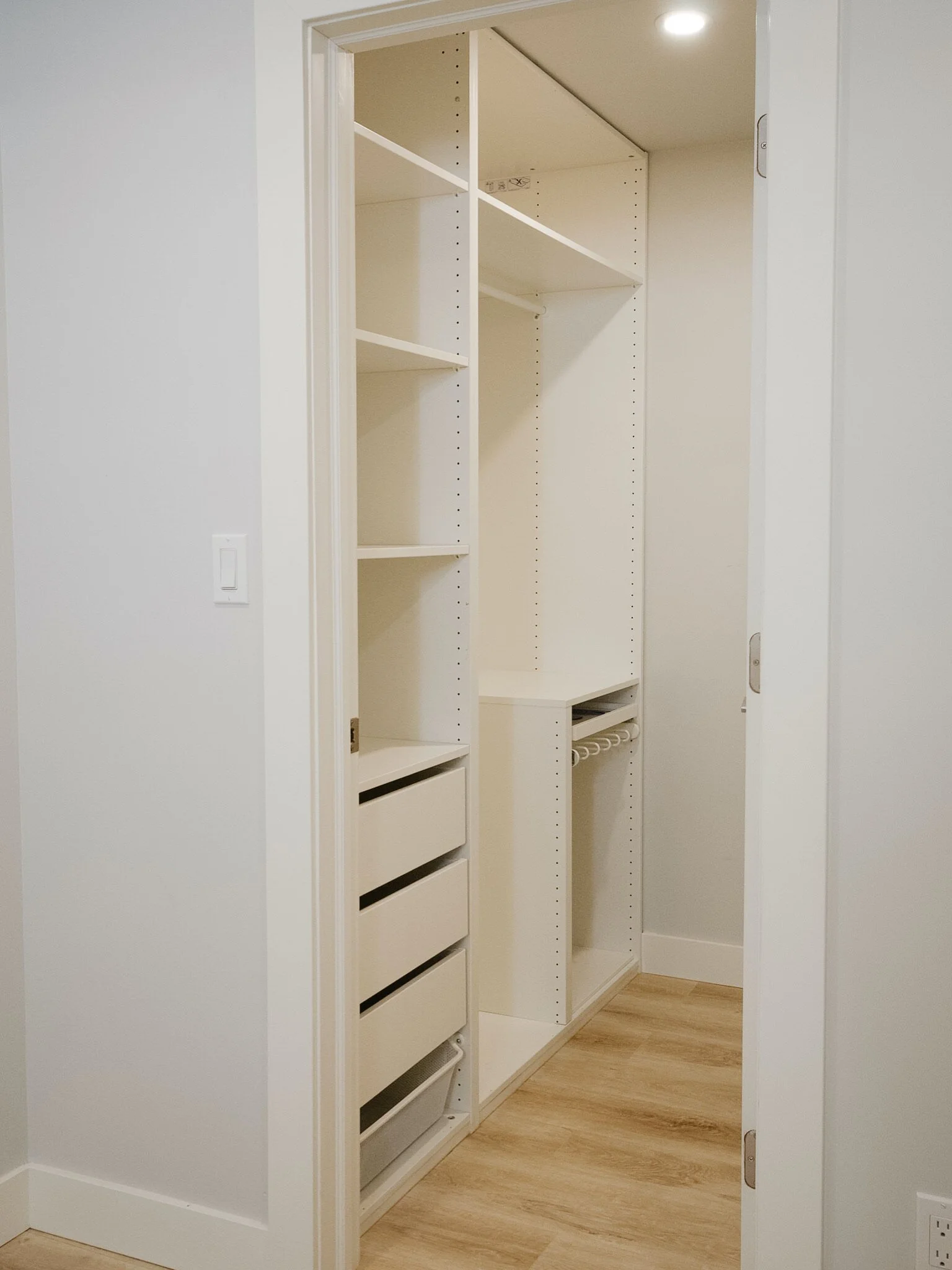 Finally, the bedroom. Since this is the only room with natural light, we added the internal window into the kitchen to draw some of that natural light into the main space. The bedroom easily fits a queen bed, two nightstands and even a dresser. We made the walk in closet extra functional by framing it to fit PAX wardrobes. The backwater valve access is in the bedroom, unfortunately, but we made a custom cover for it using the luxury vinyl plank flooring and some transition strips so that it isn’t obtrusive.