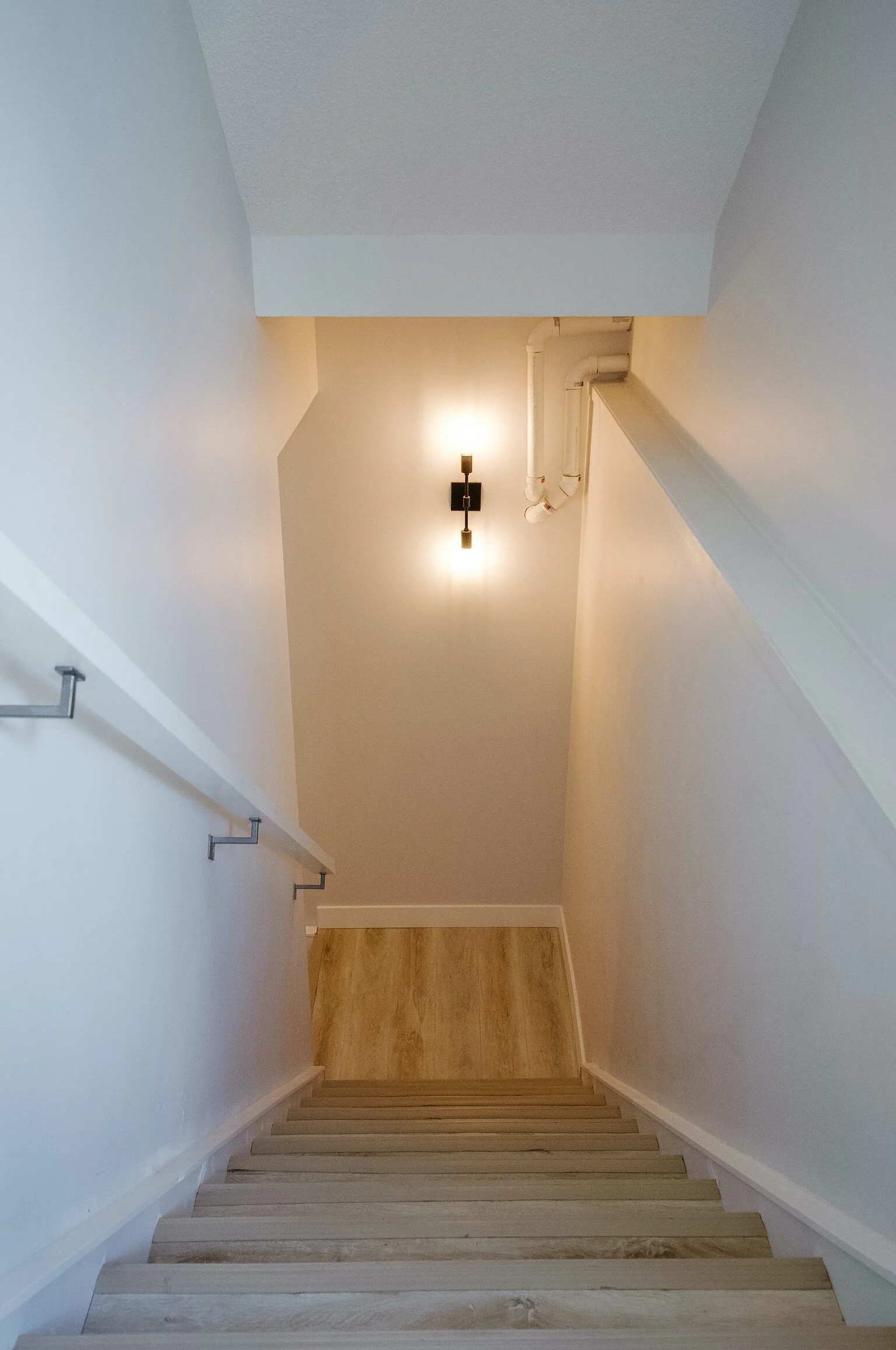 The suite is accessed through a separate entrance at the side of the house. While I don’t love that the builder left the pipes exposed, we decided it wasn’t worth it to frame them in. We did have to frame in another section where ducting was left exposed which took priority. The luxury vinyl plank flooring was used on the stairs with vinyl nosing for extra durability.