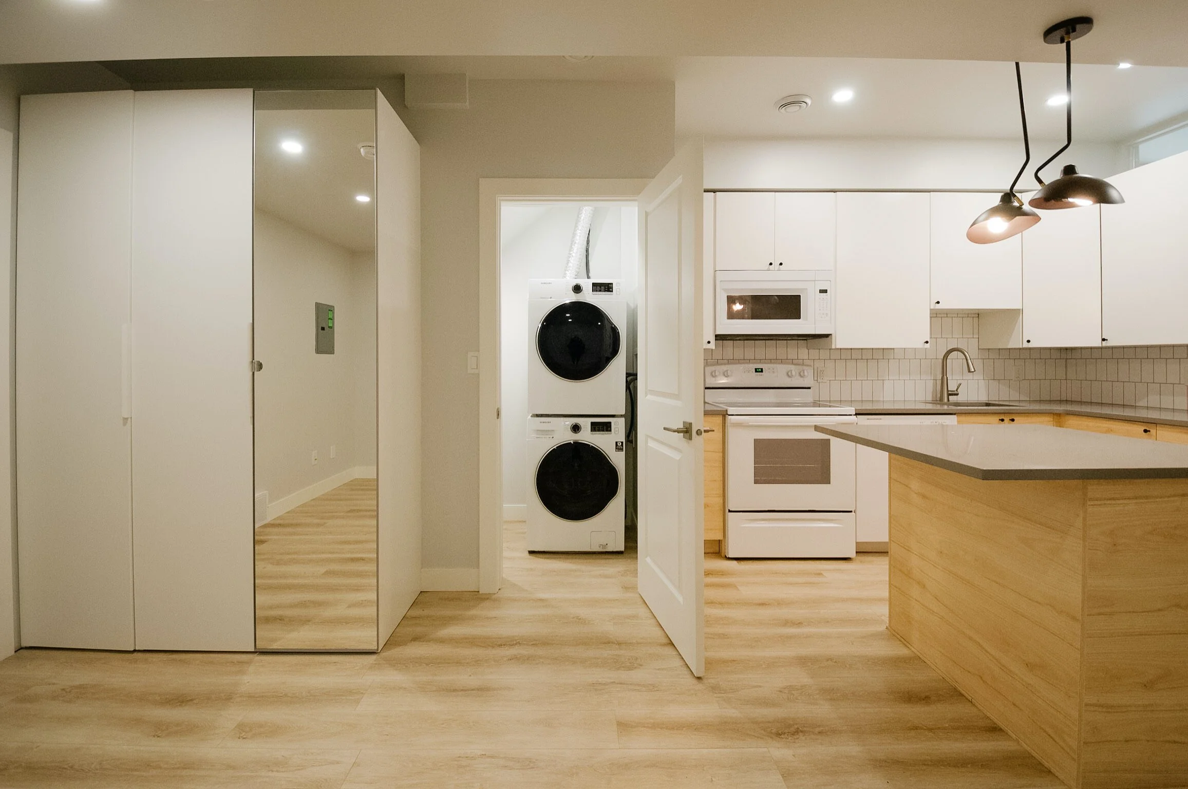 We ended up deviating somewhat from the original drawings and plans from the builder / architect. My philosophy when it comes to rental suites is that the more value you can provide your tenants, the better tenants you’re going to attract. In that interest, one of the first changes we made was to move the laundry into the suite instead of leaving it in the “shared space” of the mechanical room. I believe another benefit of this arrangement is that most landlords who are in a shared space don’t want to allow access to their own home’s main systems. As such, we also moved the main electrical panel into the mechanical room (it was originally placed in what would be the basement bedroom). This meant the mechanical room could stay as a private space accessible only to the homeowners, and the tenants wouldn’t have to leave their suite as the laundry was now tucked away under the stairs.