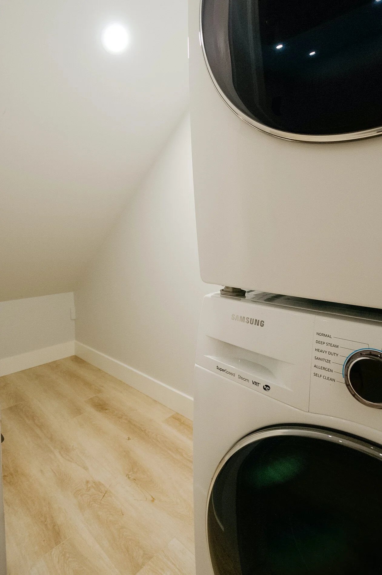 I always recommend adding laundry to your rental suites. It makes them so much more attractive to potential tenants. And with an apartment-sized, stackable set, you really don’t need that much room at all! We tucked it under the stairs and finished the rest of the space to create additional storage for tenants.