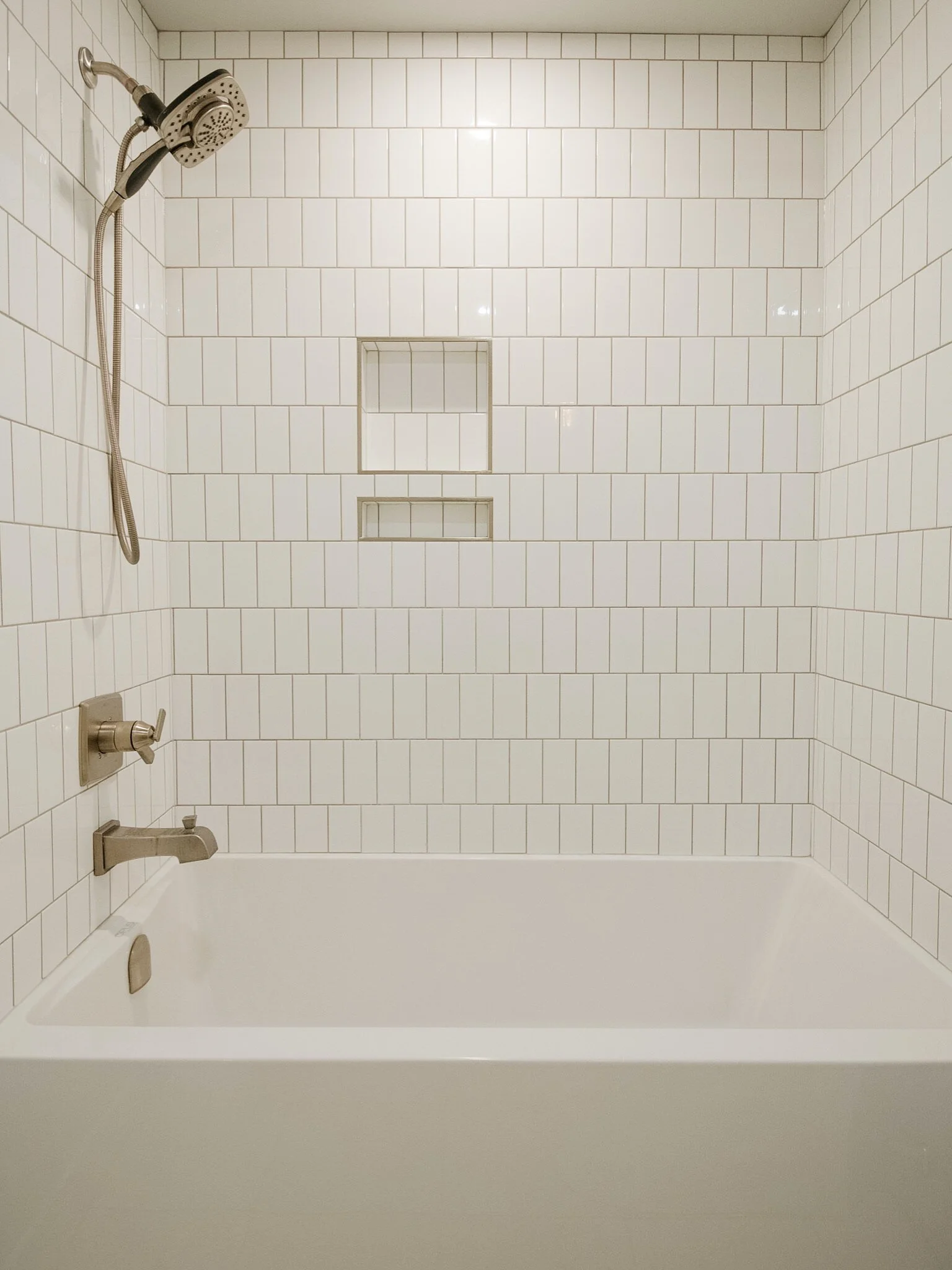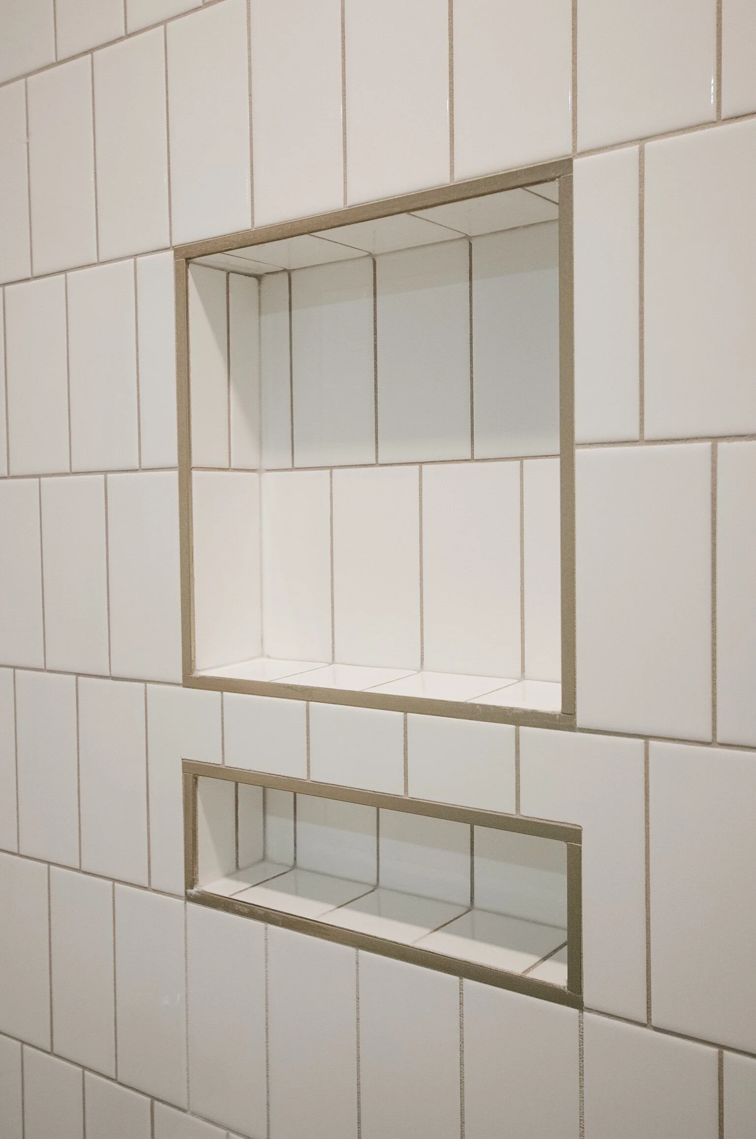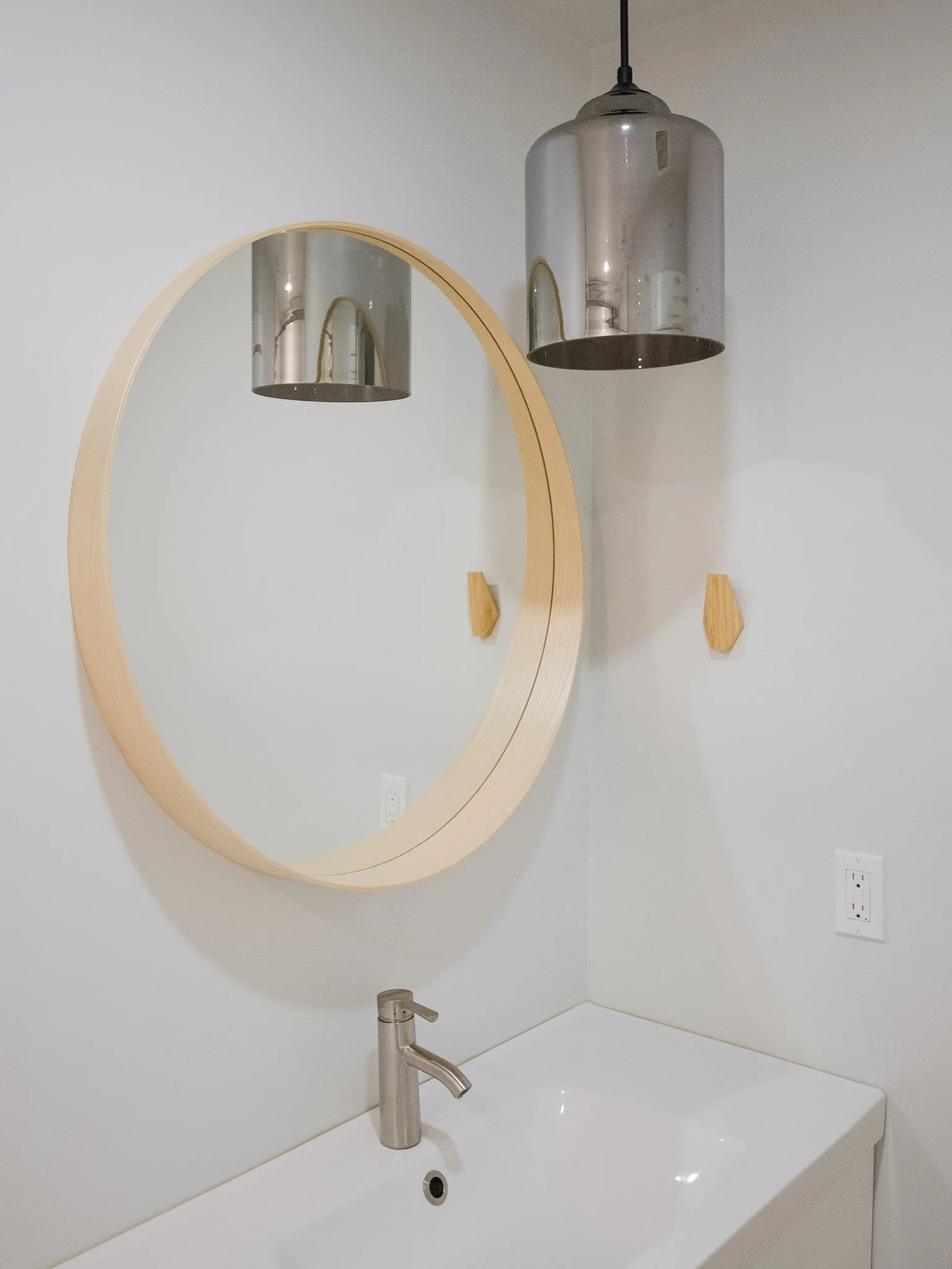 The bathroom features a tiled tub / shower combo and a statement pendant. I also love using IKEA bathroom vanities because they really maximize storage space (and are cost effective!). We added oak legs for a bit of extra flair but also for more stability to reduce any issues resulting from wear and tear. As I mentioned, doing a tiled shower surround is that extra bit of luxury - especially with the built in niche. Using subway tile keeps it classic, while the vertical brick pattern keeps it unique. The oak detail is further tied in through the mirror and the unique towel hooks.