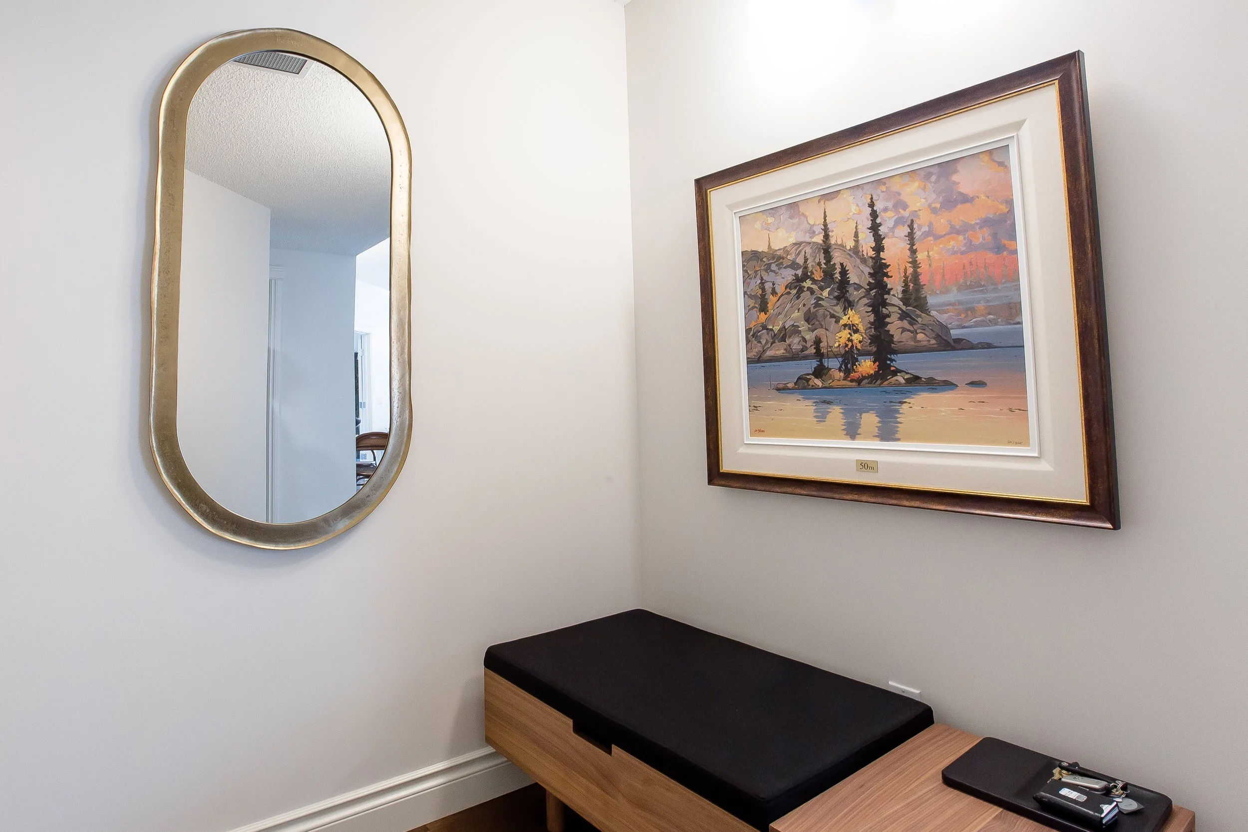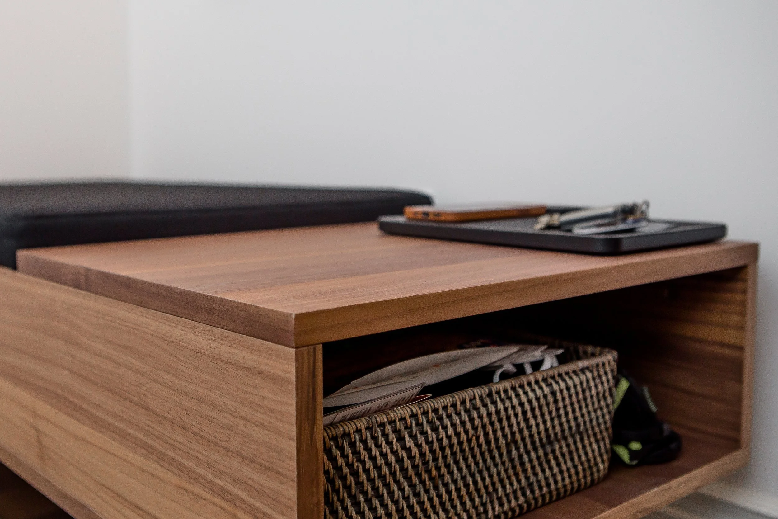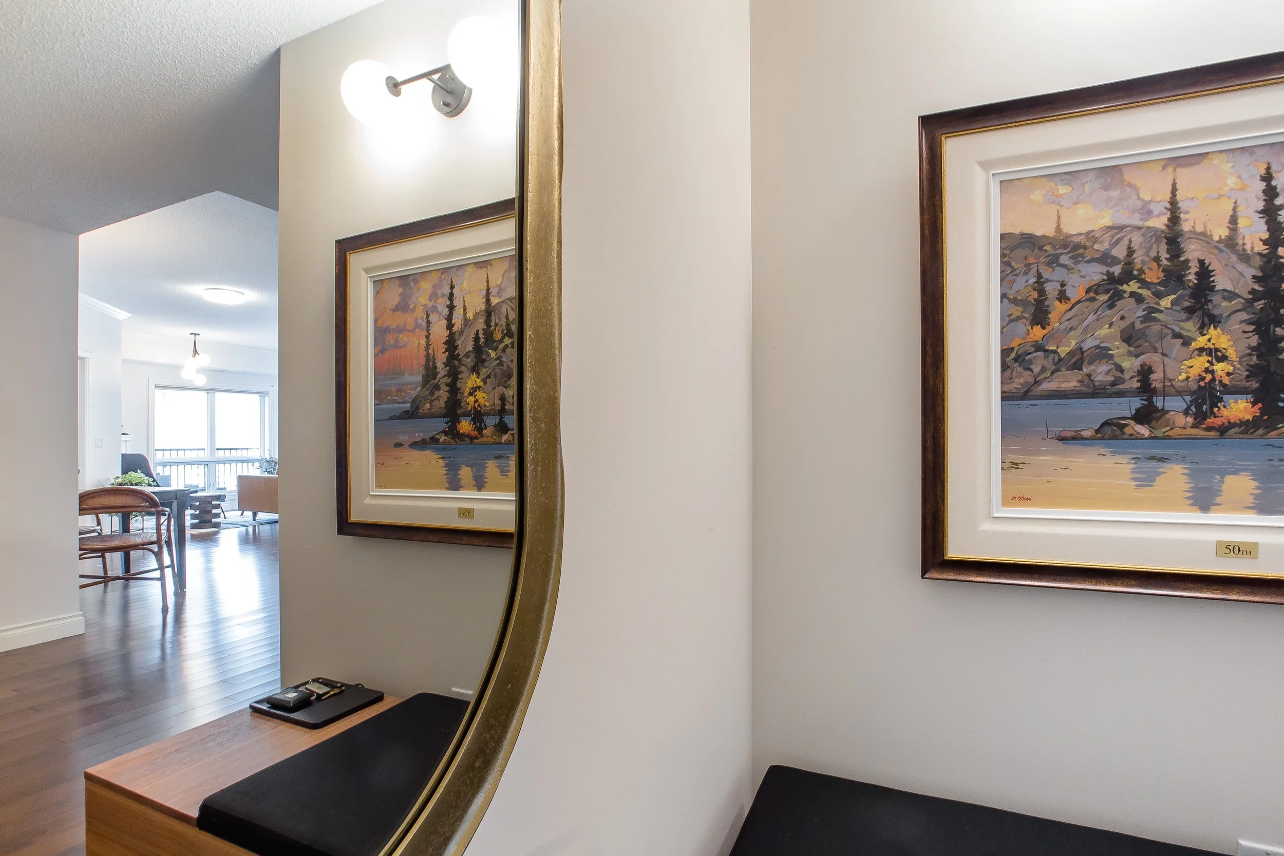 When entering the space, you’re greeted by a stunning bench (with storage), a great mirror and one of my client’s pieces from his own art collection. We added a charging station / drop zone for his keys, wallet and phone.