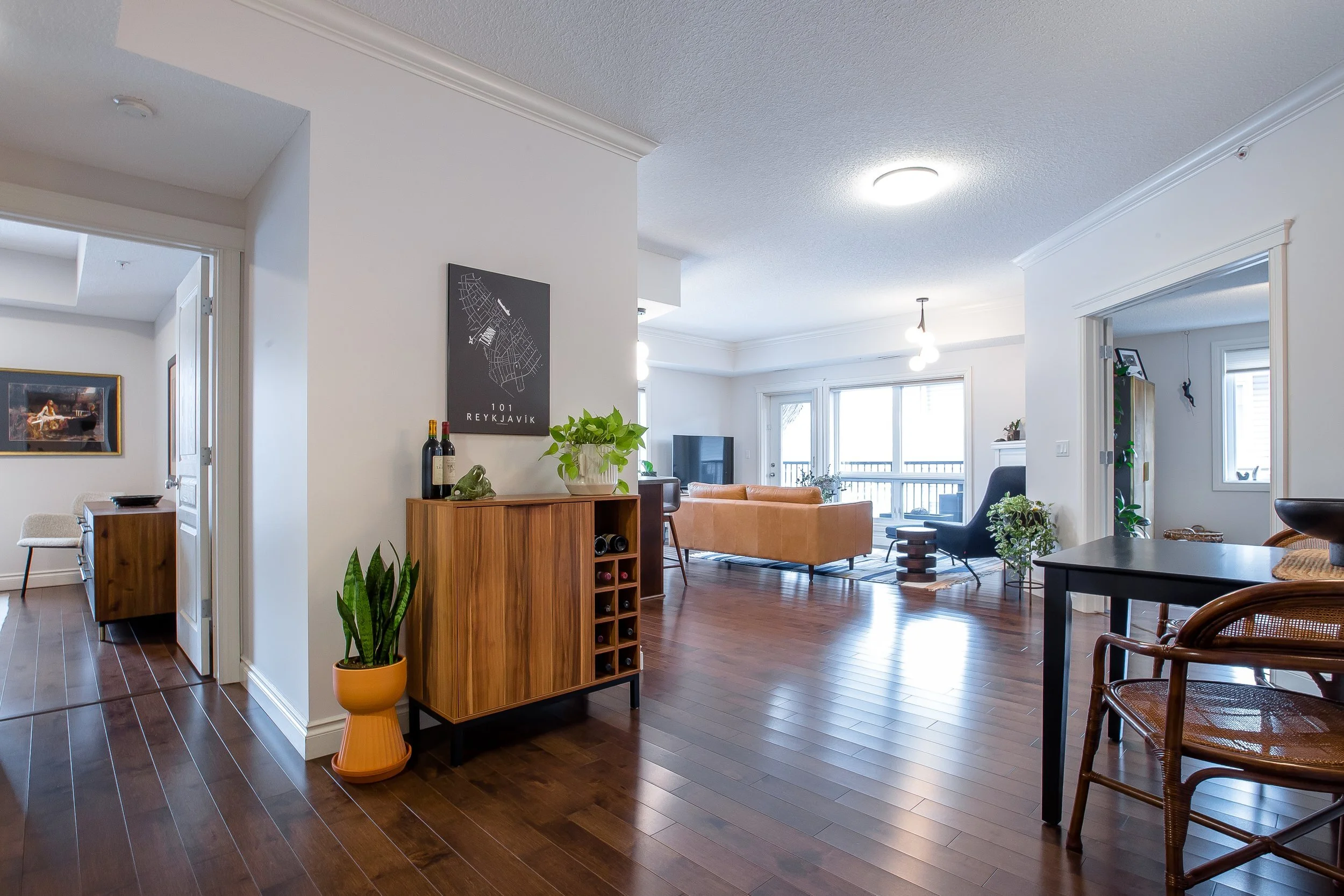 As you step further into the unit, you are met with a few transitional spaces: a hallway towards the primary bedroom on the left, the main pathway into the living areas straight ahead, and another hallway towards the laundry and secondary bedroom on the right. It was really important to my client that we kept the space open and airy without a lot of clutter.