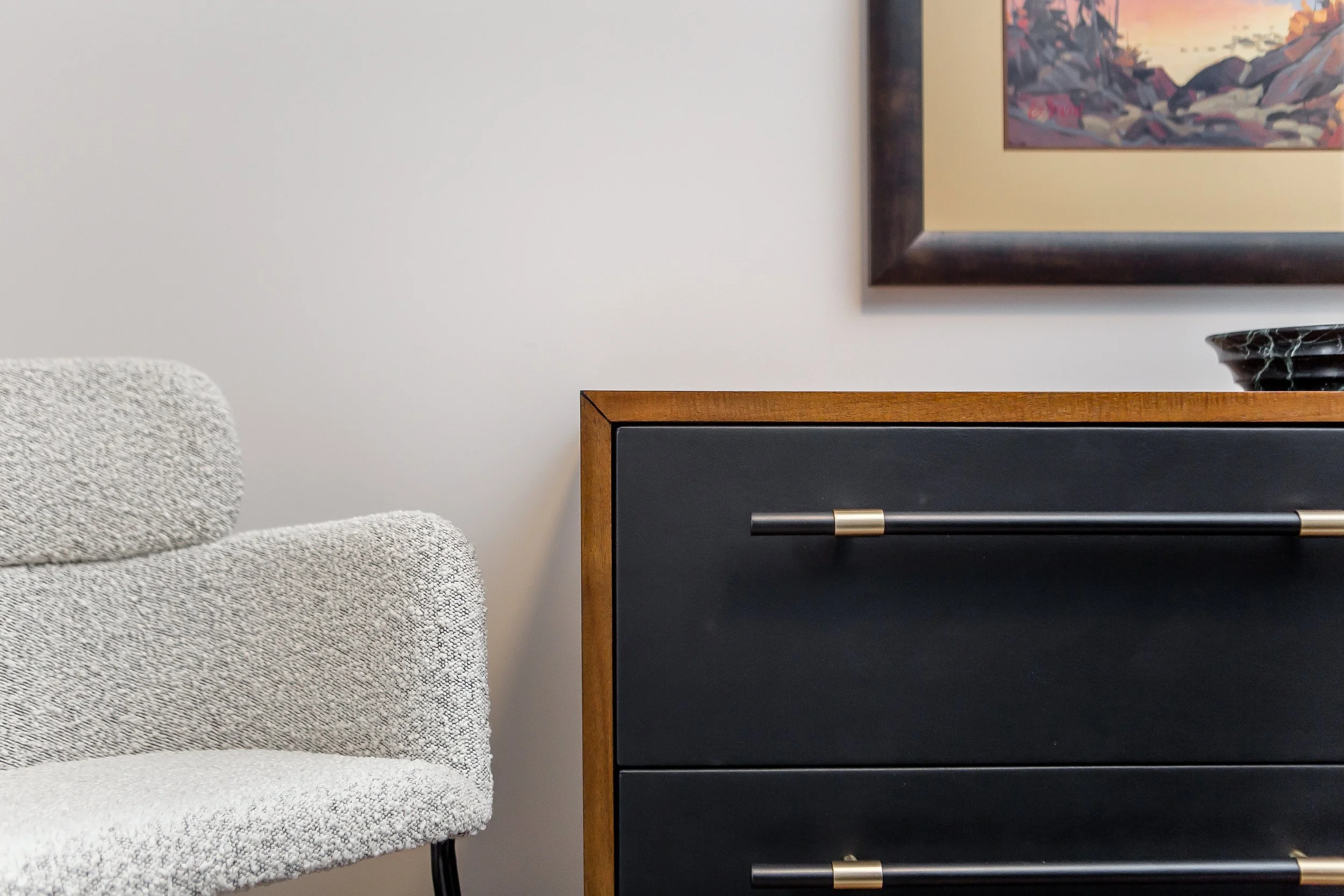 My client on this project really leaned into the process, and enjoyed discovering and learning about his own style as we created a home that will support his new life. Not only was this a new space for him, but the condo was actually a furnished rental, so even the furniture wasn’t personal to the client. However the landlord thankfully was open to allowing my client to replace the existing furniture with his own, and even supported us in having the space painted and allowing my client to also install new light fixtures. These changes made a big impact on the space and I’m excited to show you all the details! It’s very rare to find a landlord who is happy to let the renters make so many changes; believe me, we know how lucky we were that this was the case.