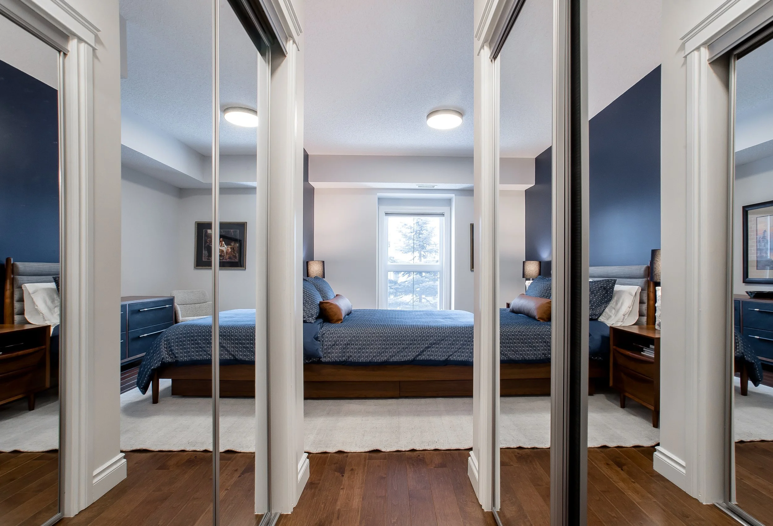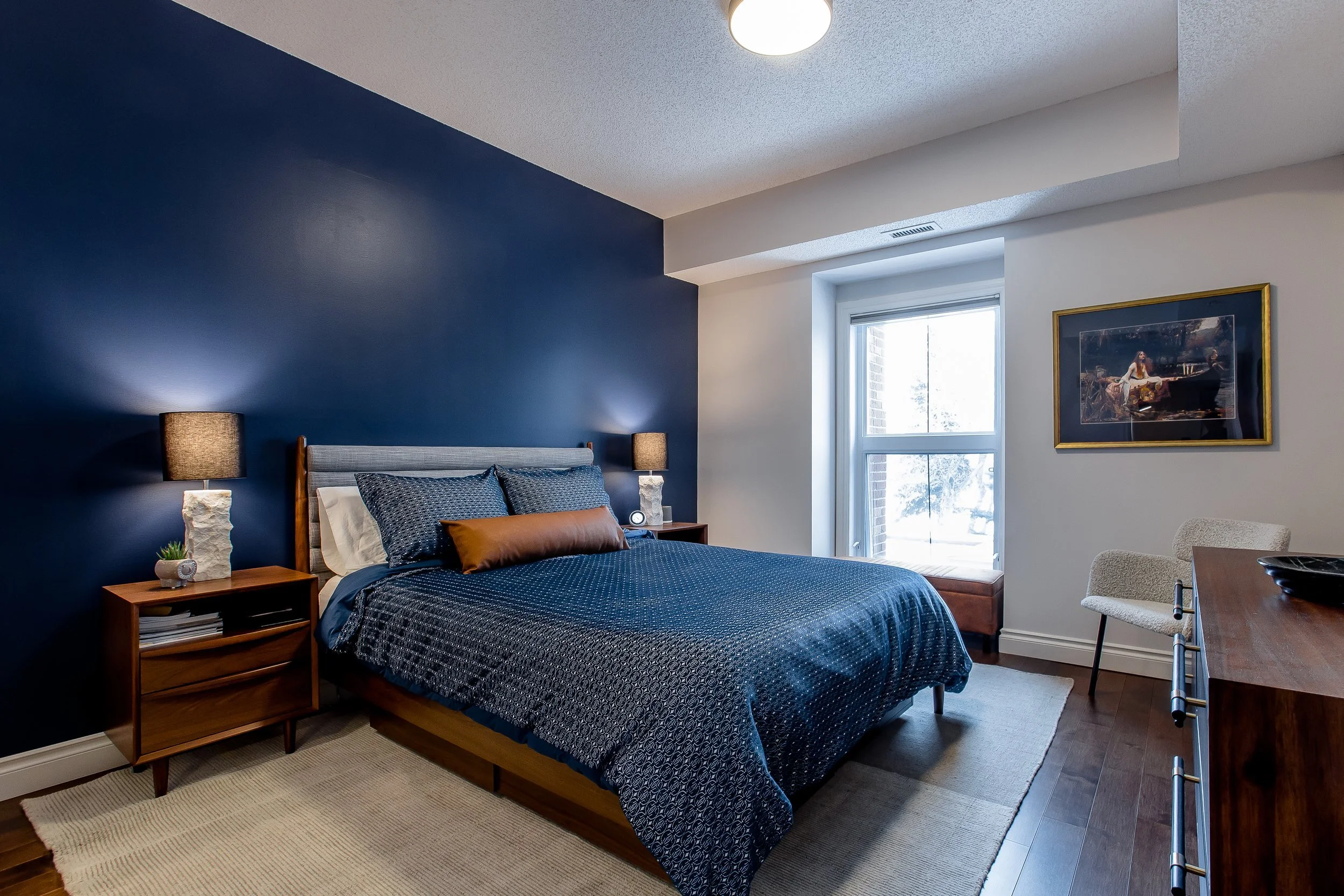 As mentioned, the landlord was open to doing some updates. We ended up extending the hardwood into the bedrooms and den, with a bright off-white on the walls, and one bold feature wall in the bedroom. While we don’t often get to advise on some of the smaller elements, in this project we also did selections for dishes, cutlery, glassware, small appliances and more. The fun of starting again from scratch!