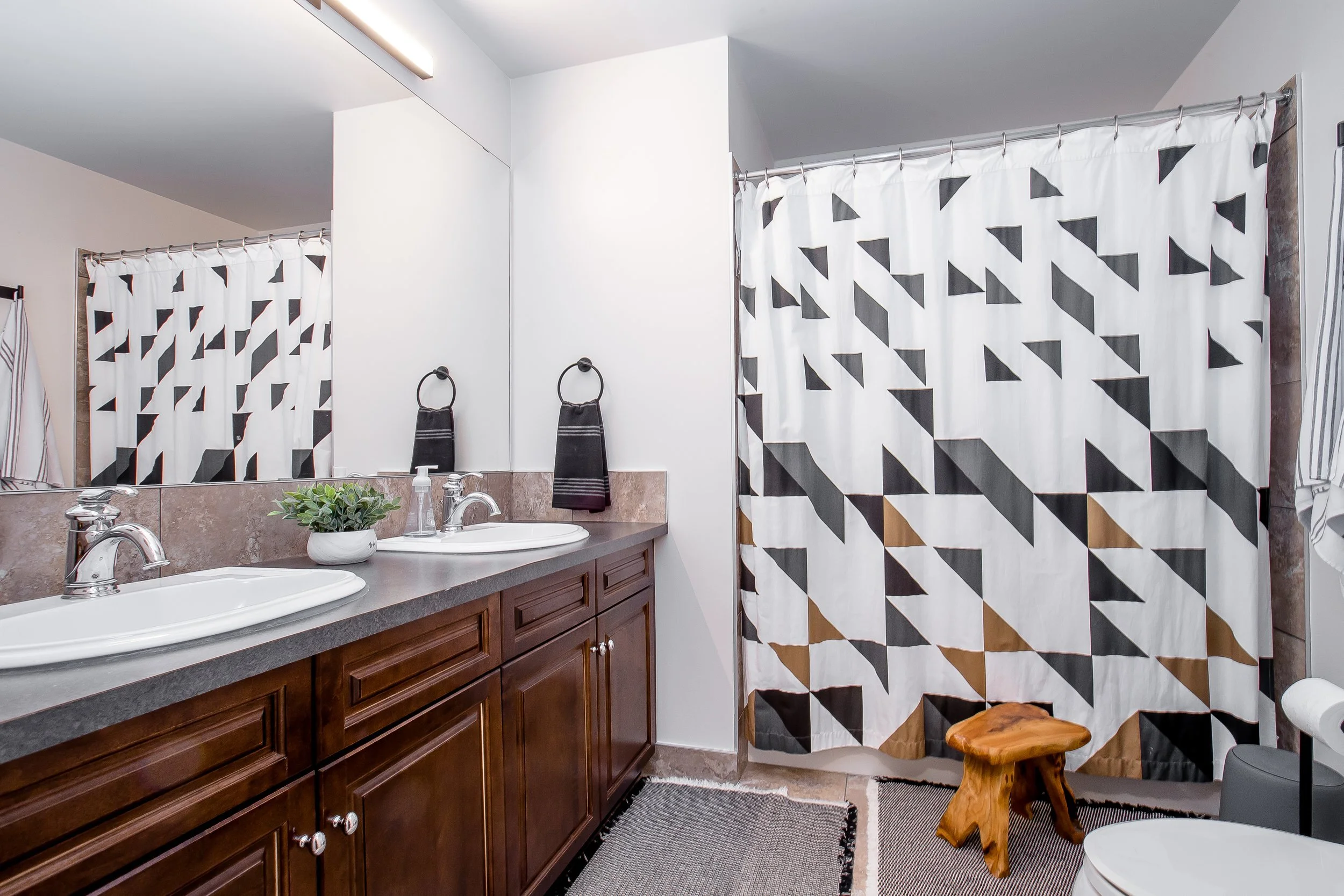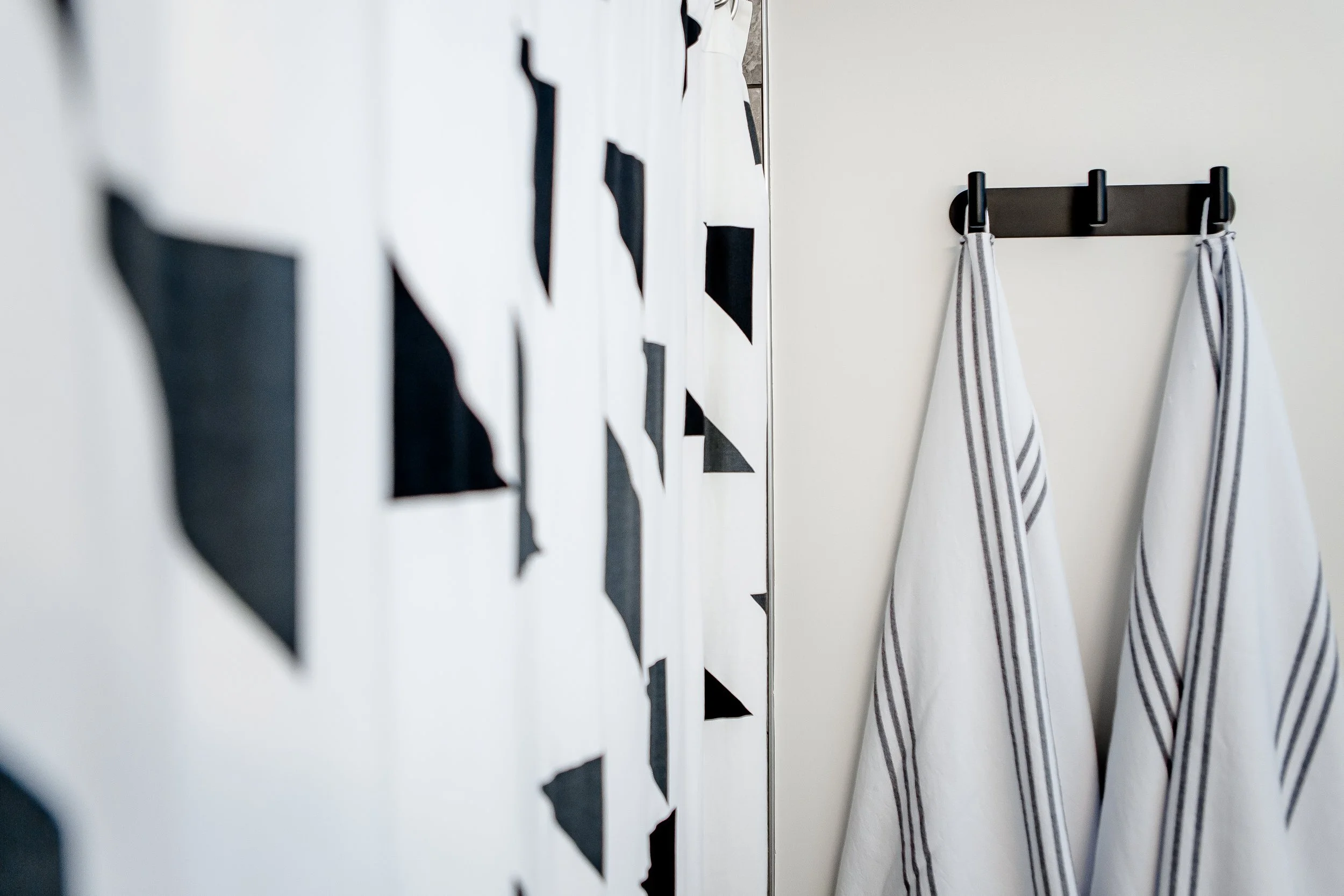 We focused on the design of the ensuite and left the secondary bathroom essentially as is (but with some new towels and decor). In the ensuite, the shower curtain just adds that character and interest as soon as you walk into the space. While we couldn’t update the hard finishes since the condo is a rental, we did install a new, modern light fixture and update the space with black hardware.