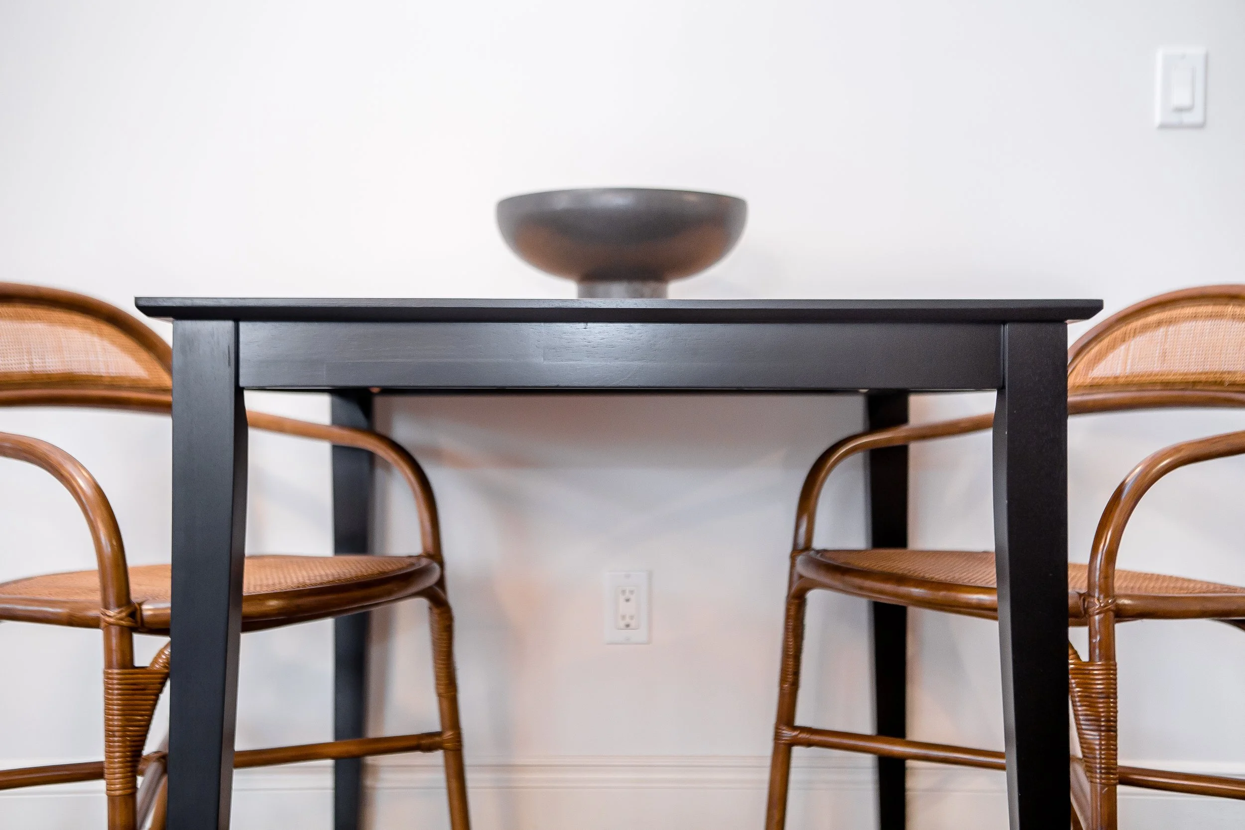 The dining area was a bit of an awkward space, so we went with a smaller scale table and two beautiful chairs. We also added a small bench that can be pulled out and used when extra seating is needed. This is a great example of thoughtful and intentional design – it works for my client day-to-day when it’s just him in the space, and there is a plan for when others are invited into the home as well.
