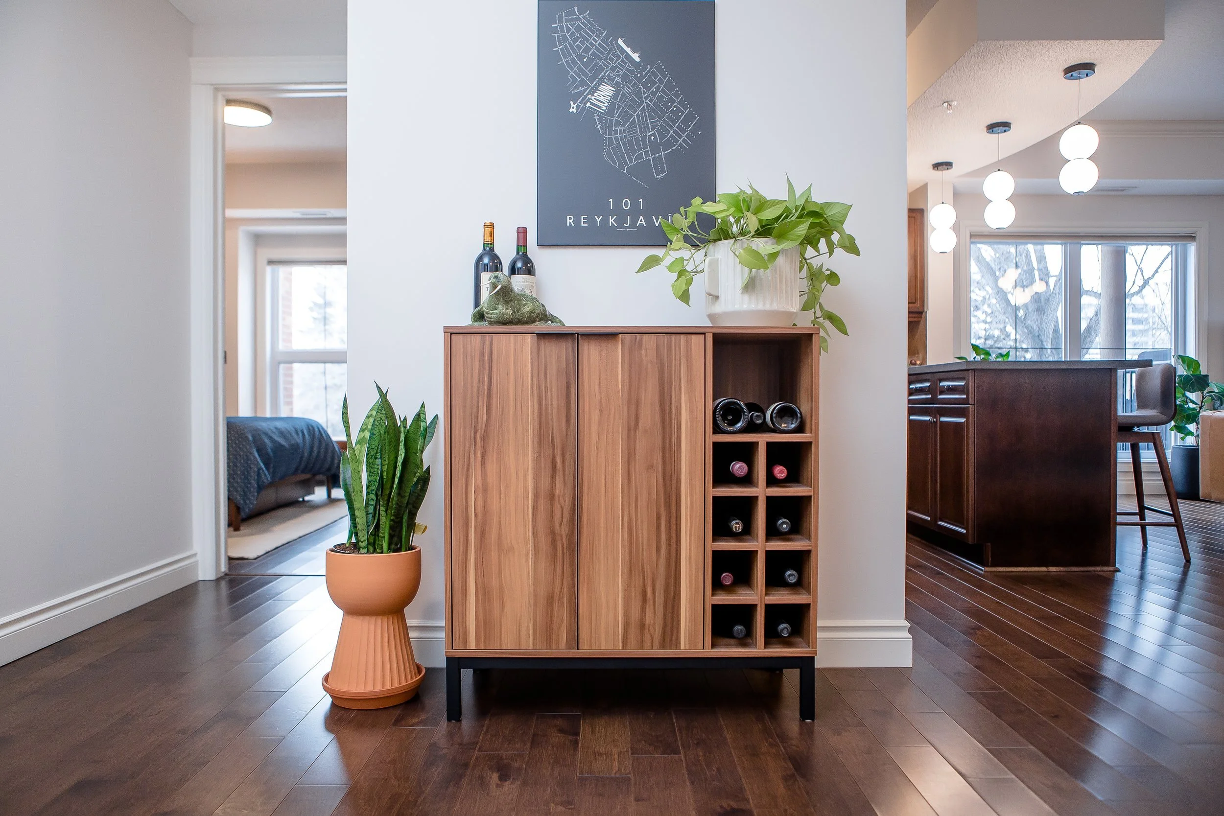 Across from the dining table is wine and bar storage. We also focused on finding interesting pots for all of his plants as another way to keep things functional while add more visual interest throughout the space.