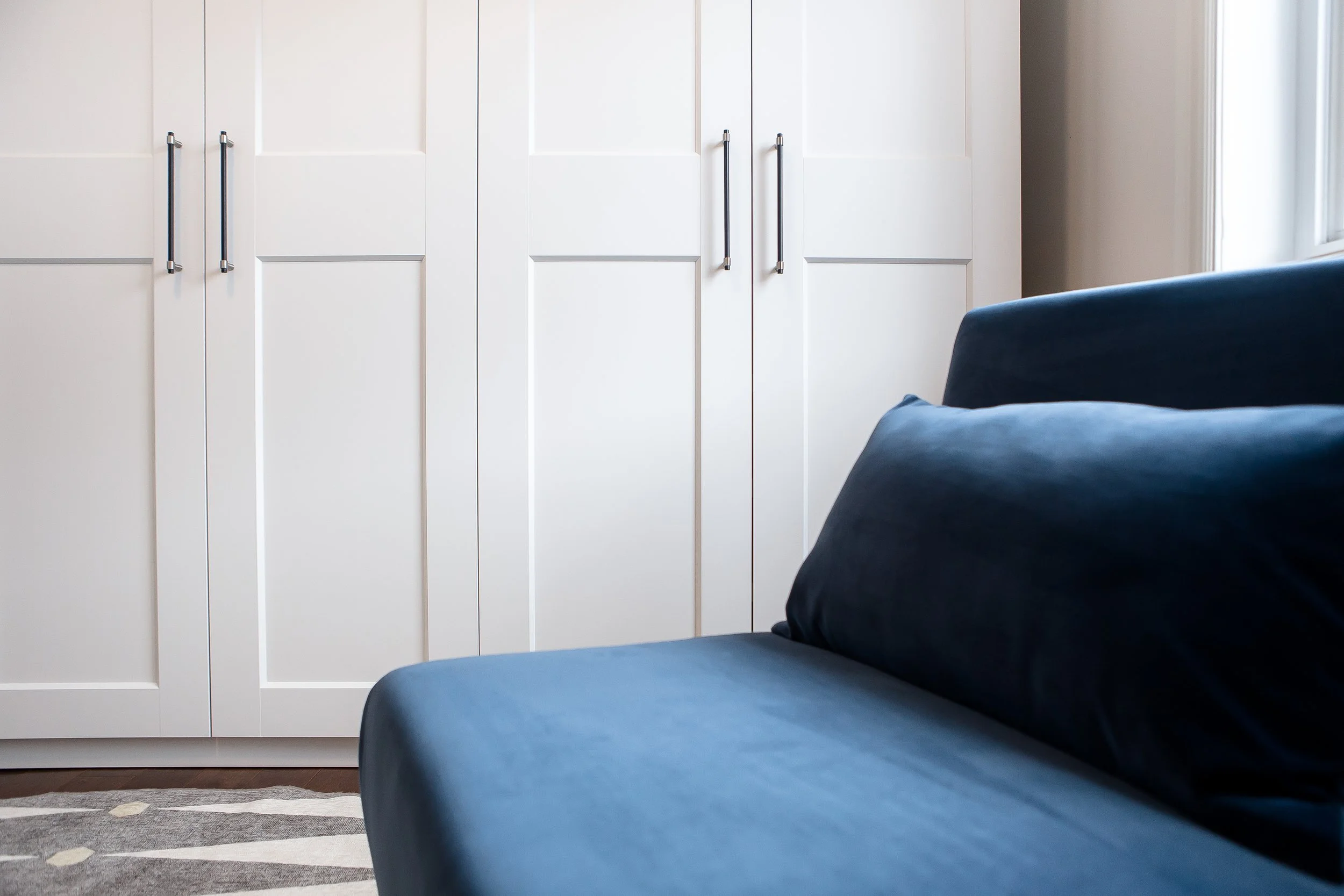 This chair folds out into a single bed for guests, and we added a row of PAX Wardrobes, which were customized with stunning two-toned handles, into the space under the room’s bulkhead.