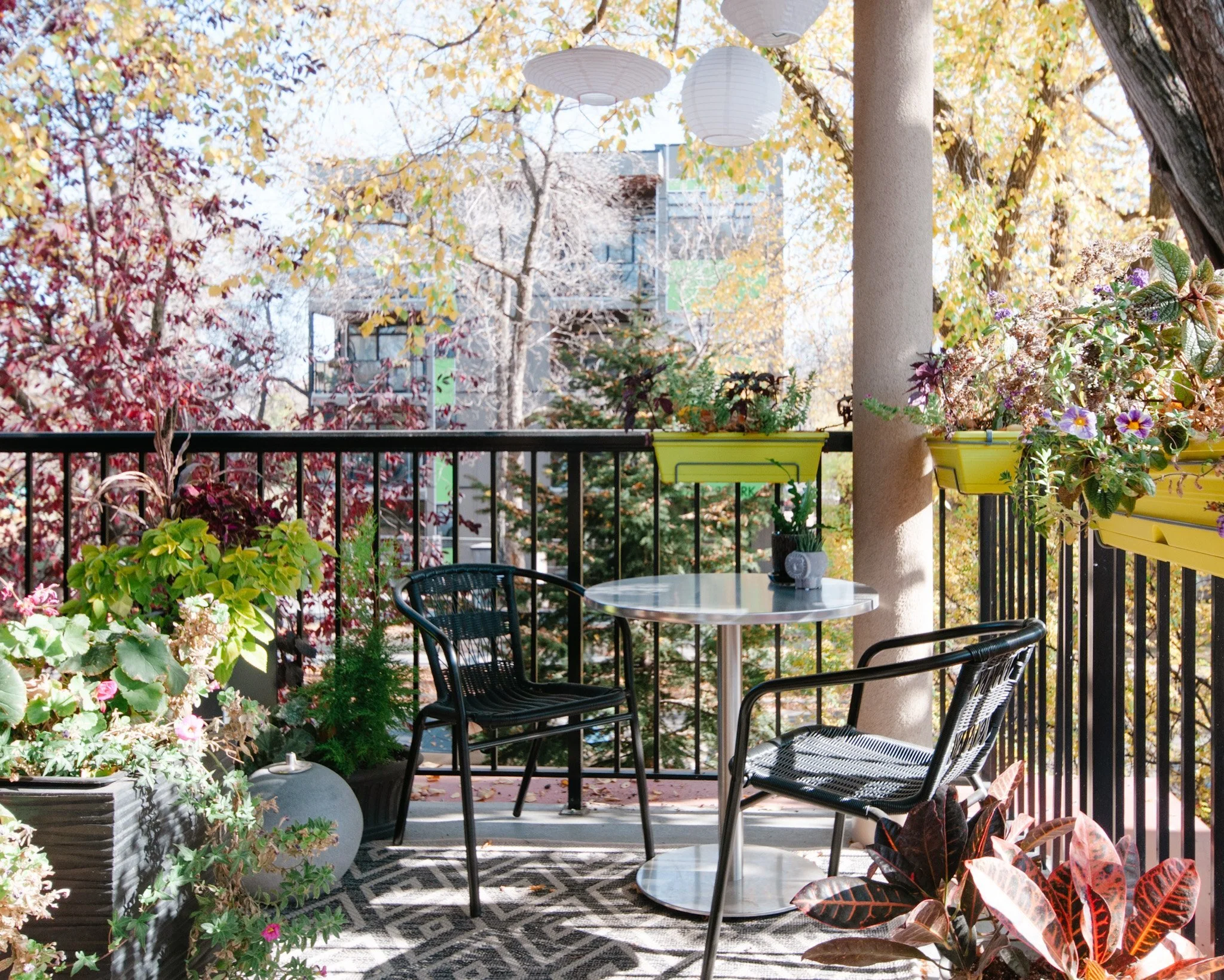 And we can’t forget about the balcony! I was able to take a few pictures in early fall of how the balcony space turned out. We wanted to create a space with a bit of ambiance, to enjoy a morning coffee or a glass of wine in the evening.