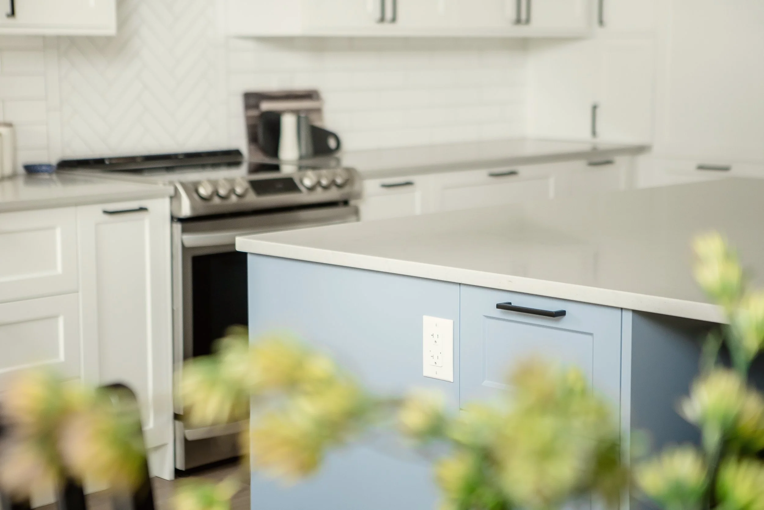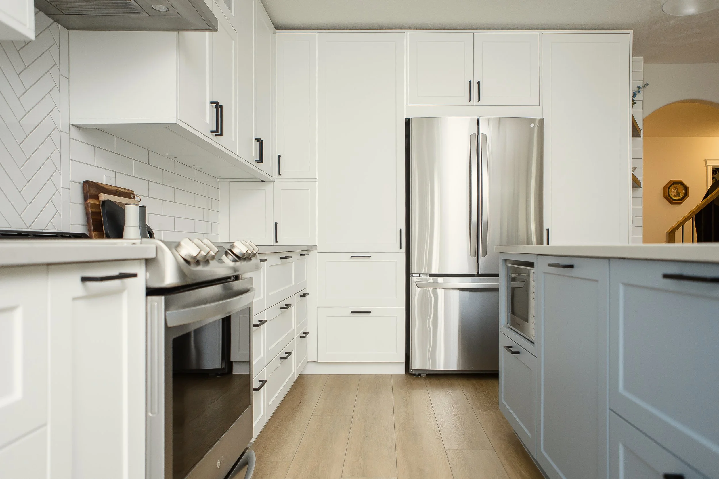 Two elements that were important to our clients were maintaining a drop zone and a spot for their phone at the entry to the kitchen and having a feature tile behind the range. We added in custom made shelves to fit the phone nook and created a herringbone design with a smaller subway tile that matched the look of the rest of the kitchen.