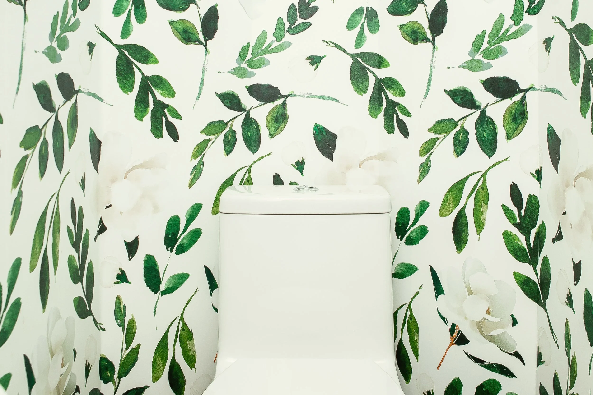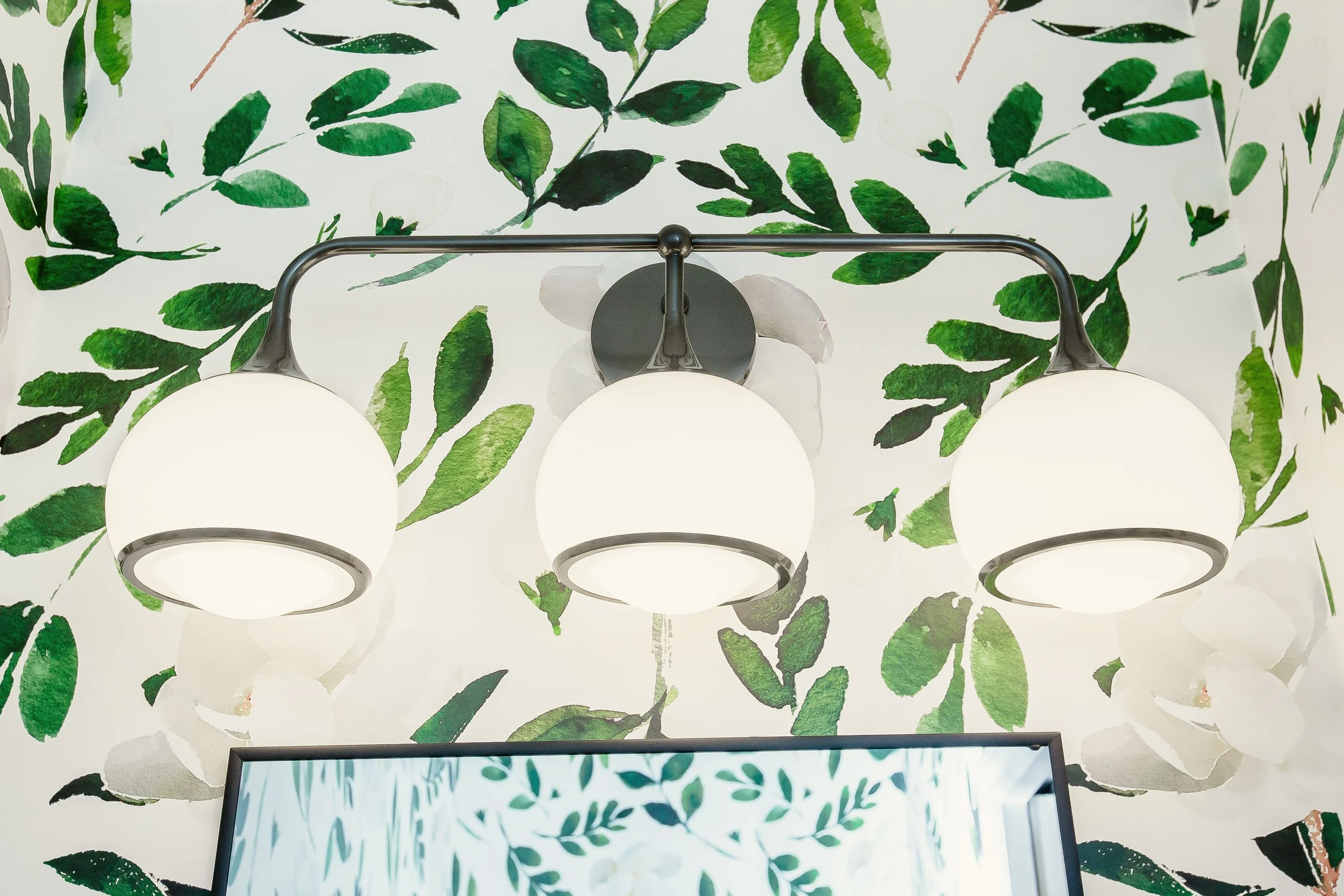 The flooring was replaced throughout the main floor with one consistent flooring which instantly made the space feel larger when we no longer had multiple types of flooring. And in the powder room, we added a touch of whimsy with a great floral wallpaper and updated fixtures.