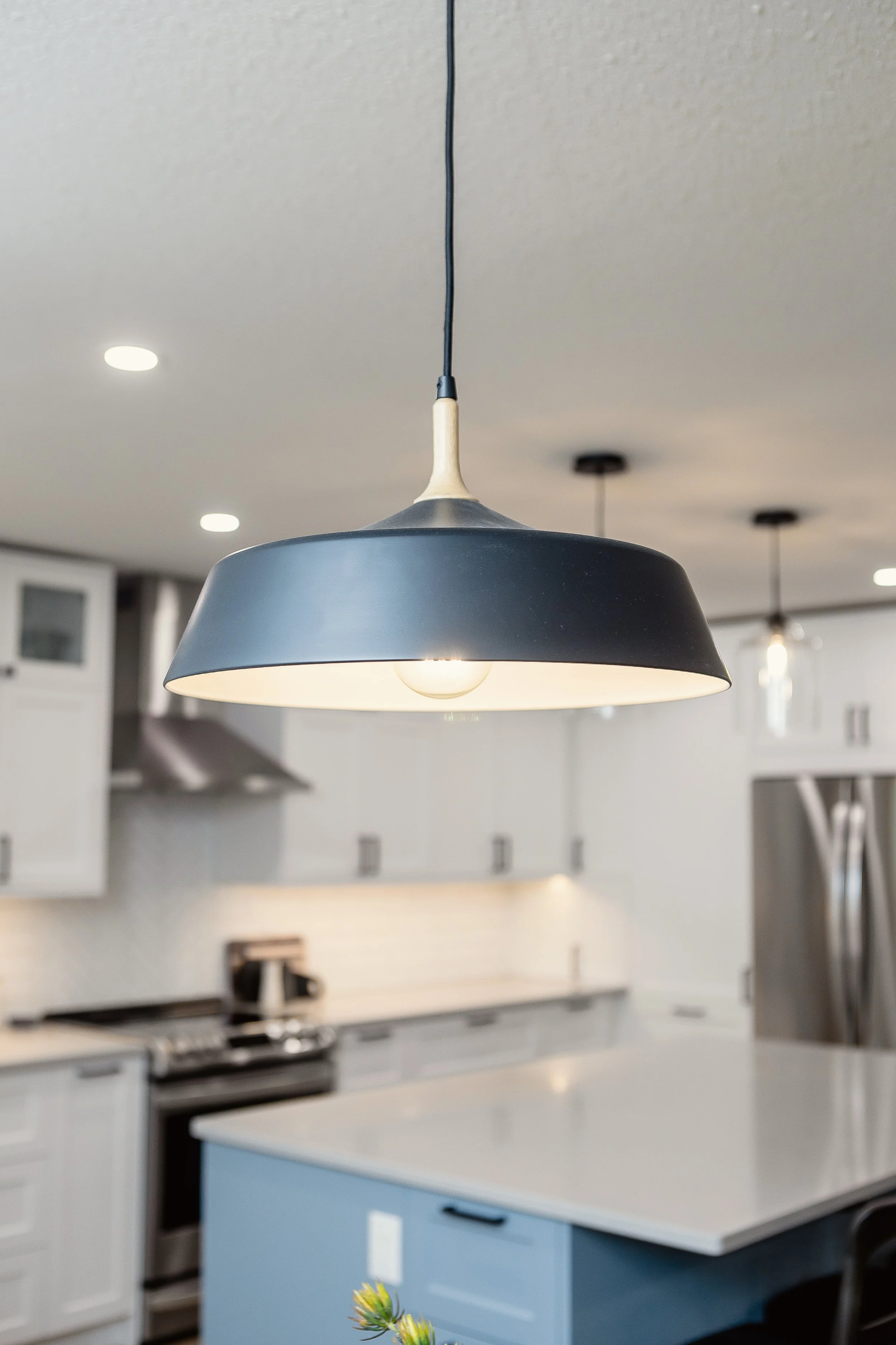 The blue of the island pairs really well with the stone around their fireplace, and even within the kitchen, it’s the perfect amount of visual interest to the otherwise white kitchen.