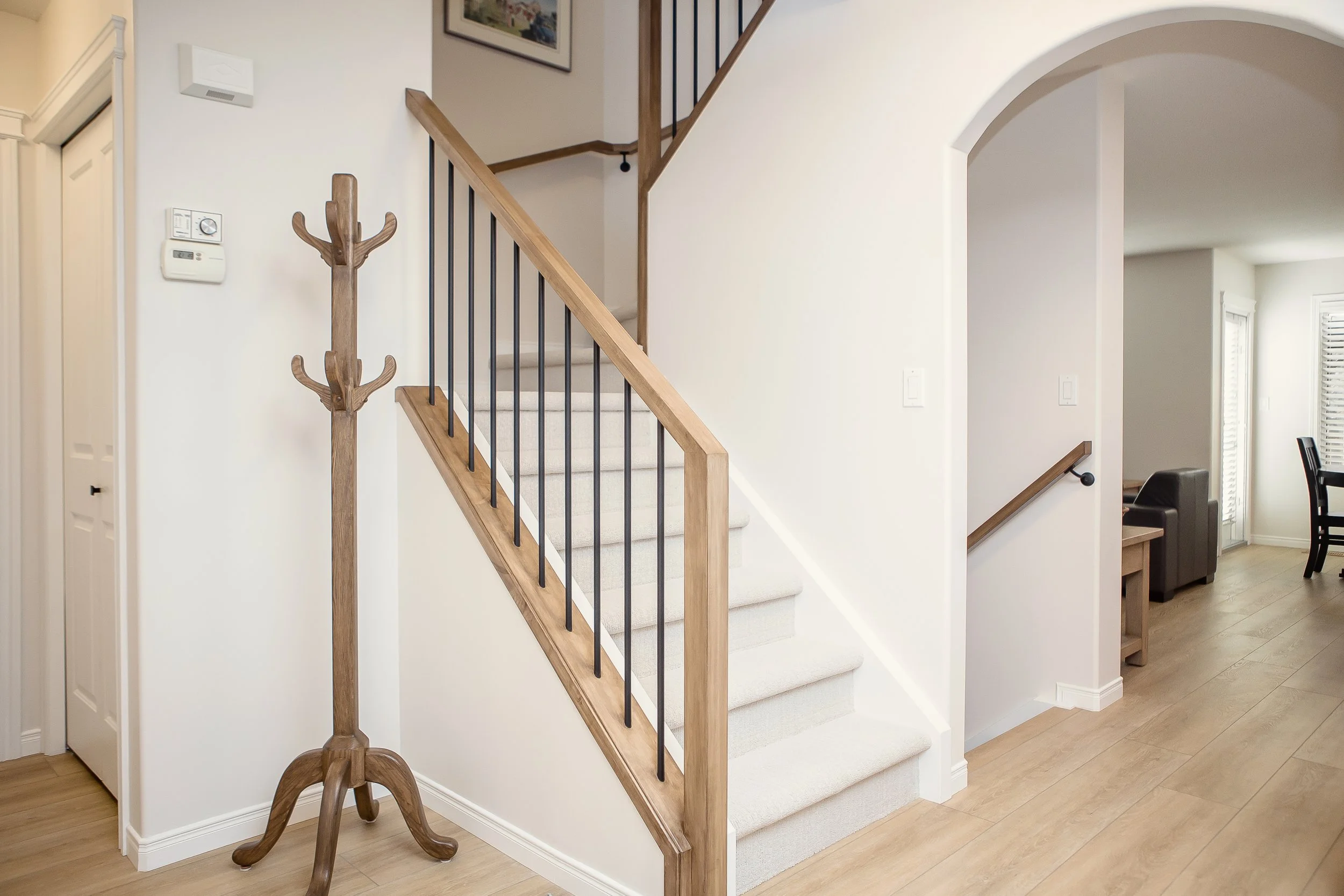 And over in the entry, the arch between the spaces was modernized and the new railing and updated carpet continue that fresh and clean look throughout the rest of the main floor.