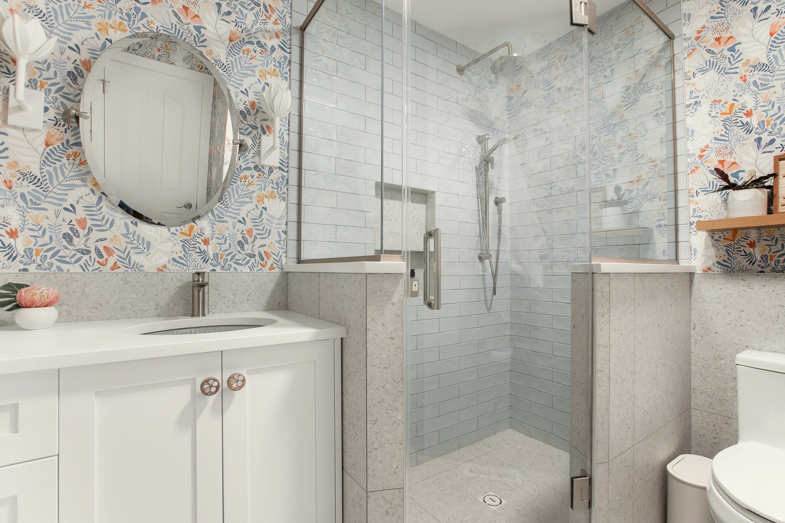 Aesthetically, our client wanted the ensuite to be a beautiful escape that felt feminine and a little bit whimsical. We went through several variations on the design for the ensuite with different combos of tile, wallpaper and vanity colours. We settled on the following option for the space which features a colourful floral wallpaper, light blue tiles, wood accents for warmth and white elements for a visual rest.