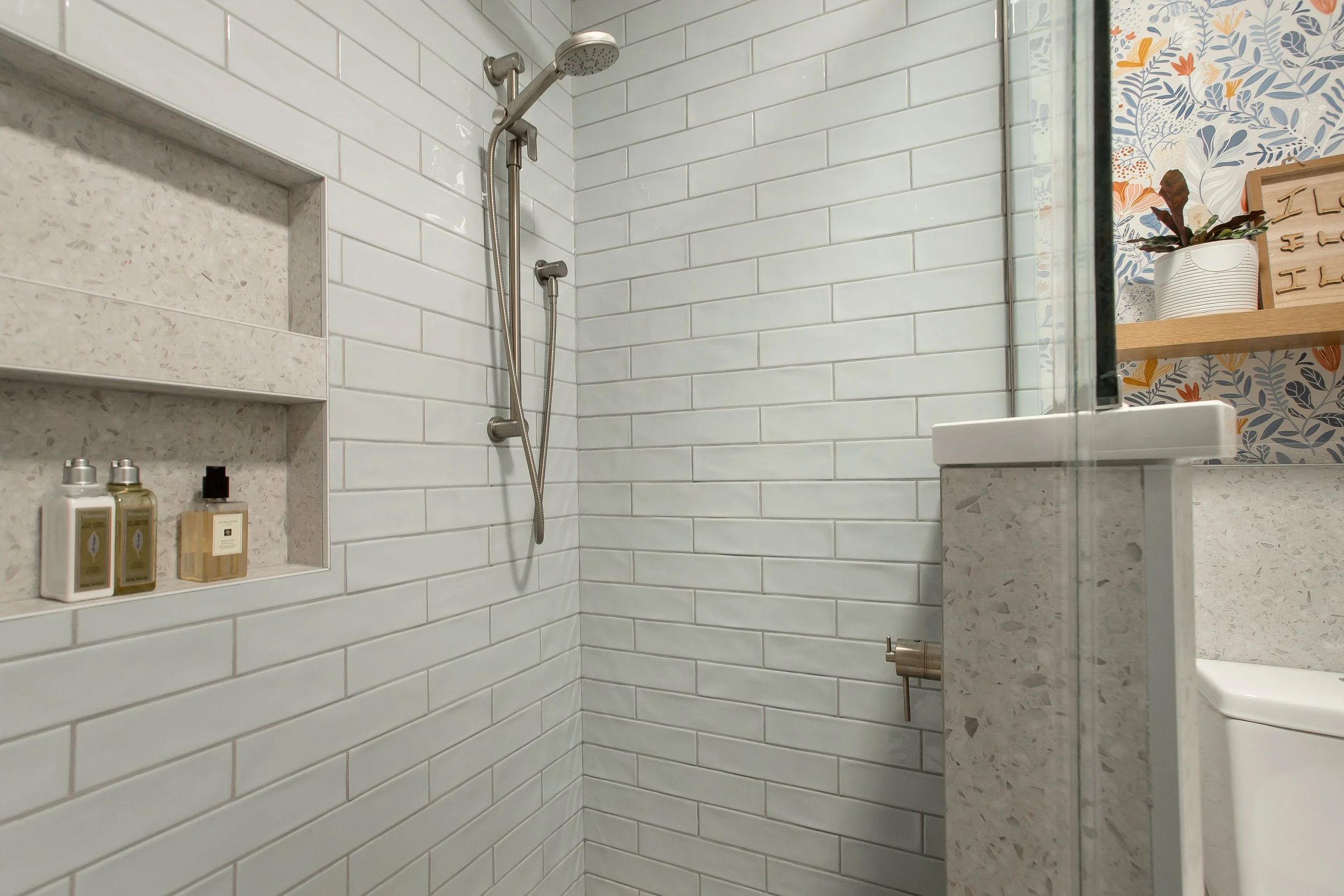 The floor tile is the same in both, and we used another subway tile as the surround in the main bath. And of course, a shower area can’t be complete without a storage niche!