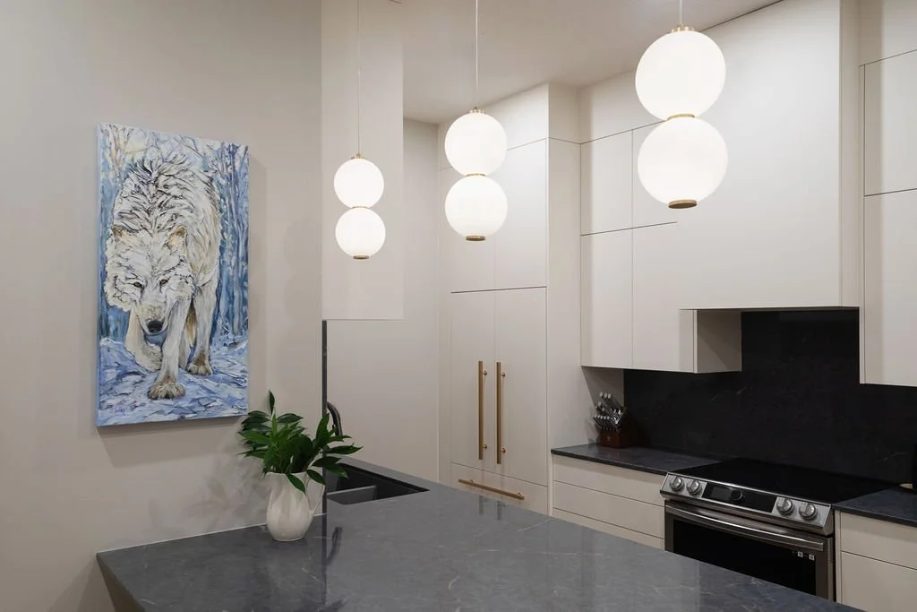 And in place of the previous light cloud, the space now has 3 pendants as feature lights and the perfect amount of recessed lighting to ensure the space feels bright. We used dimmer switches as well, for both, so that there is also the ability to control the brightness as desired.