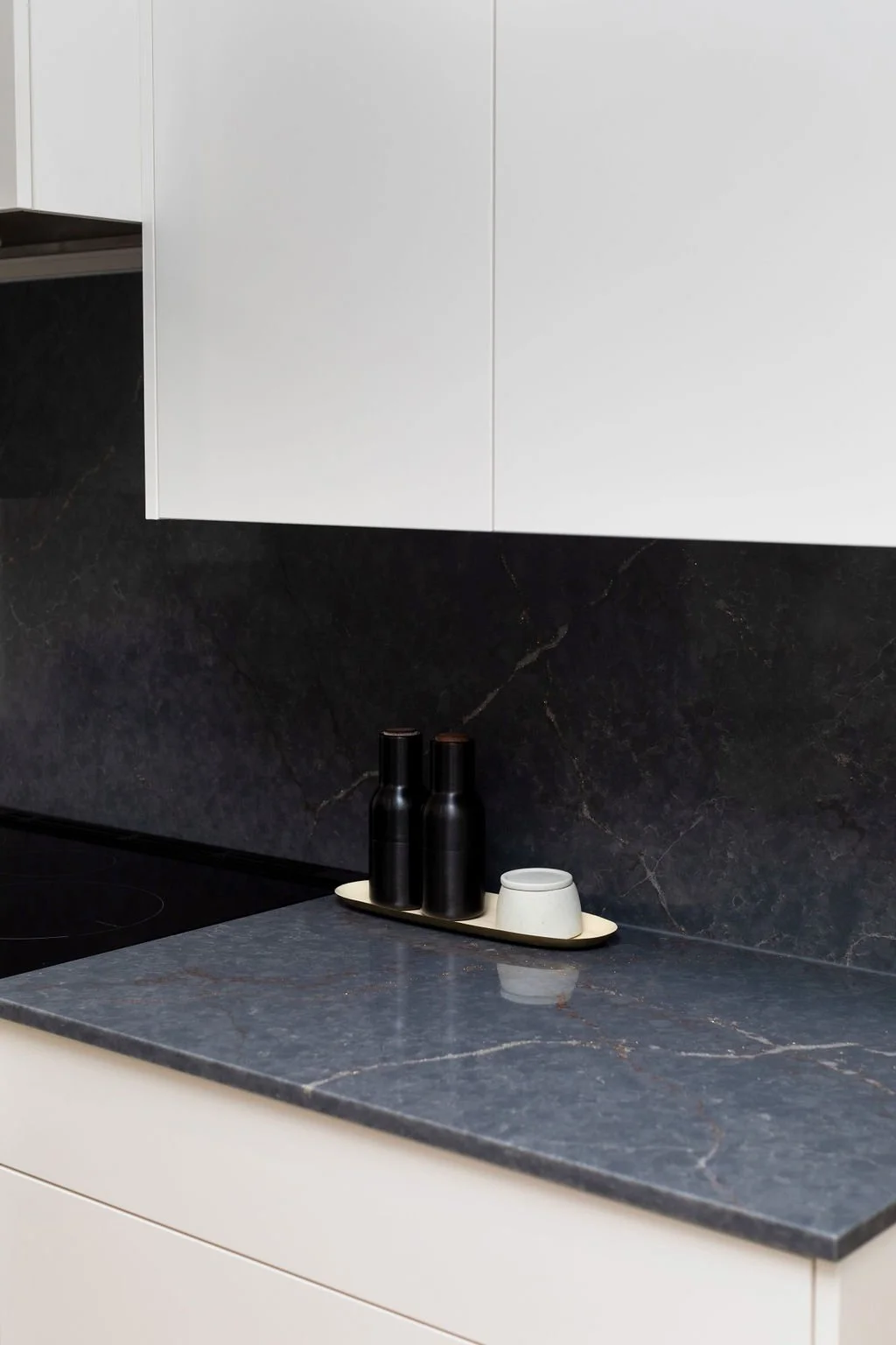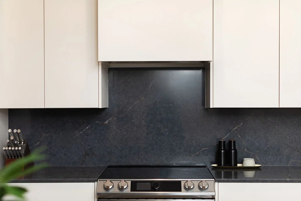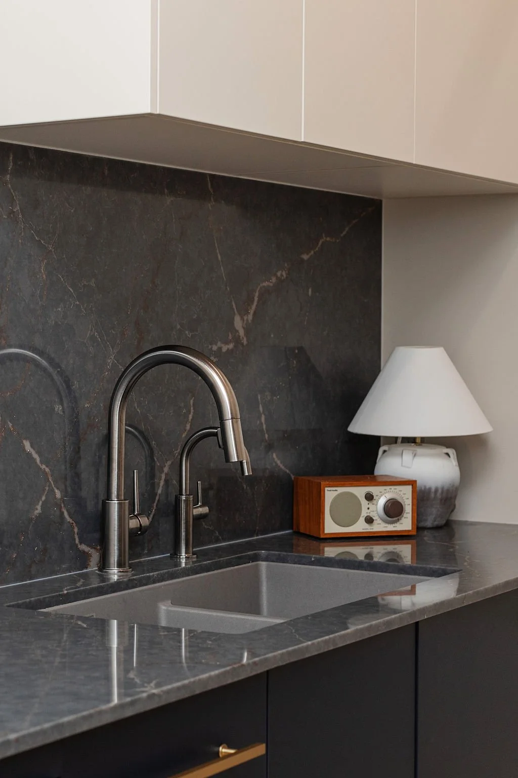 The second faucet is connected to a water filtration system in the cabinet below, allowing our clients to access filtered water on demand. And to further add to the seamless feel of the space, the stunning Silestone countertops were continued up the backsplash on both sides for extra drama.