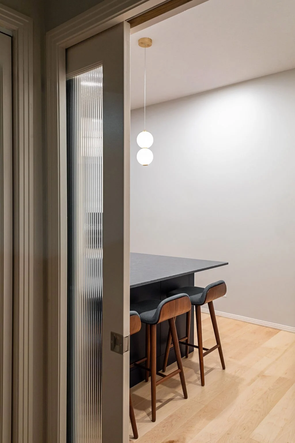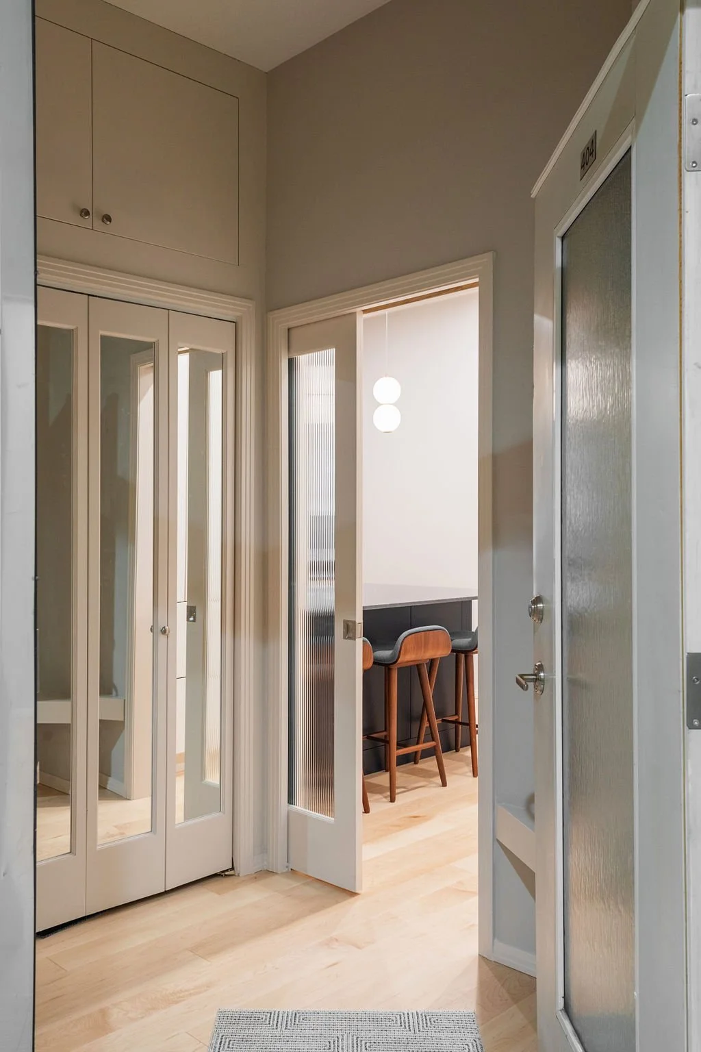 This new entryway completely transforms the space—adding a sense of definition, warmth, and separation while keeping everything cohesive. We included a generous sized closet along with full depth upper storage above. The reeded glass door provides privacy but allows light to flow between the two spaces, while creating that extra barrier to keep the cold out!