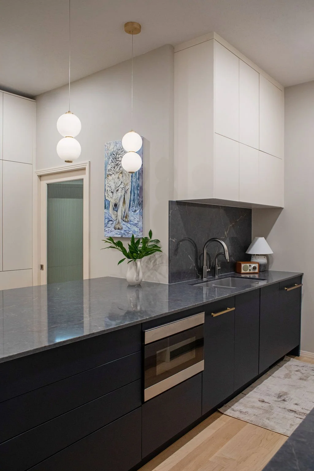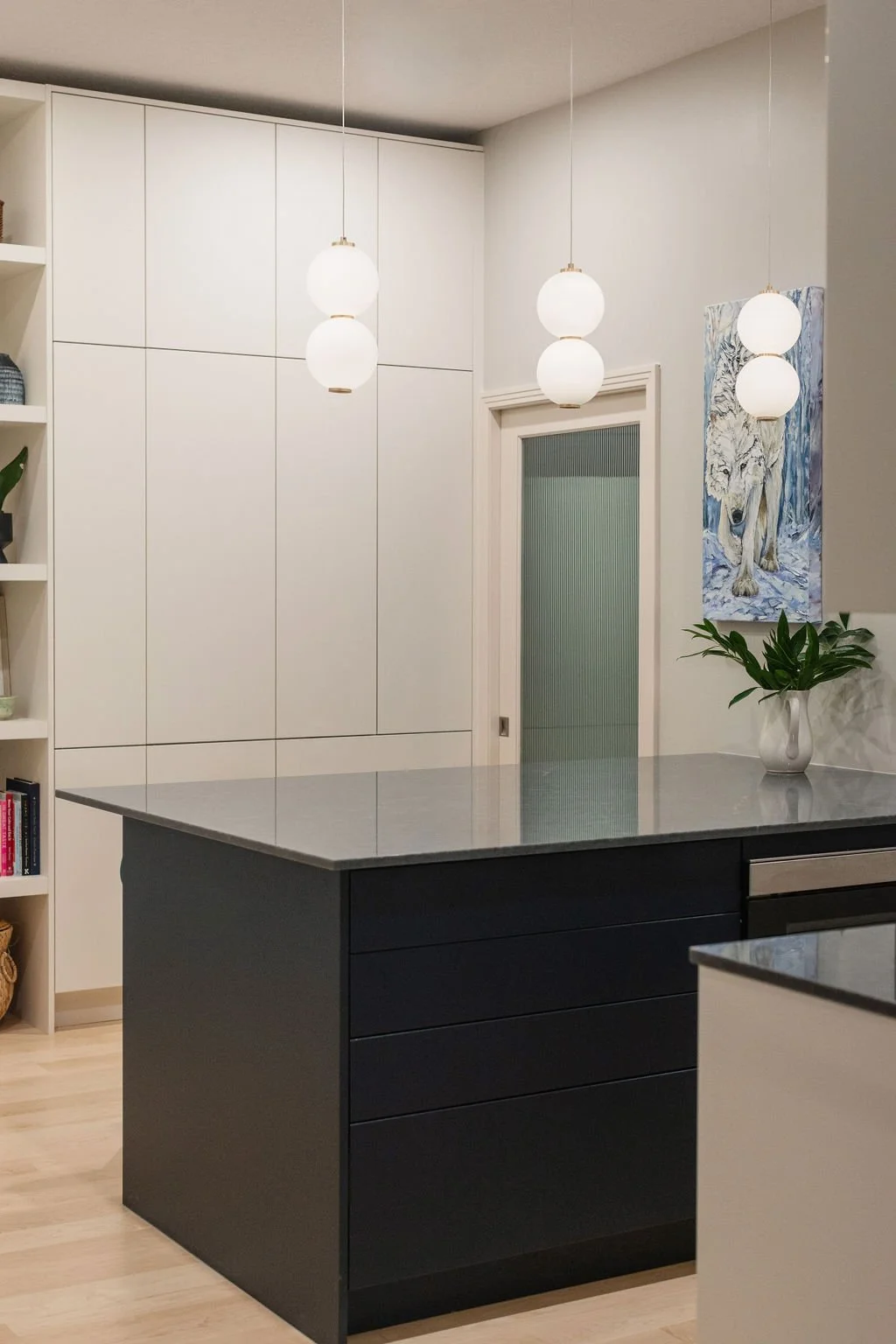 Real talk. I’ve been wanting to get my hands on one of these condo kitchens for a while now. This particular building is one of many that are designed similarly here in Edmonton - high ceilings but not the most ideal layouts. So when our clients reached out about making this space feel more like their (second) home, I was beyond excited. In addition to creating a beautiful, functional kitchen, the other goal was to create a more functional entryway with lots of storage and to help reduce cold drafts coming into the main space during the winter. The end result is a beautiful kitchen and entry that has maximized storage, improved the layout and created a space that feels like home.