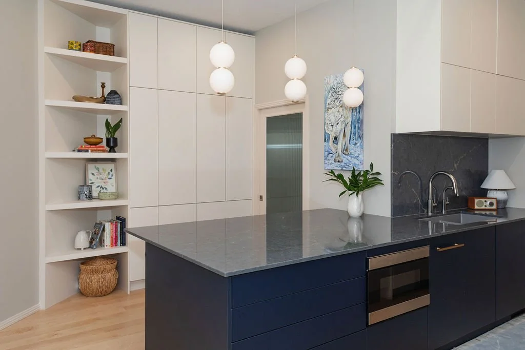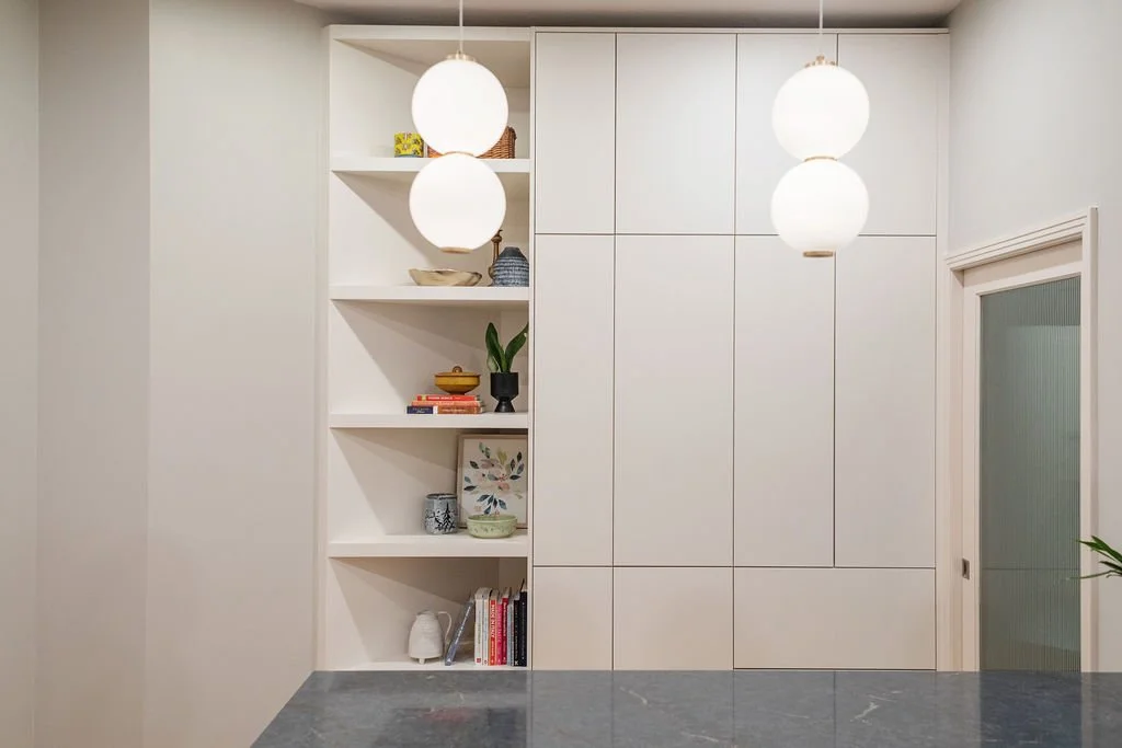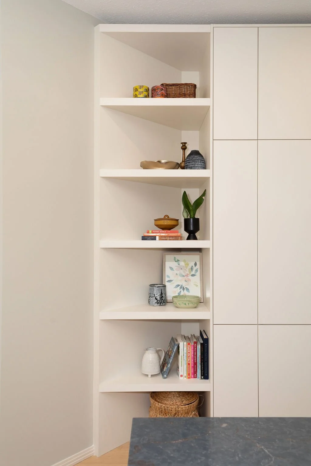 When you walk into the space, you’re greeted with full height cabinets on the right and open shelving that makes use of the angled corner. These cabinets act as additional entry storage space, cleaning cabinets and pantry storage. All of the cabinetry are push to open, with the exception of the panelled appliances and the garbage bin.