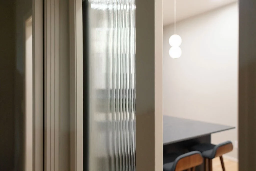 As you may have noticed by now, we try to make the elements of the two options clients receive interchangeable. So in this case, we took aspects of both options to create the final design and fully enclosed the entryway with a reeded glass pocket door.