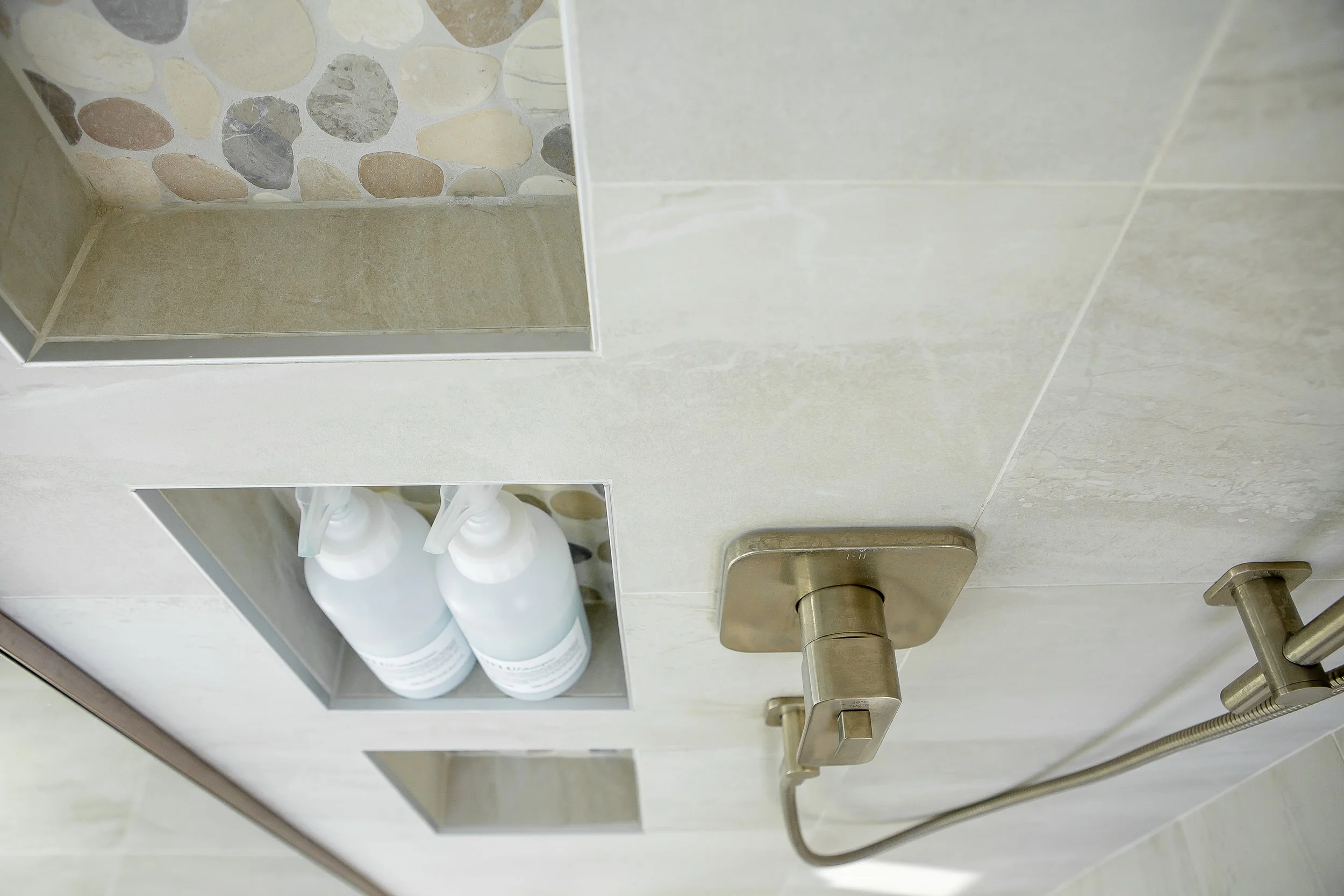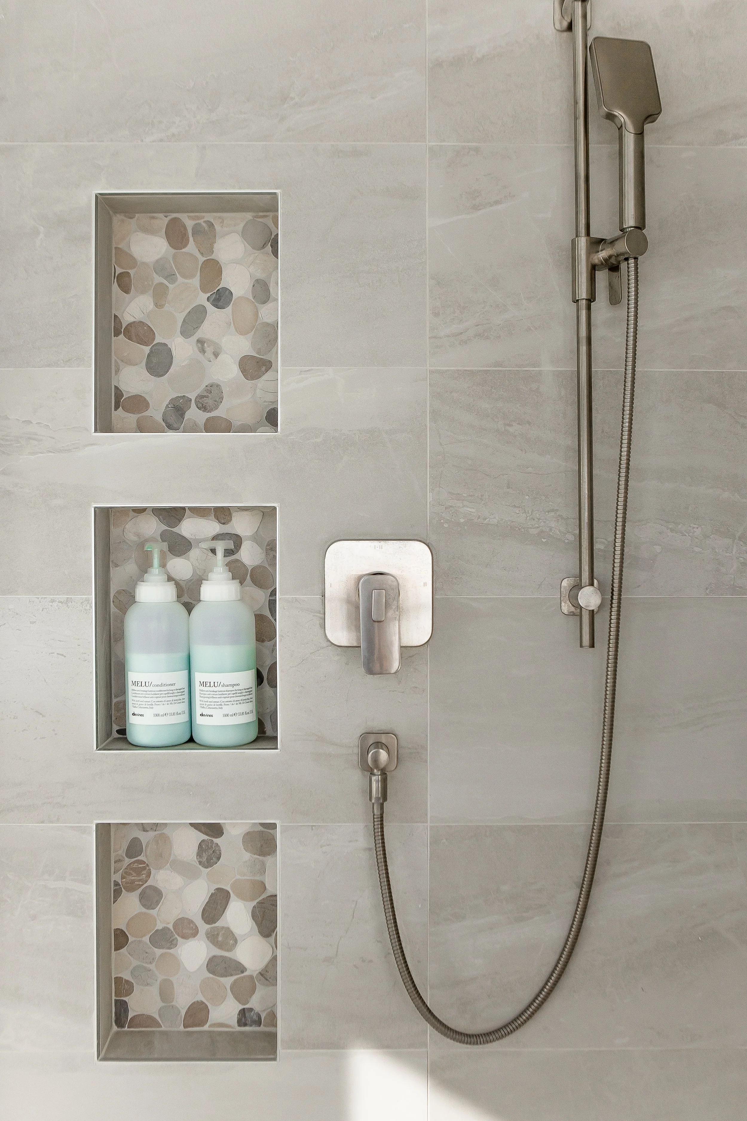 Storage was very important to our clients, so we did a triple niche in the shower and then added several full height cabinets at the end of the vanity to store both their bathroom items but also to have a spot to store their laundry baskets too.
