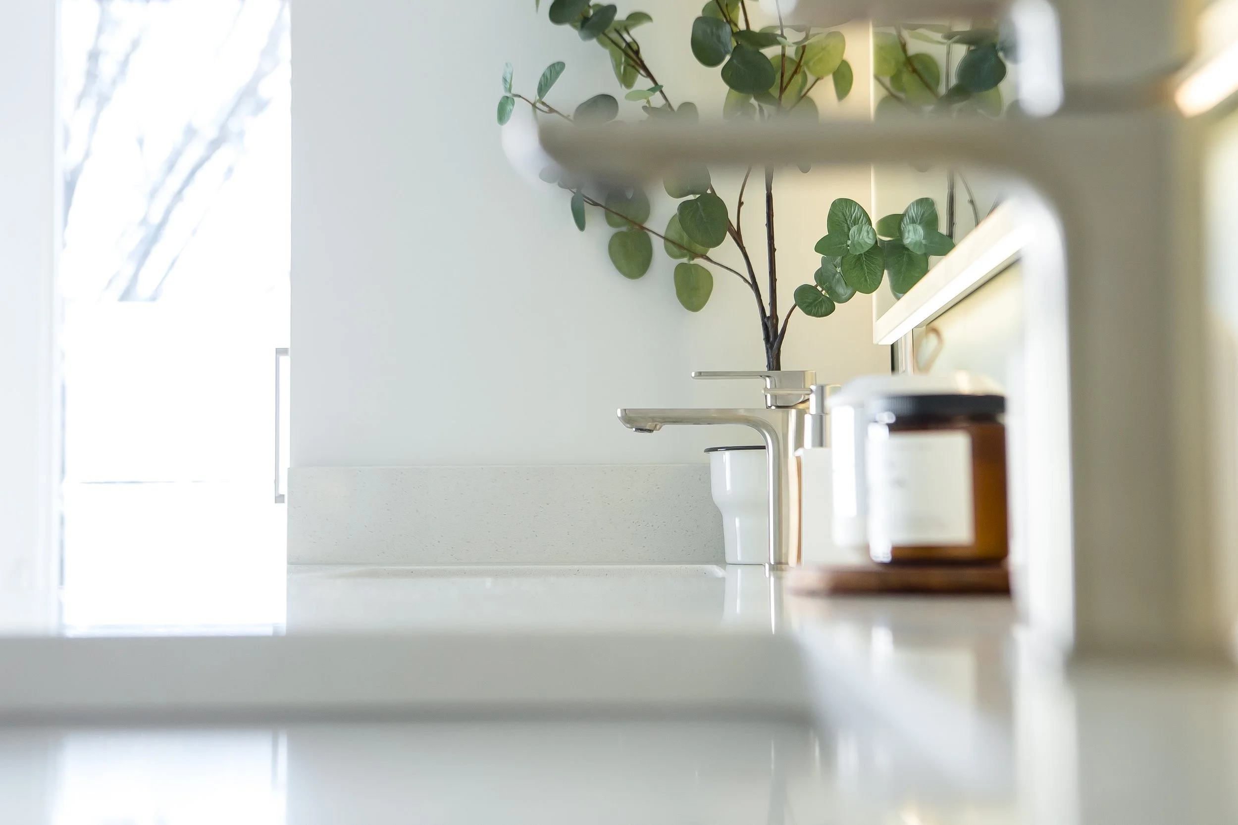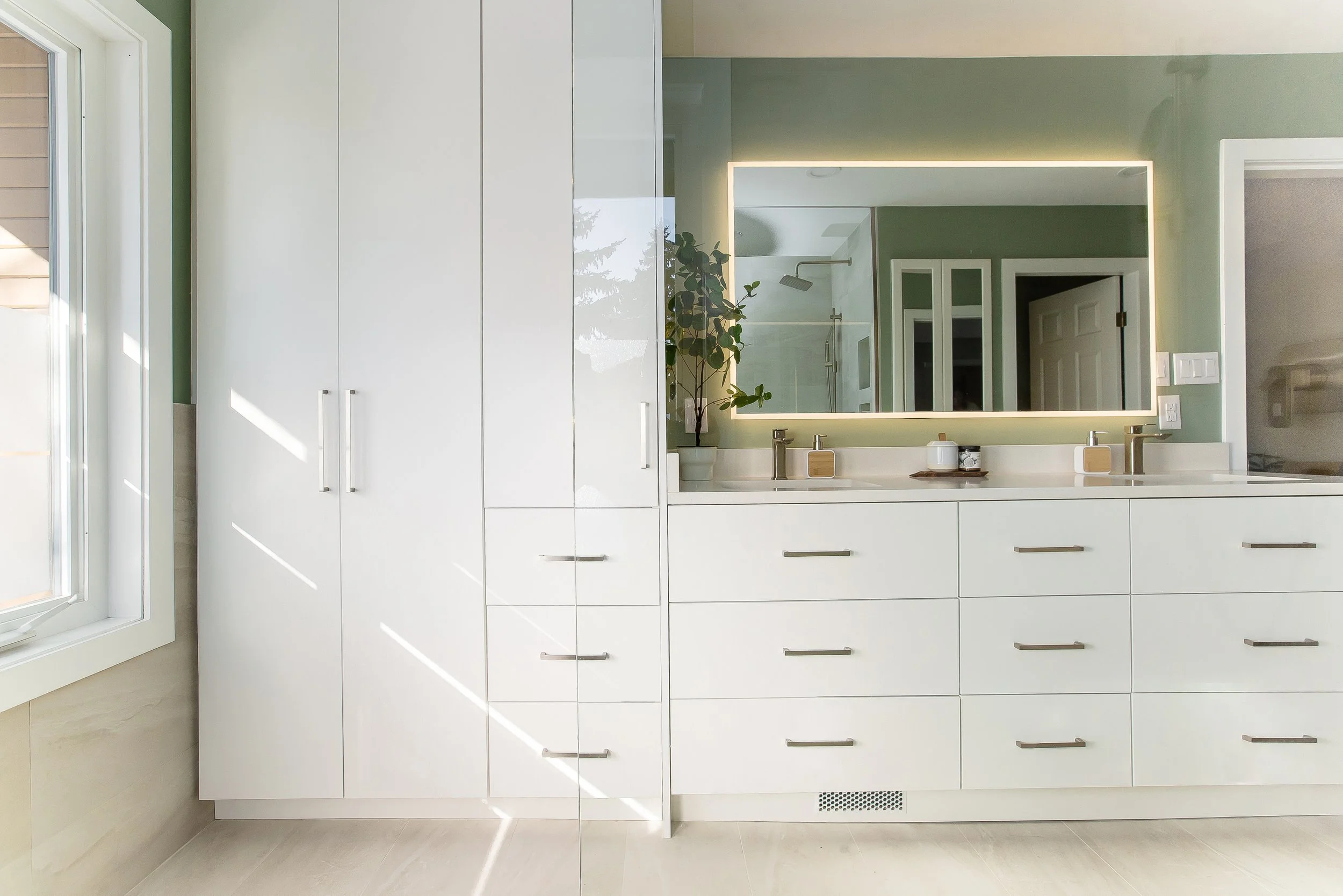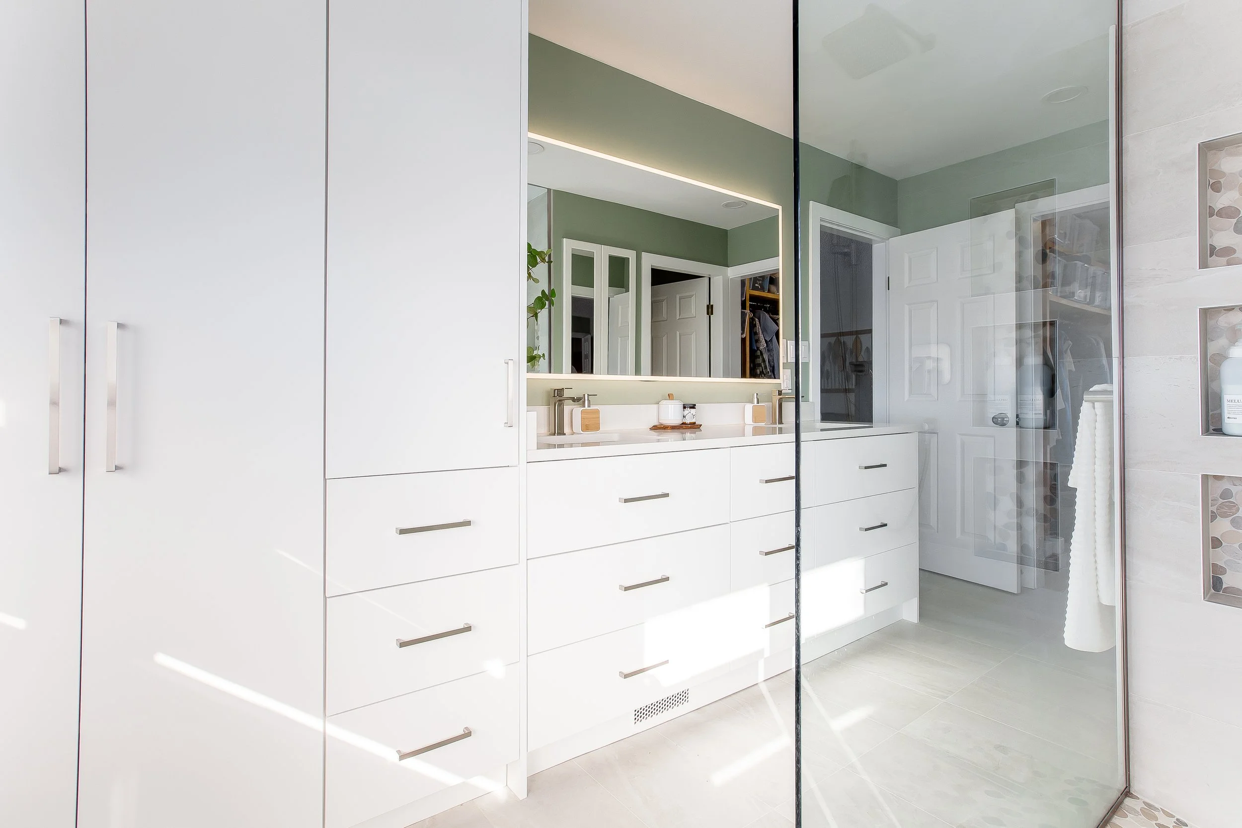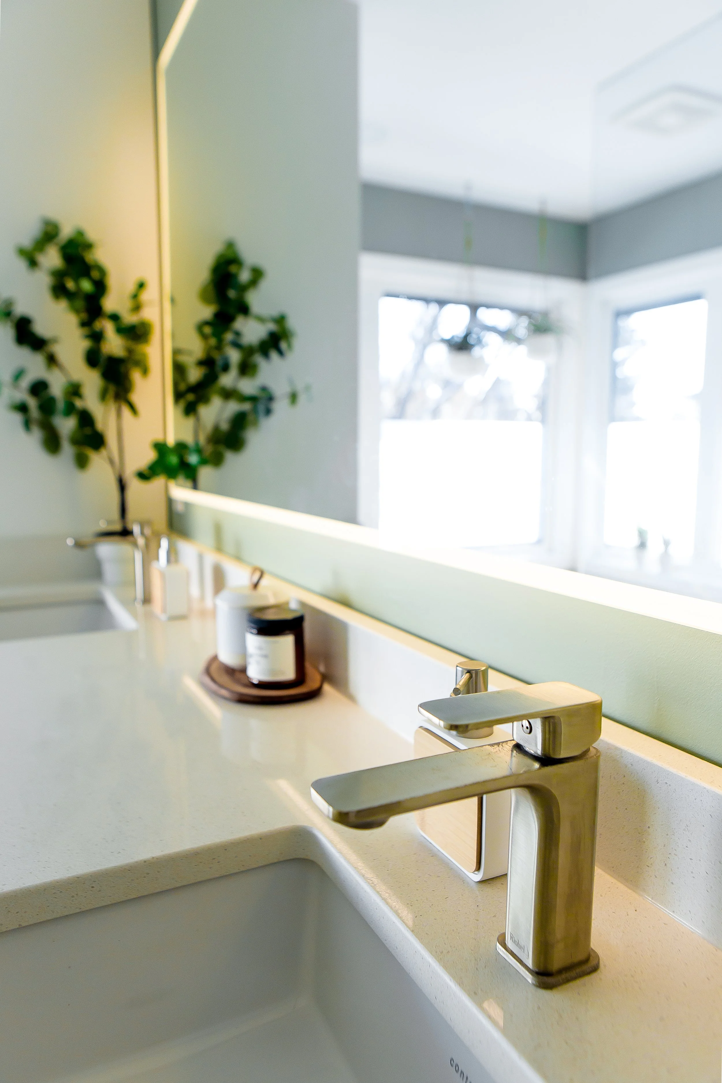 We kept the same cabinet style, countertops and hardware that we used in the previous kitchen renovation to make that connection between the two spaces. Lighted mirrors are another favourite of ours in a primary bathroom. They create beautiful ambient light in the space with dimmed and are great for getting ready in and doing your makeup with at full light.