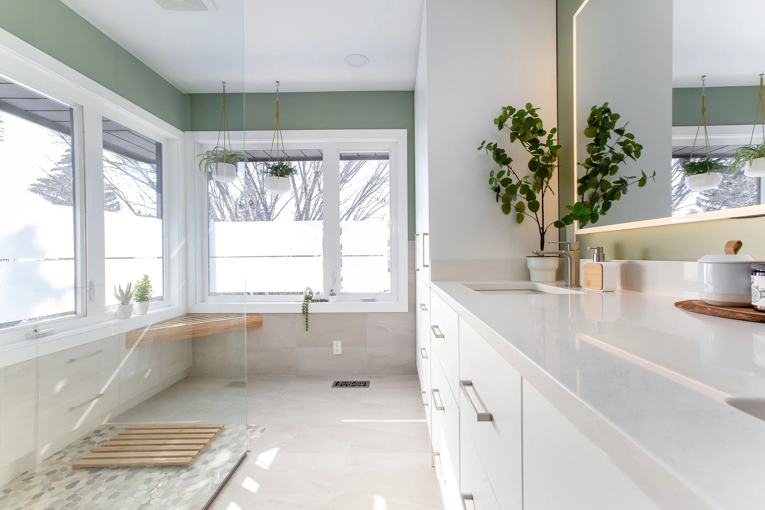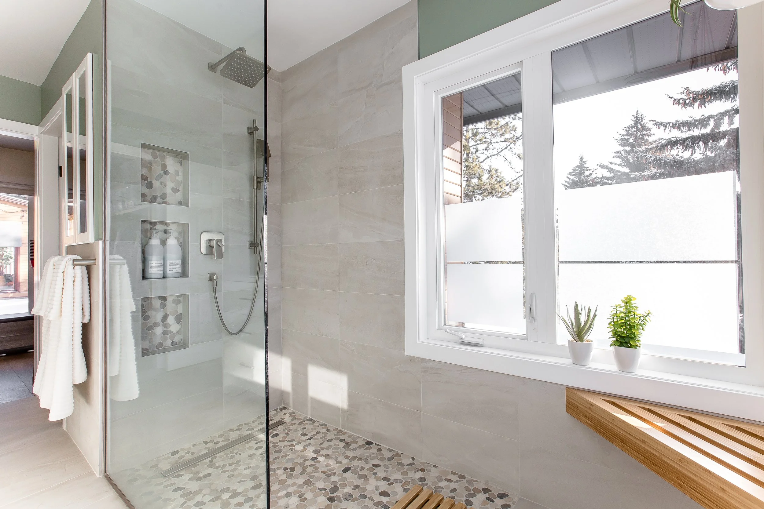 We love it when our existing clients bring us back for more and that was the case for the renovation of this ensuite bathroom in the lovely neighbourhood of Ramsay Heights in Edmonton. We’d previously renovated their kitchen (see more here) and the bathrooms were the last areas that needed updating. Our focus was primarily on the ensuite, although we did do a more minimal update to the secondary bathroom as well. The clunky jacuzzi tub and dated shower were replaced with an open concept, large, curbless shower and extra storage.