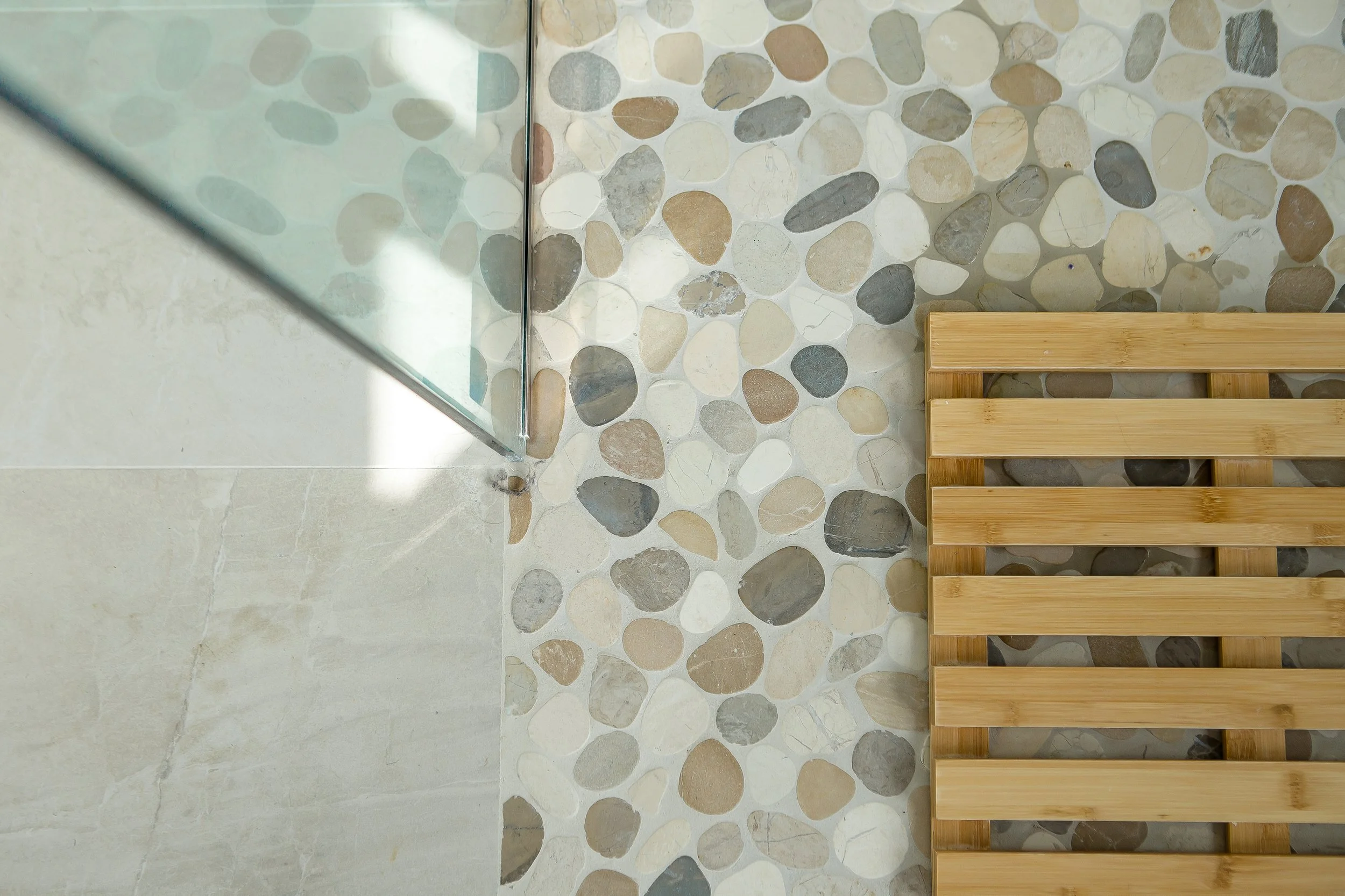 We added warmth by using bamboo accents throughout which are found in decorative items and this custom made, floating bamboo bench. The pebble tile also adds a lovely natural texture that grounds the space.