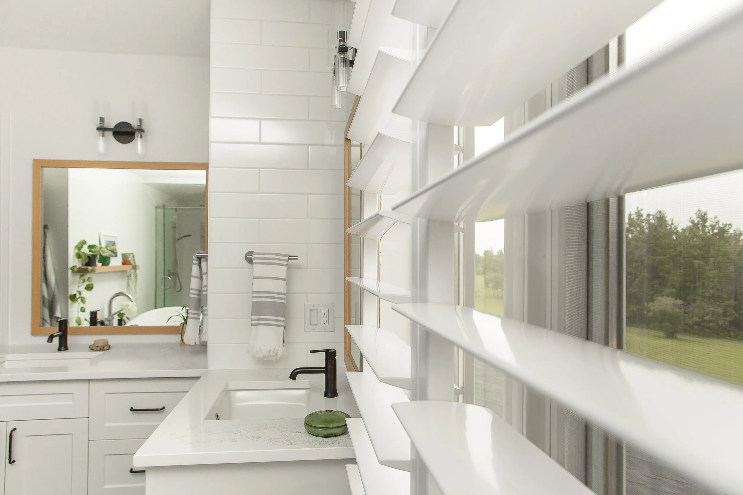 This is such a long space so this isn’t our most conventional layout but it is a layout that really maximizes the shape of the room and the functionality contained within it. By decreasing the size of the entry to the space, we were able to fit in a double vanity around the existing vent space, still providing ample storage and surface areas.