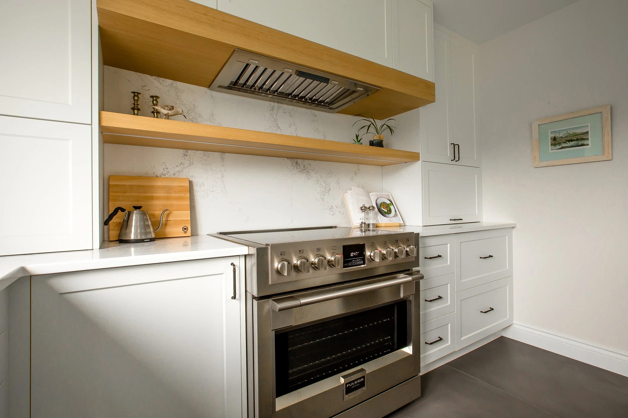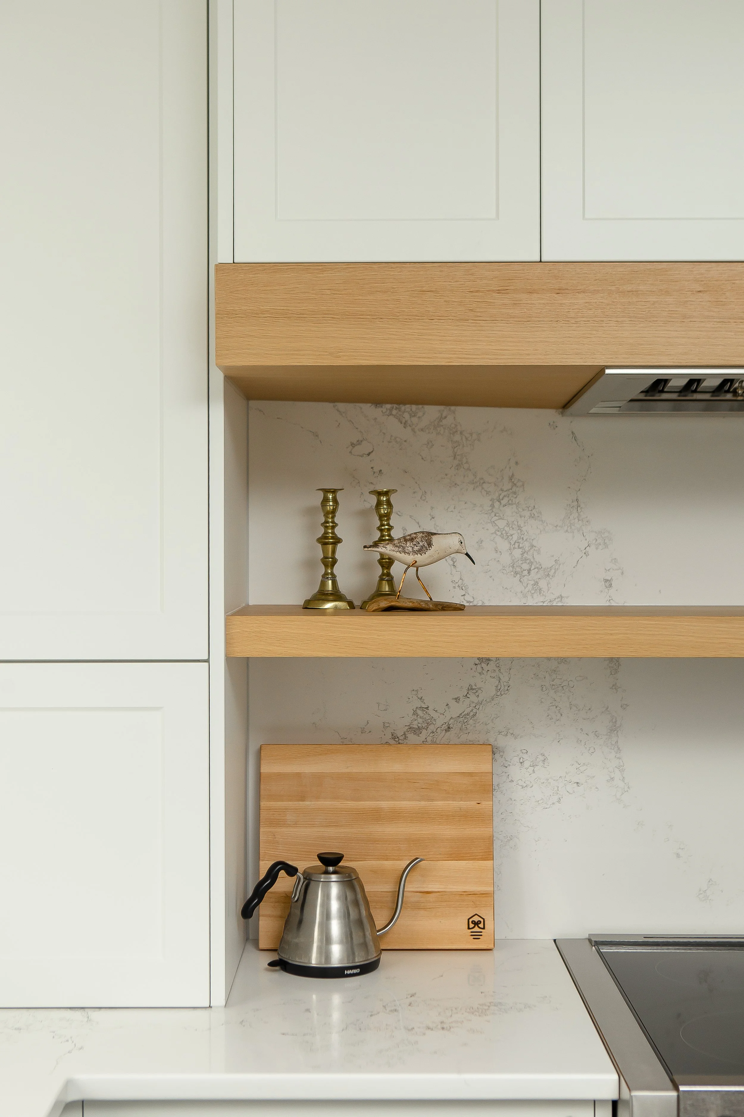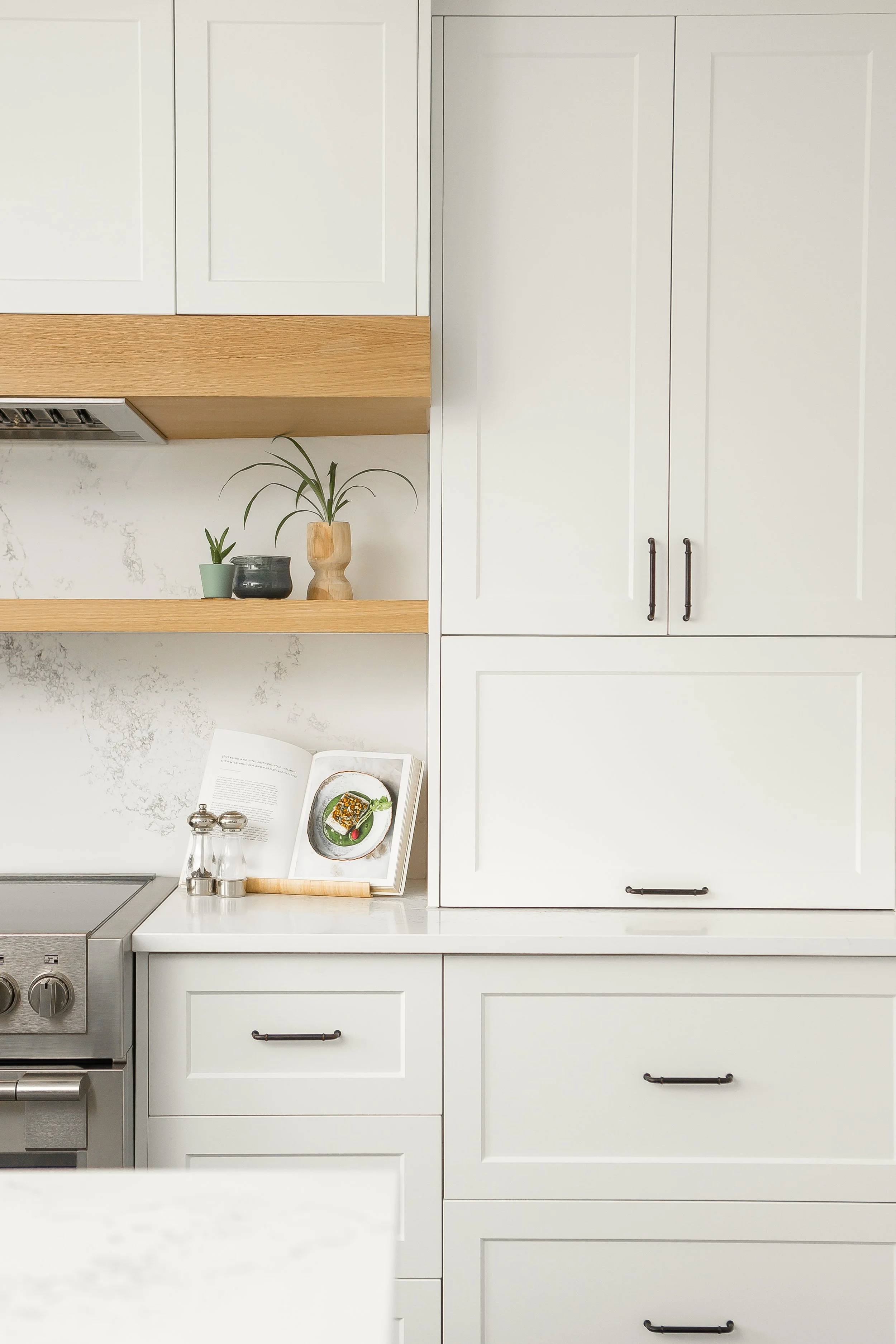 We went with a 36” induction range and carried the quartz countertop up onto the wall behind. The space is accented by more touches of wood in the floating shelf and range hood trim above.