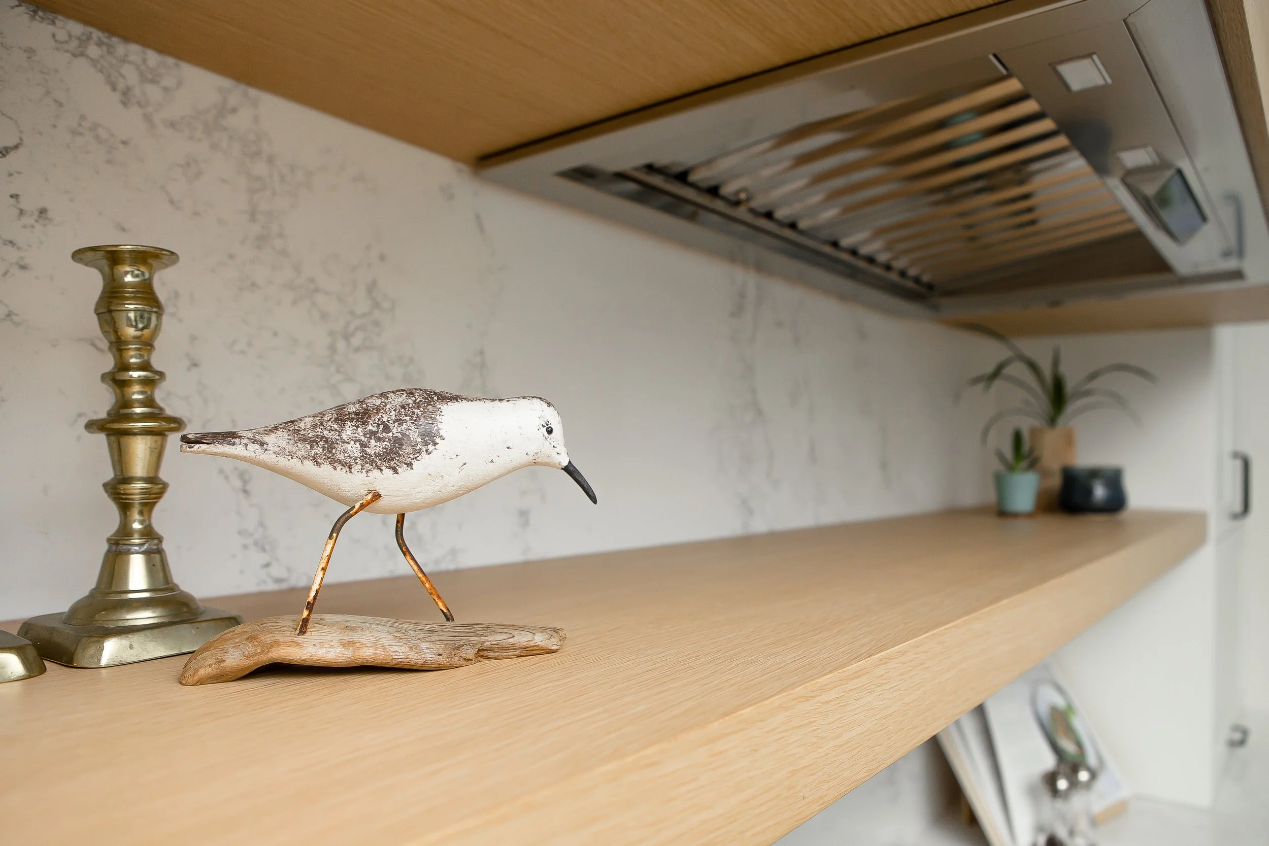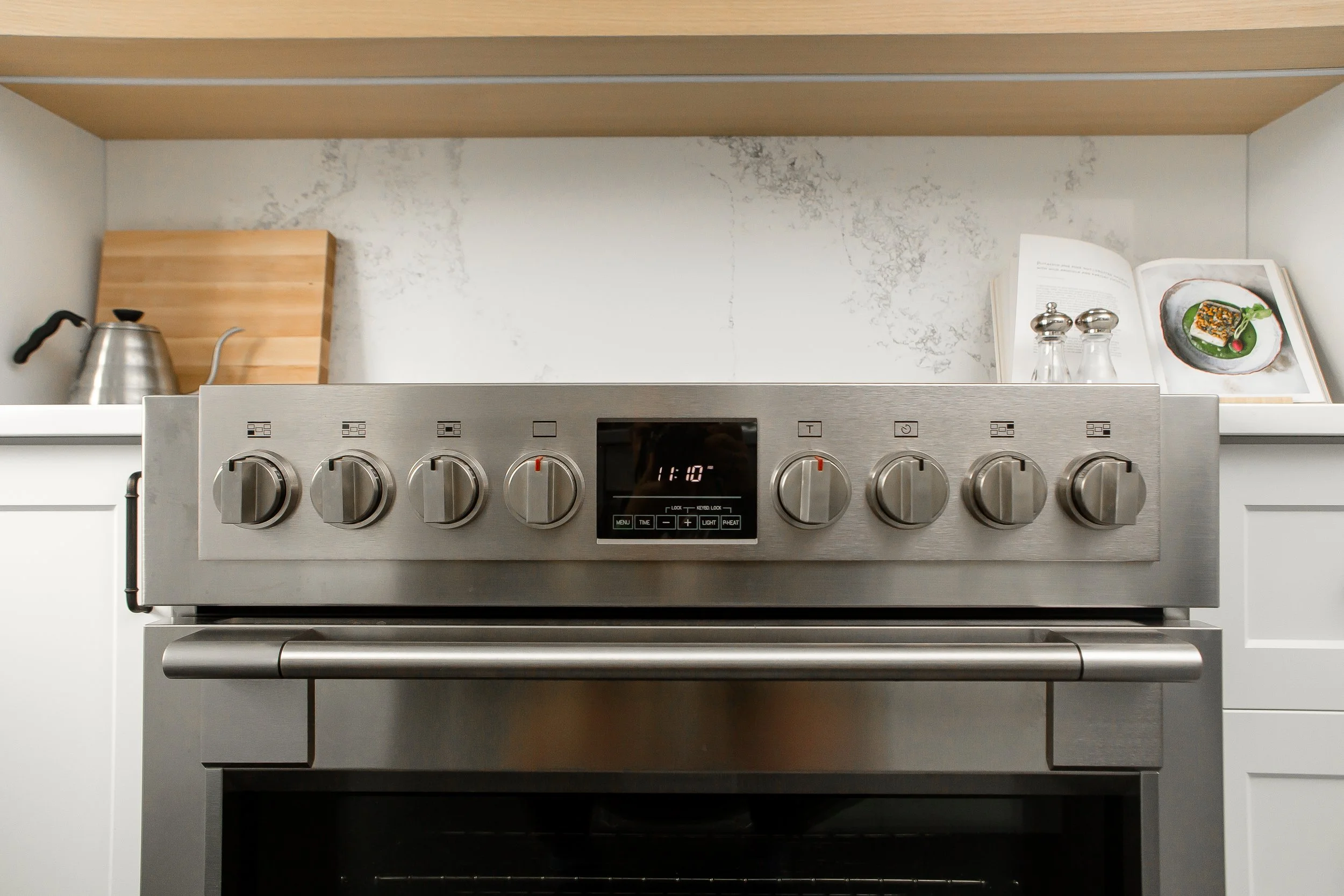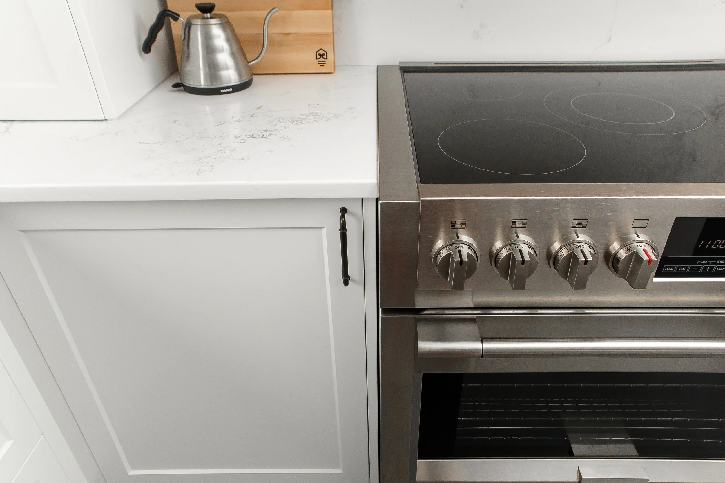 We went with a 36” induction range and carried the quartz countertop up onto the wall behind. The space is accented by more touches of wood in the floating shelf and range hood trim above.