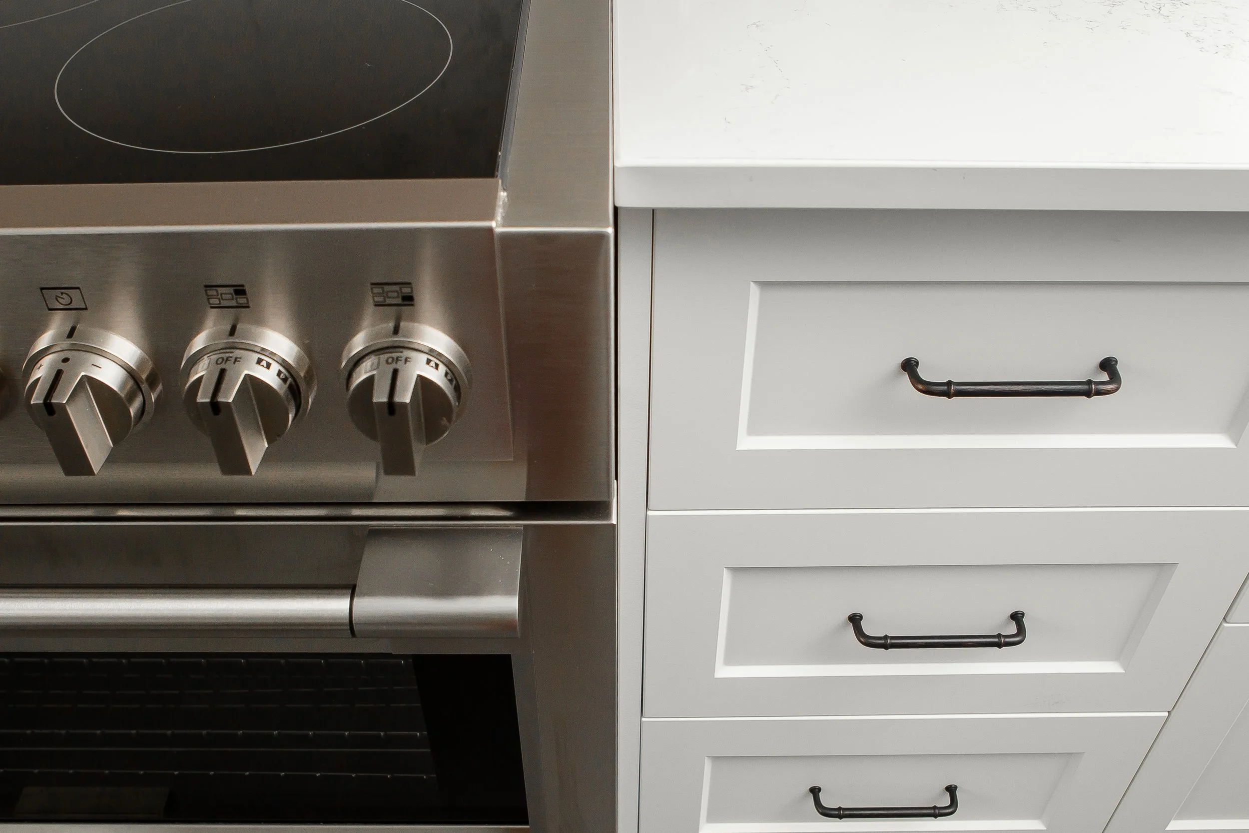 We utilized pull out shelving to the left of the range and a full set of drawers for all the cooking utensils on the right.