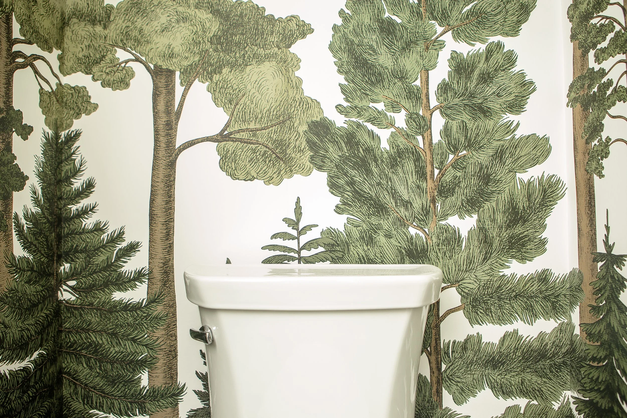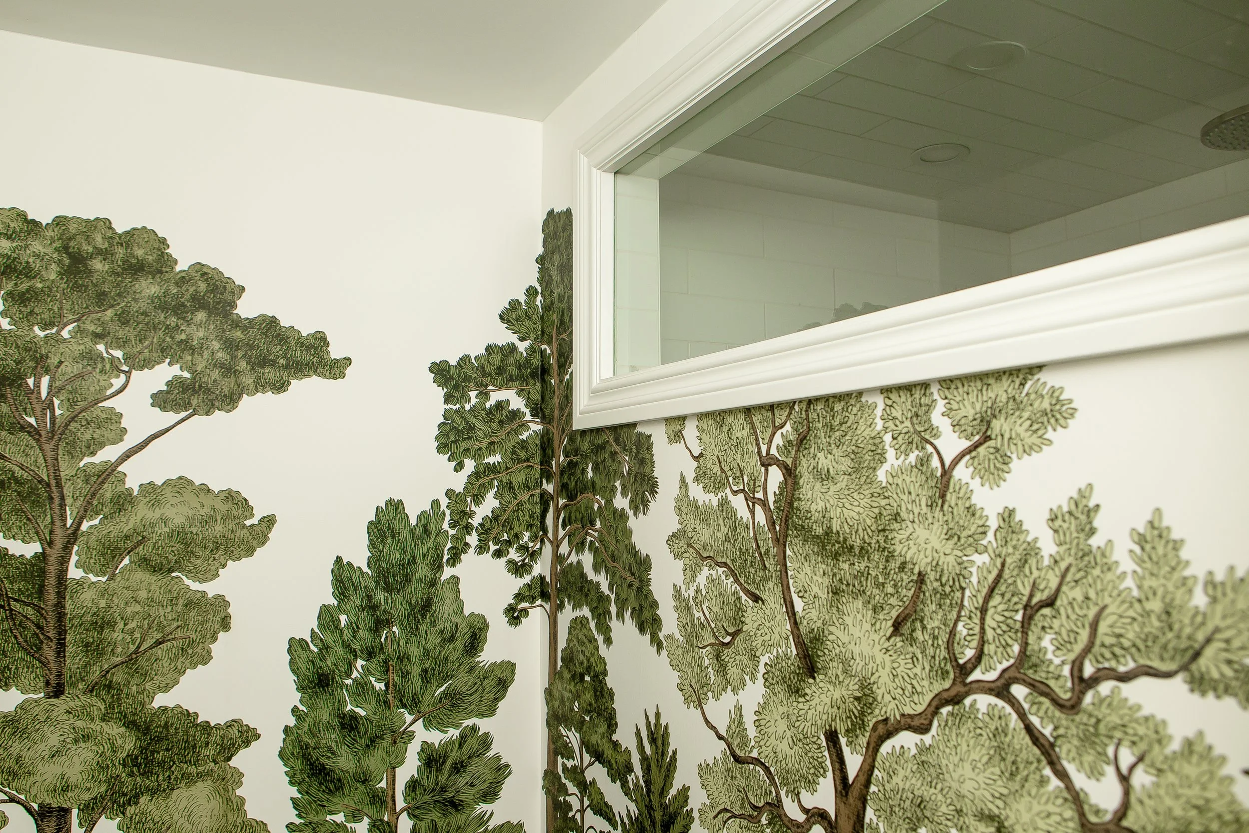 As a way to continue the view of their tree-filled yard into the space, we chose this tree-filled wallpaper for the water closet. And since we wanted to maximize the natural light that does come into this space, we also added a window between the water closet and walk-in shower to carry that light through while still maintaining privacy.