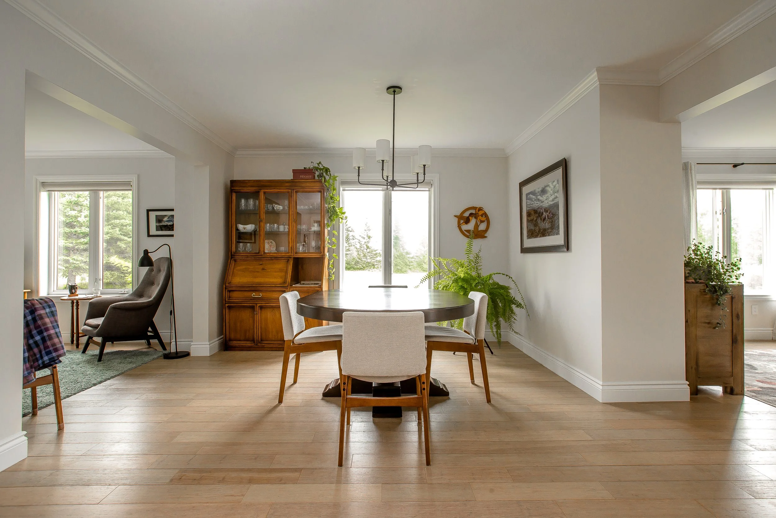 In the dining room, the existing hutch found a new home and we added a new dining table, chairs and lighting to work with the space. The round table was better suited to the layout of the dining room and allows for expansion when guests come to visit!