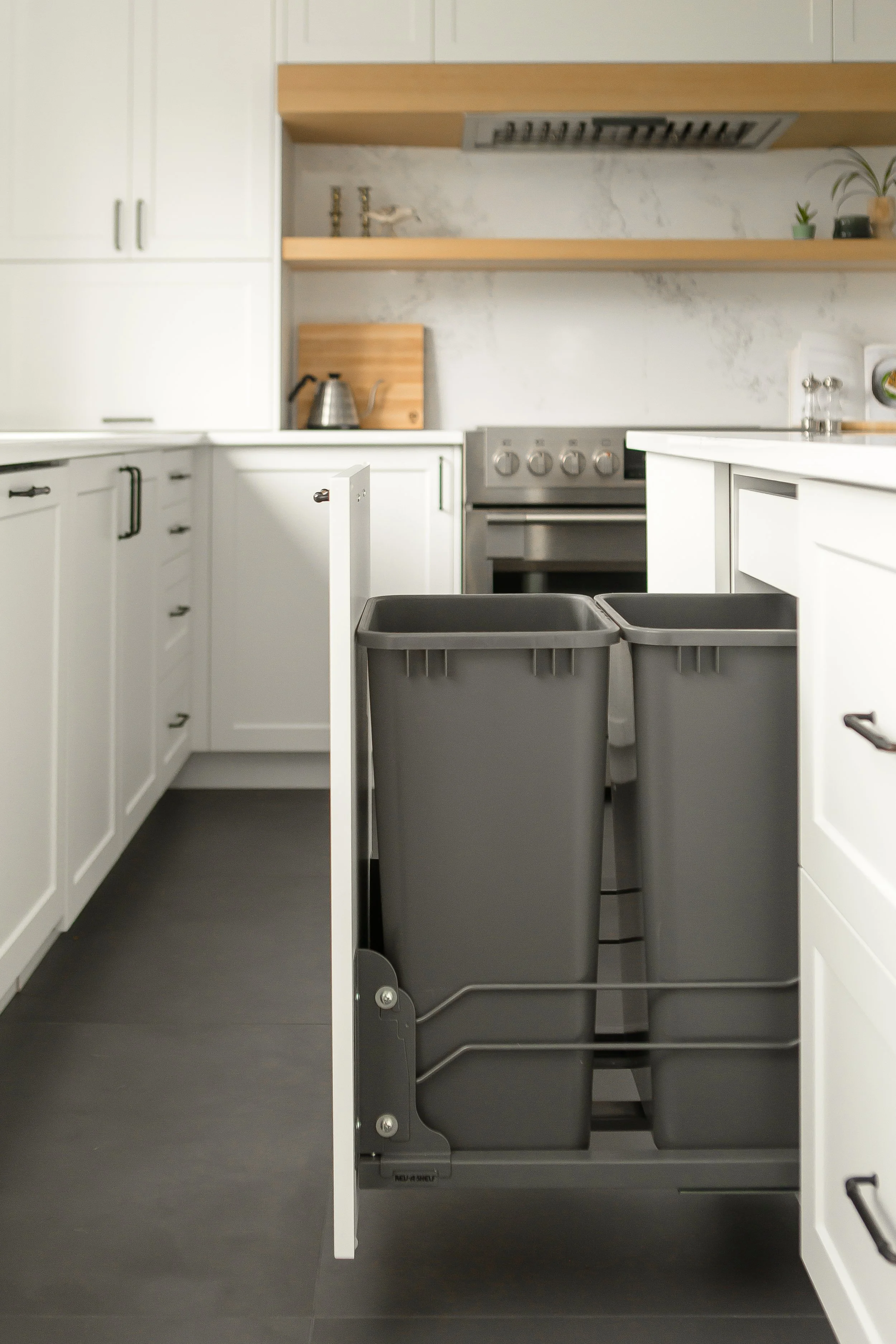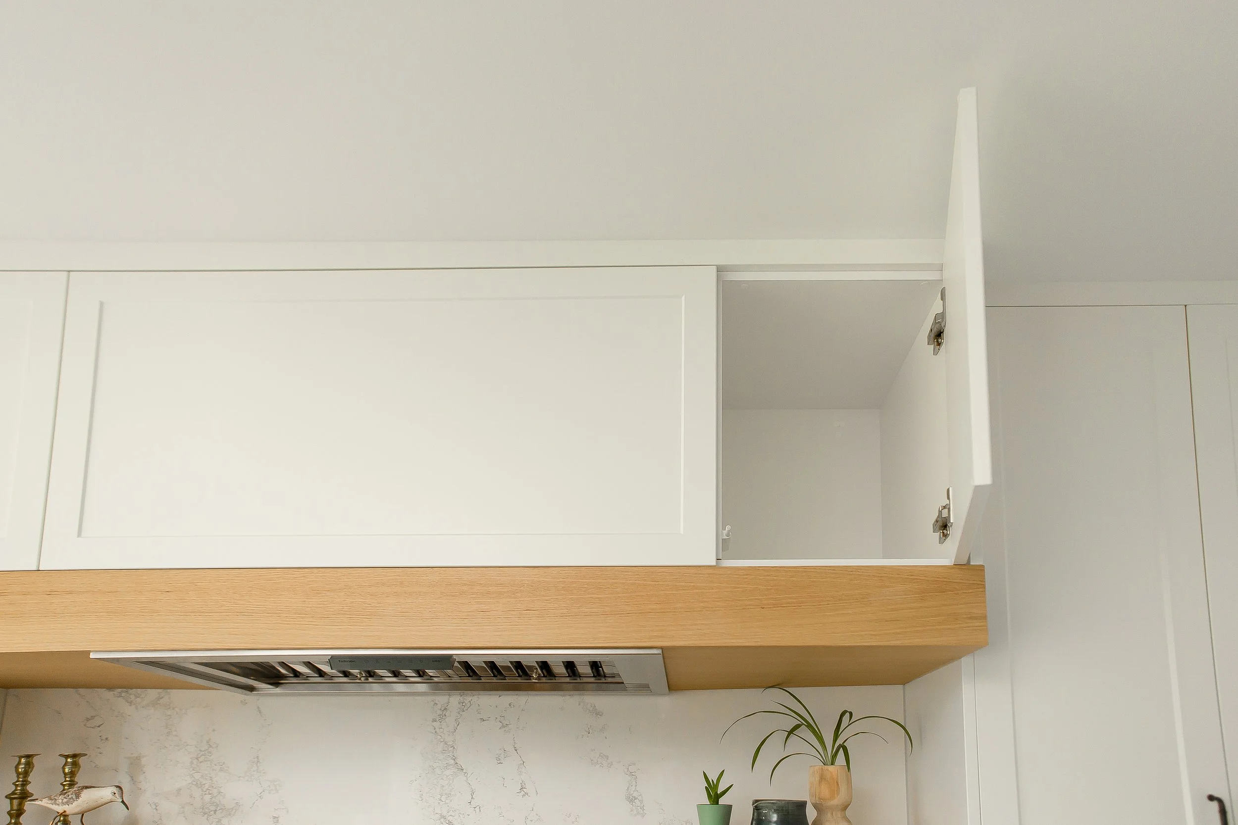 And since wasted space isn’t our jam, we ensured that the oversized range hood still had storage accessible within it too.