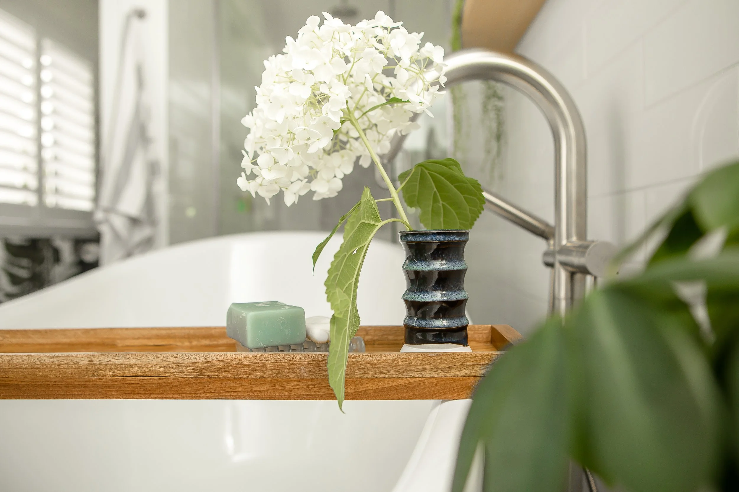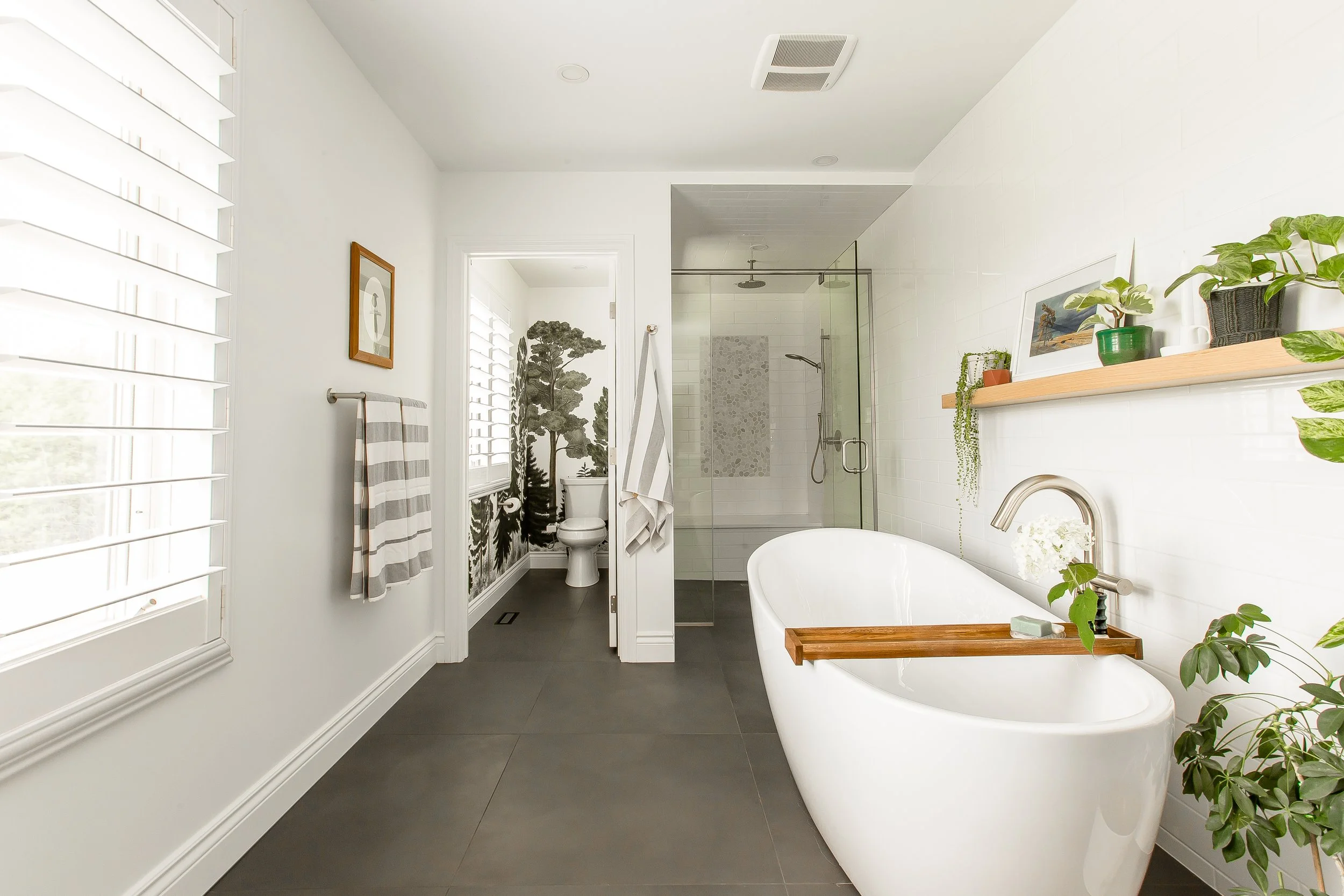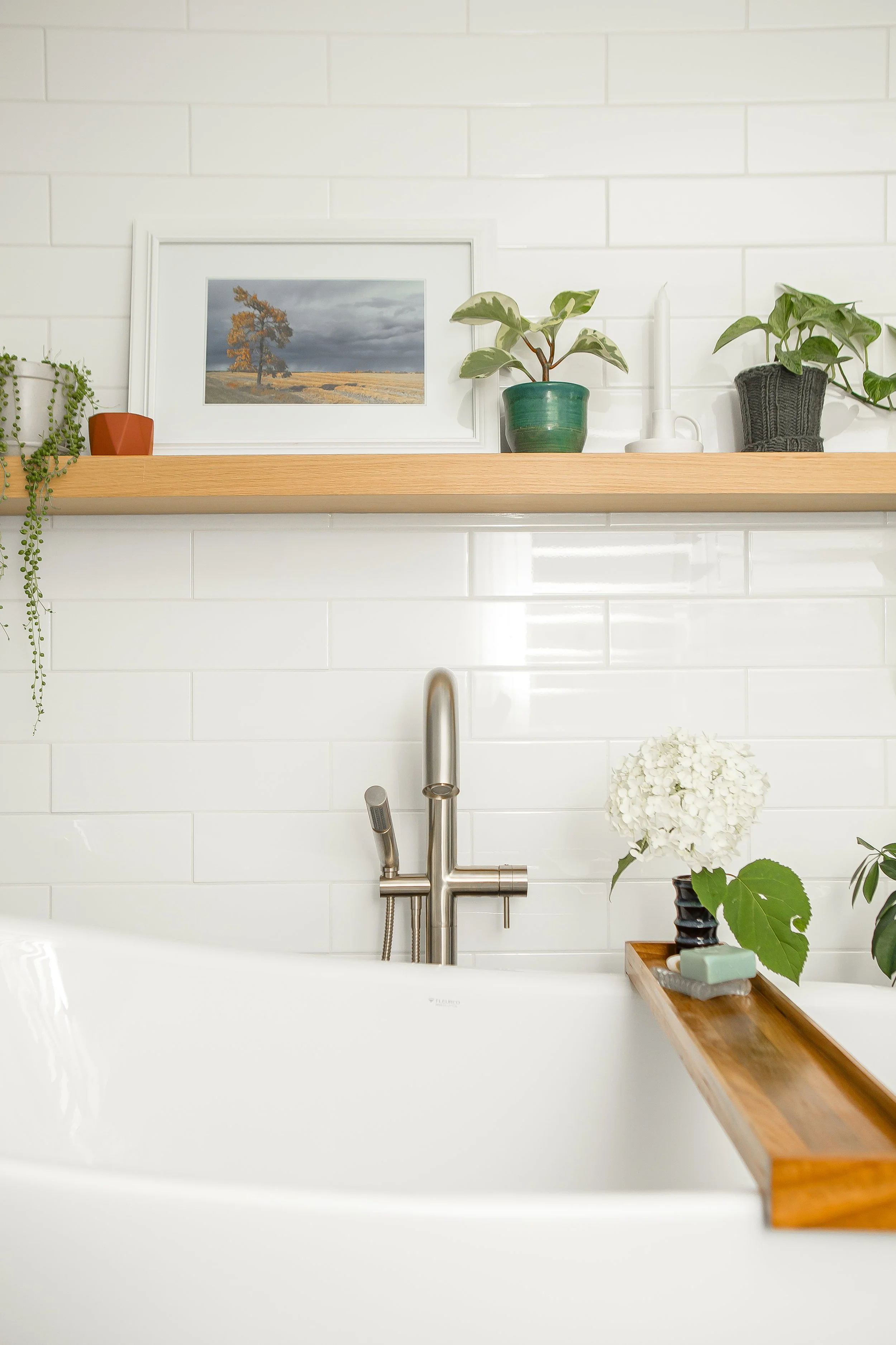 Above the tub is a custom wood floating shelf that acts as another spot for plants, decor and additional storage, breaking up the white tiled walls with extra warmth. And our clients already had the perfect art pieces to bring into the space as well, tying in the touches of wood and nature.