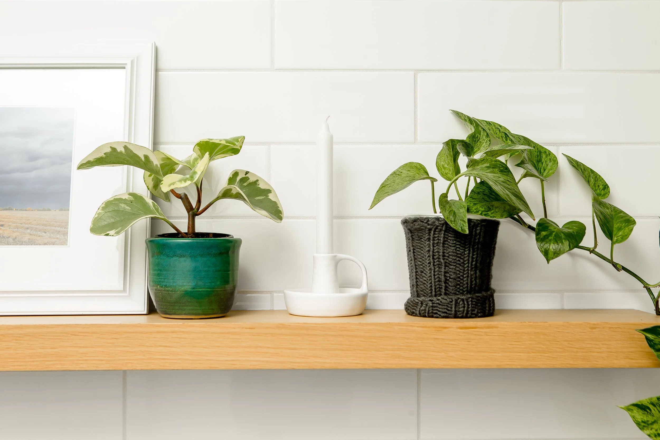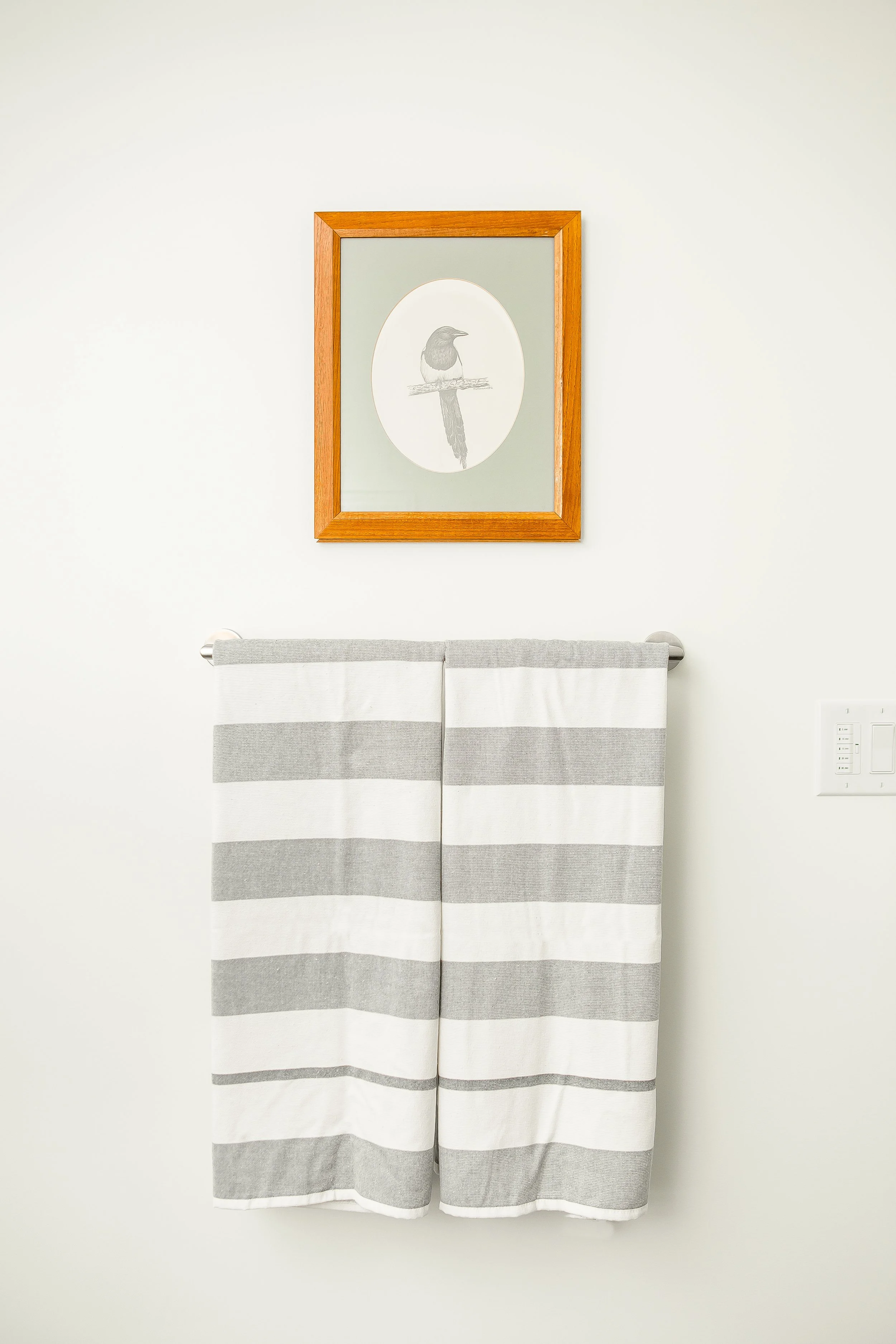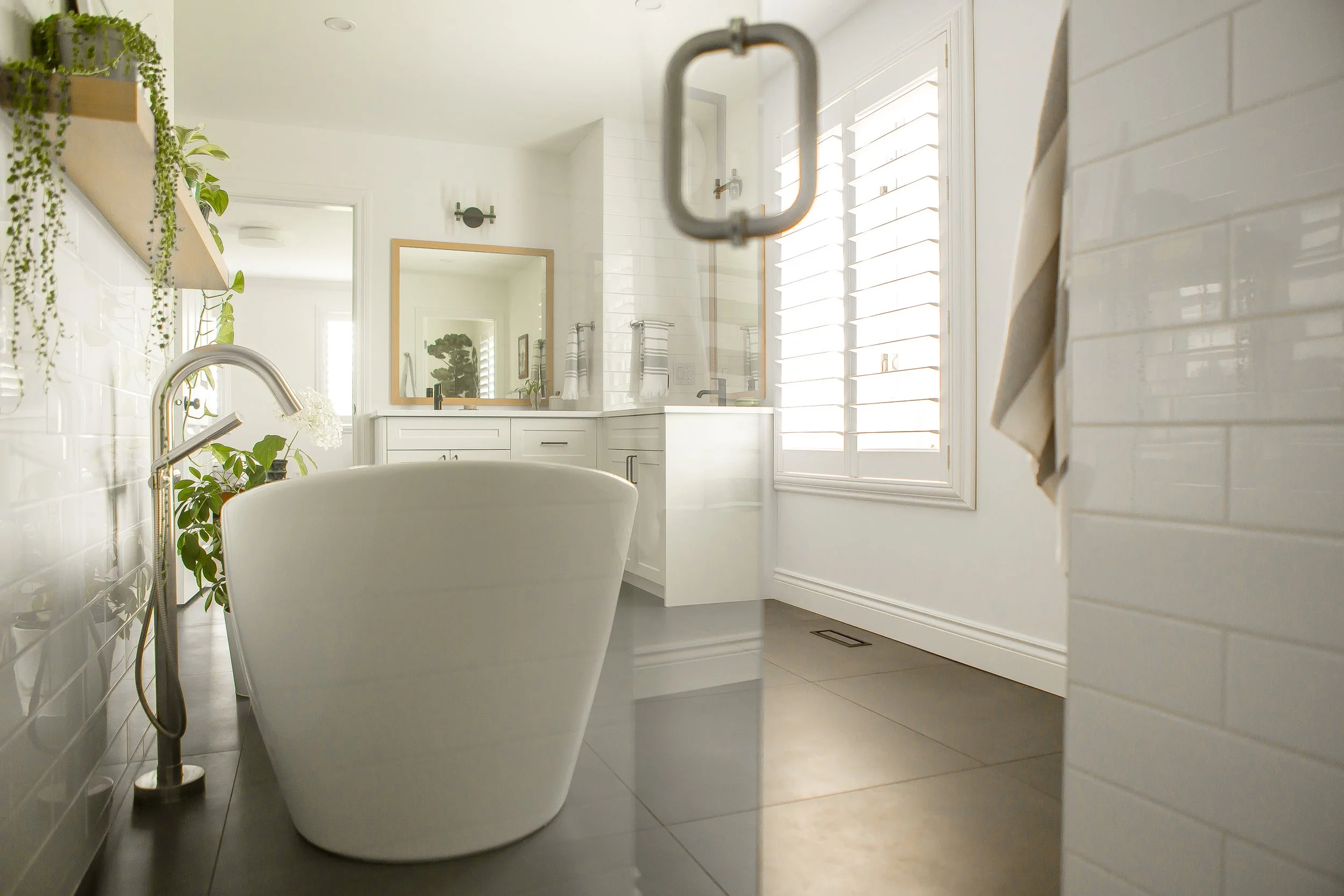 Above the tub is a custom wood floating shelf that acts as another spot for plants, decor and additional storage, breaking up the white tiled walls with extra warmth. And our clients already had the perfect art pieces to bring into the space as well, tying in the touches of wood and nature.
