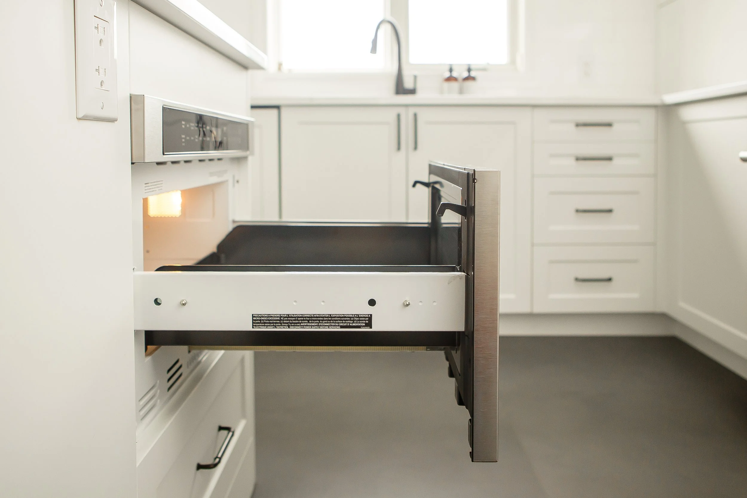 Across from the range, tucked into the island, is the microwave drawer, which is another one of our favourite ways to incorporate a microwave into the kitchen.