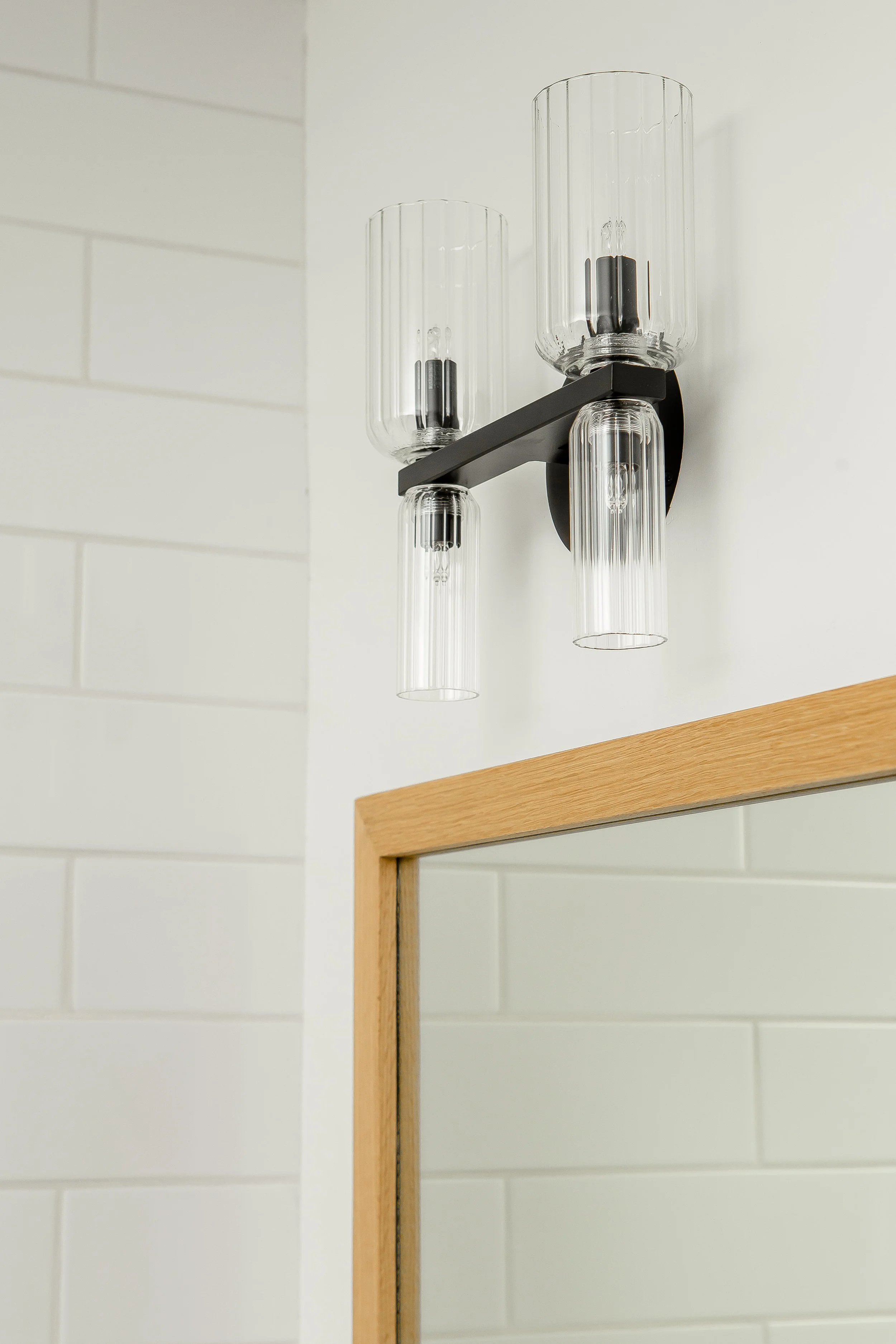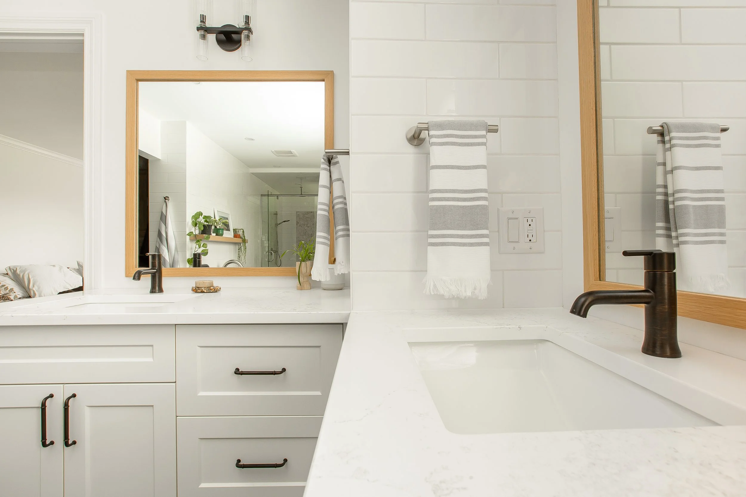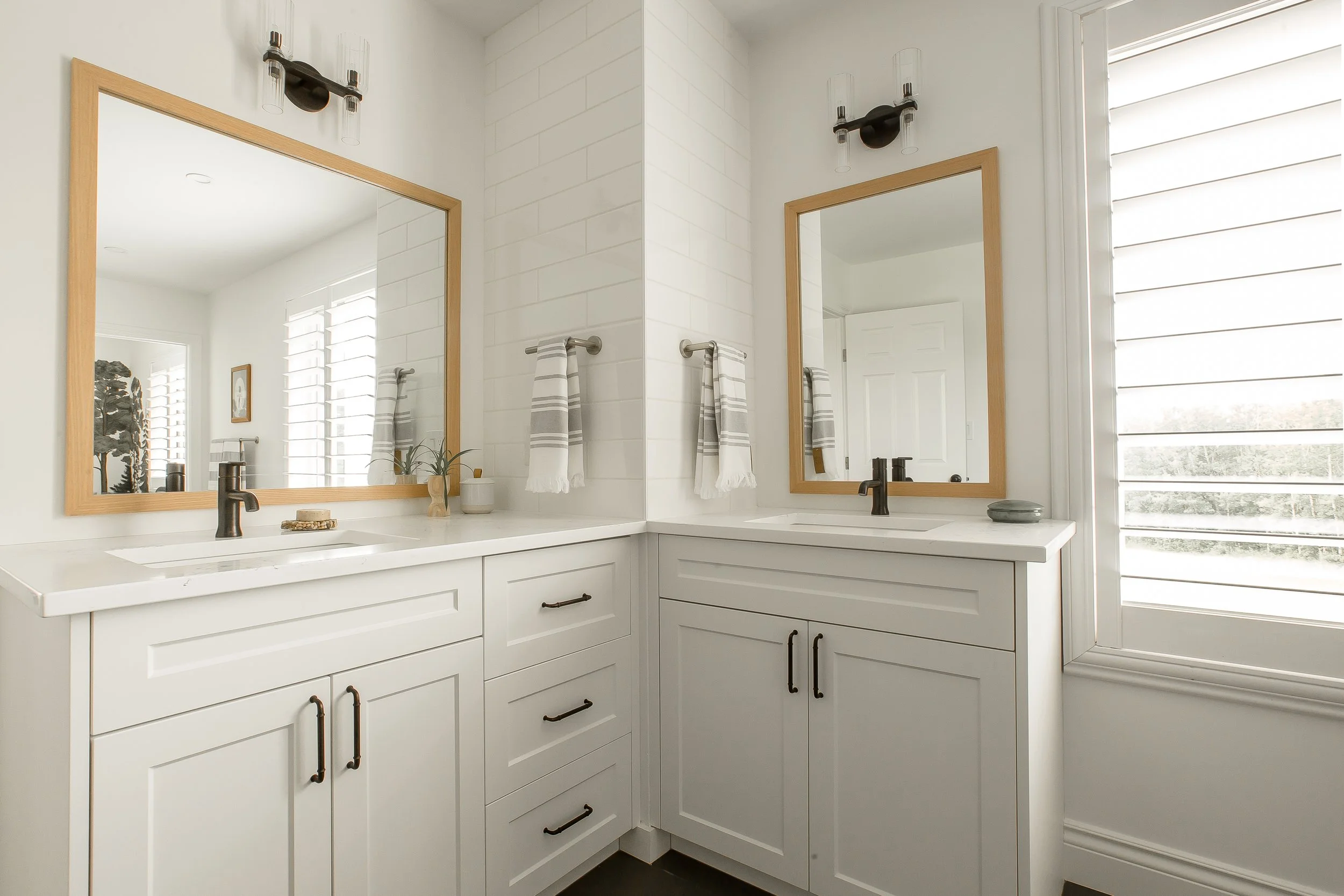 The wood framed mirrors were custom made to match the other wood elements of the space, bringing in added warmth and that touch of nature from outside. We also paired the bronze faucets and handles with black light fixtures and brushed nickel shower and tub fixtures.