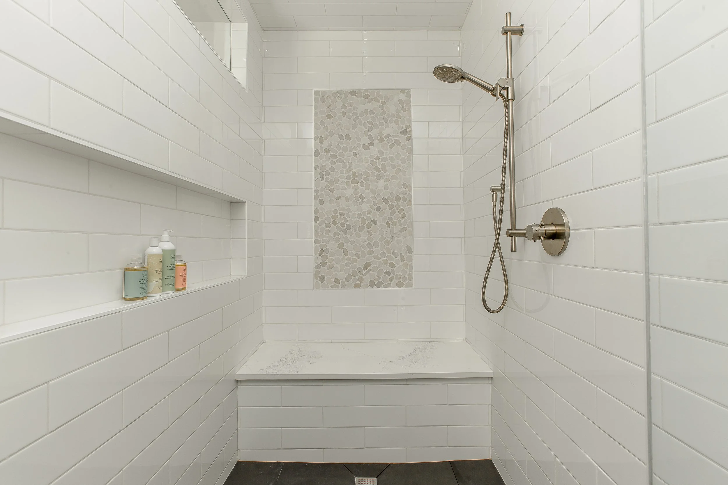 The shower features a large niche and quartz-topped bench alongside the rain shower and separate hand held. Our clients opted for another little touch of nature with a pebble tile feature.