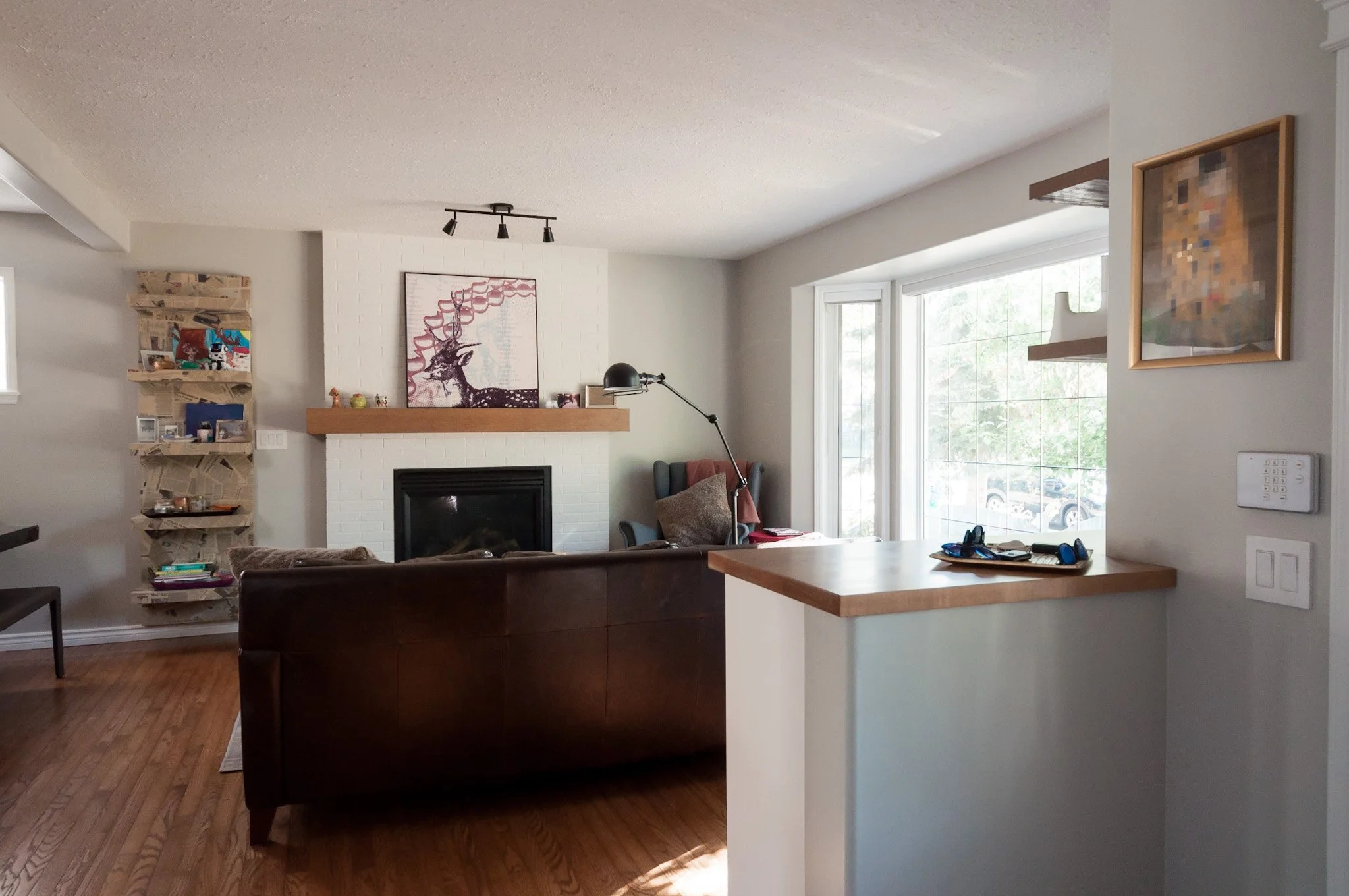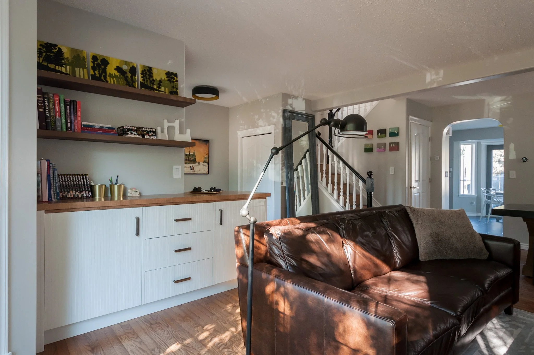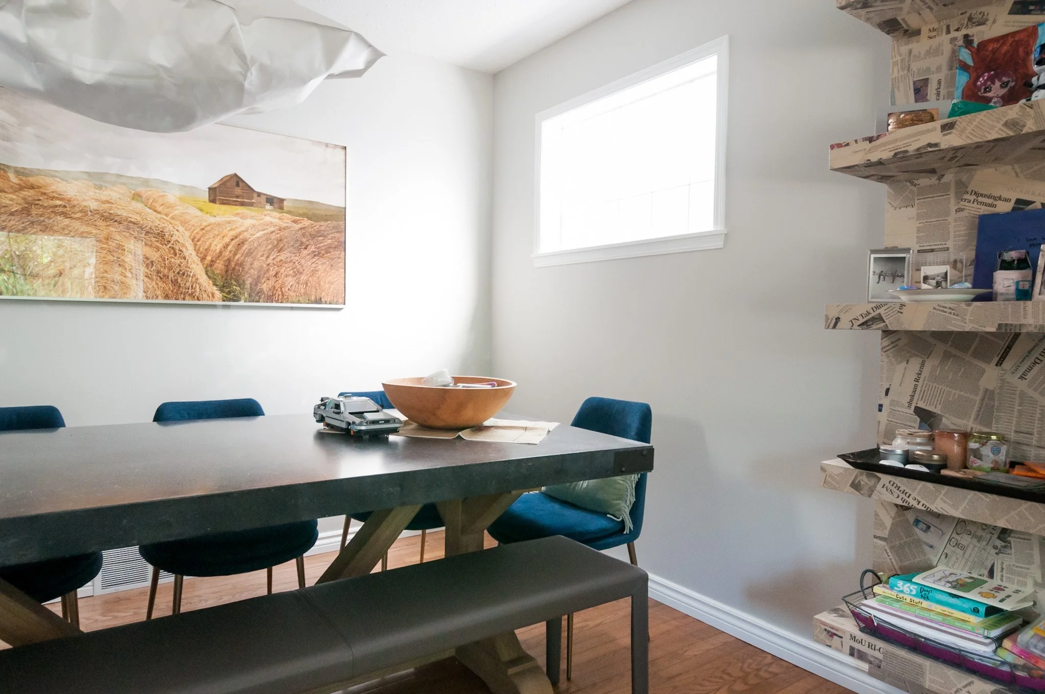 The living room (and technically also the dining room) space wasn’t quite functioning to its full potential. Storage was an issue, as our clients are always creating and crafting, but it was important that this storage felt purposeful and looked good in the space. The fireplace was feeling dated and didn’t match their style and vibe, so it was added to the list. Finally, we also replaced the existing dining chairs with new ones that add a pop of colour, as well as a bench to open it up a bit.