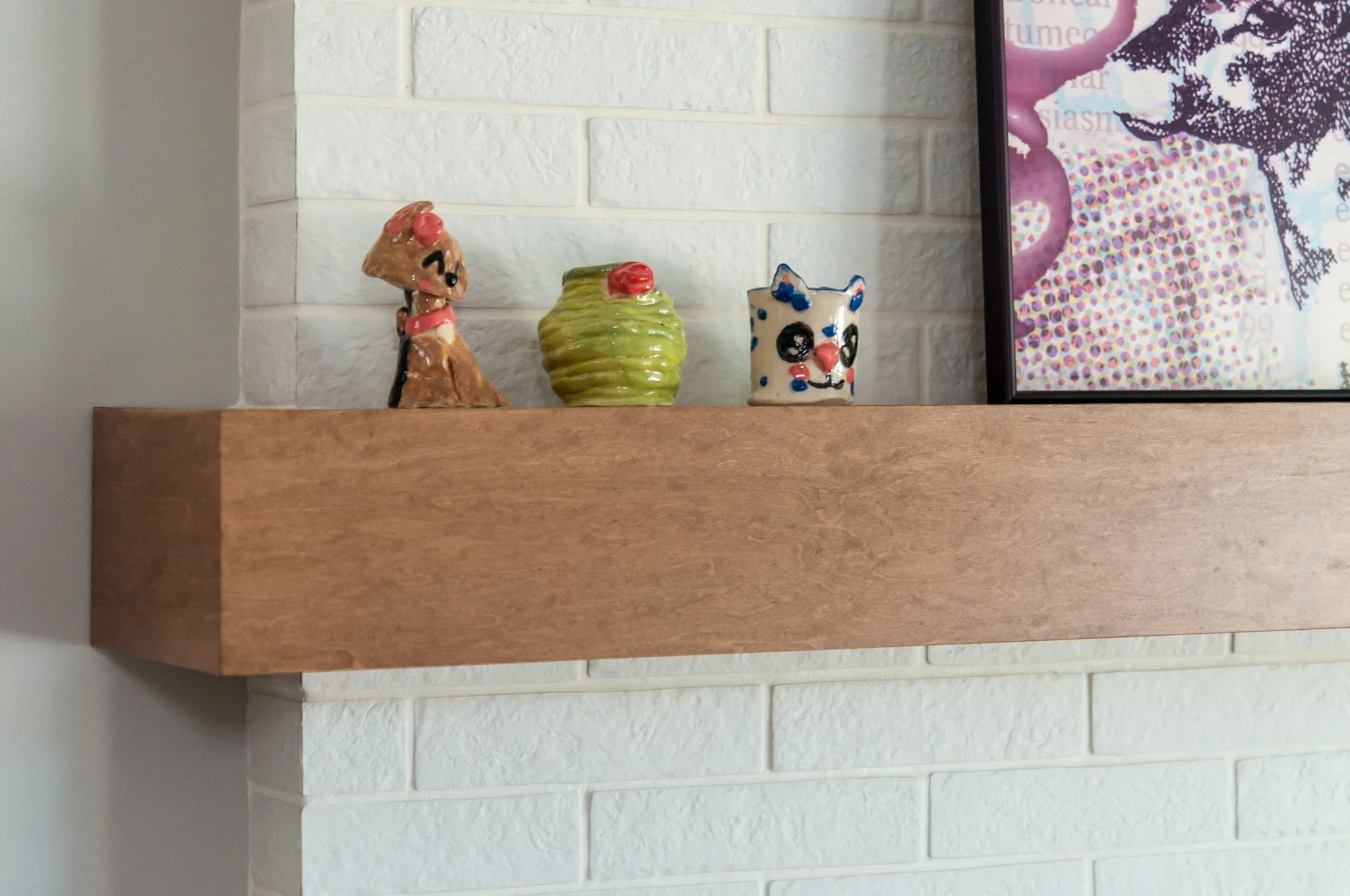 While we’ve used a brick tile, the mitres and layout give the impression of full bricks. The custom maple mantle still has space to display art and decor, but by incorporating the wall’s jut out into the overall fireplace, it again provides a more seamless look.